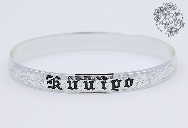 ブラックエナメルの文字がシルバーのバングルに美しく映え、カジュアルからフォーマルまで幅広いシーンで活躍し、シンプルながらも存在感のあるアイテムです。自分へのご褒美としてはもちろん、大切な人へのギフトにも最適な、永遠の愛と幸運を込めたハワイアンジュエリーの逸品です。