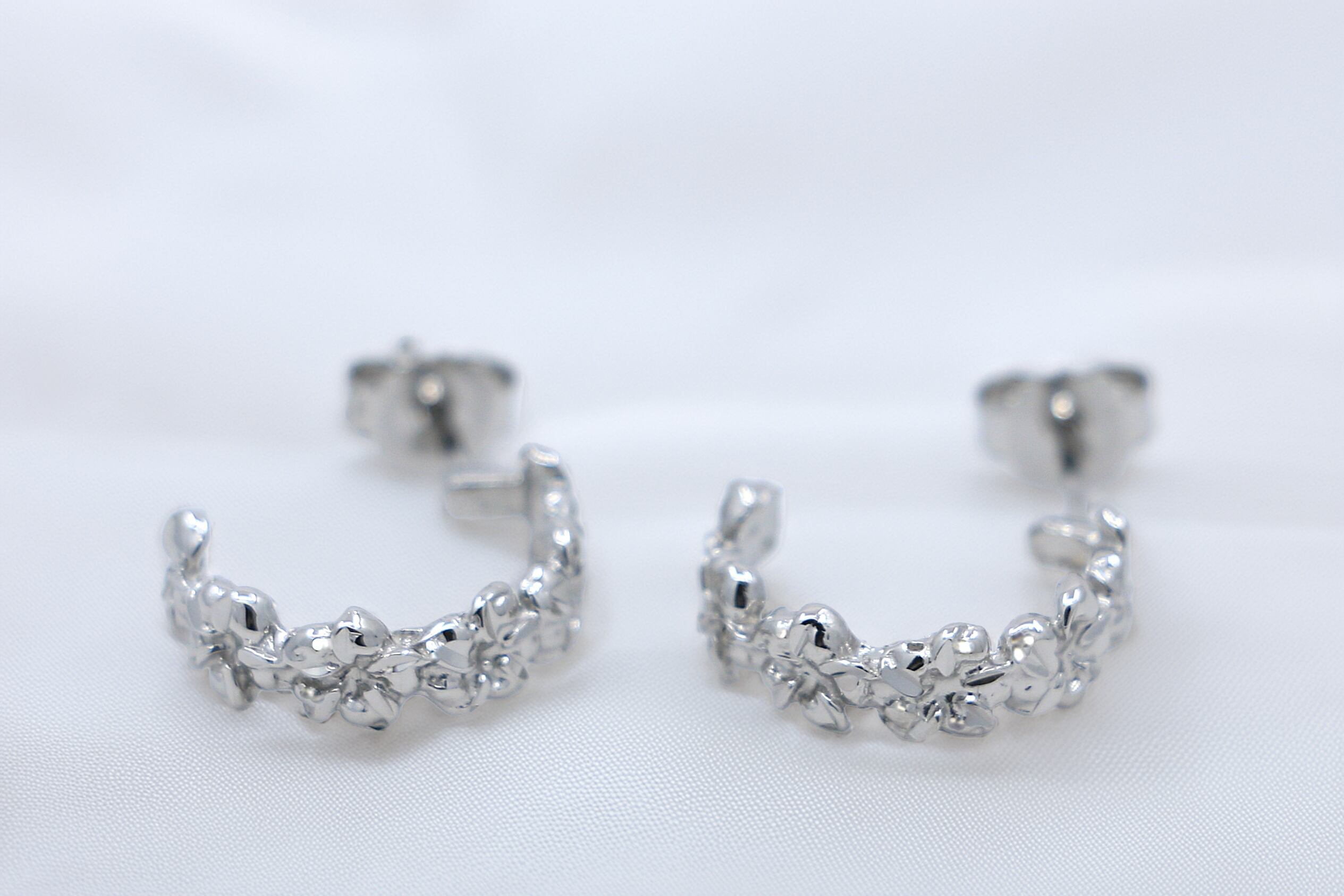 このピアスの特徴的なデザインは、プルメリアの花が連なる形です。プルメリアは、ハワイの象徴的な花であり、愛、友情、幸福、平和を象徴しています。花が連なっているデザインは、つながりや絆、永続的な愛を意味し、非常に感動的で美しいシンボルとなります。プルメリアの花が華やかに並んでいることで、ピアス全体に柔らかな動きと立体感を与え、耳元で美しい輝きを放ちます。