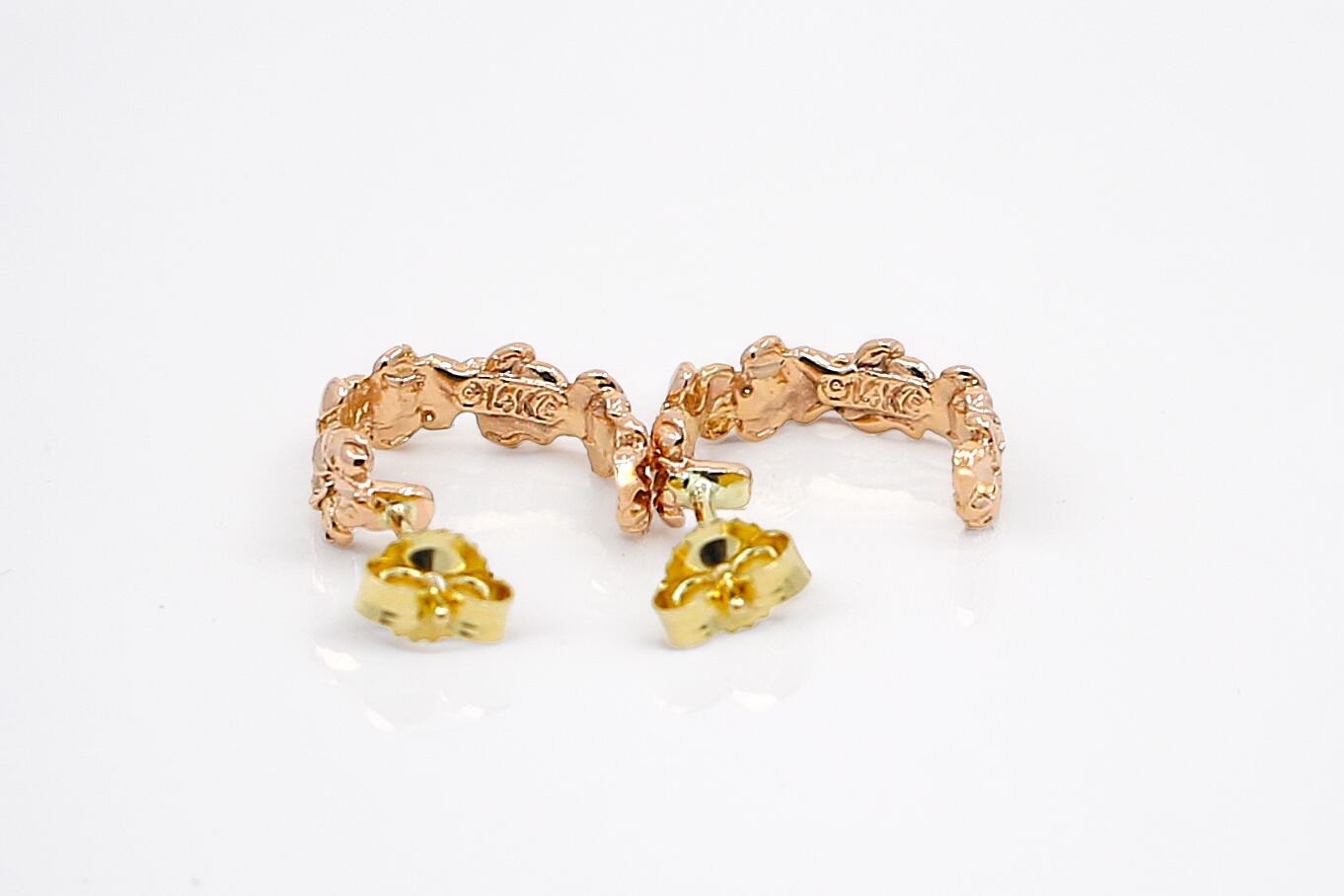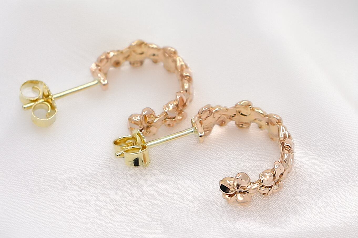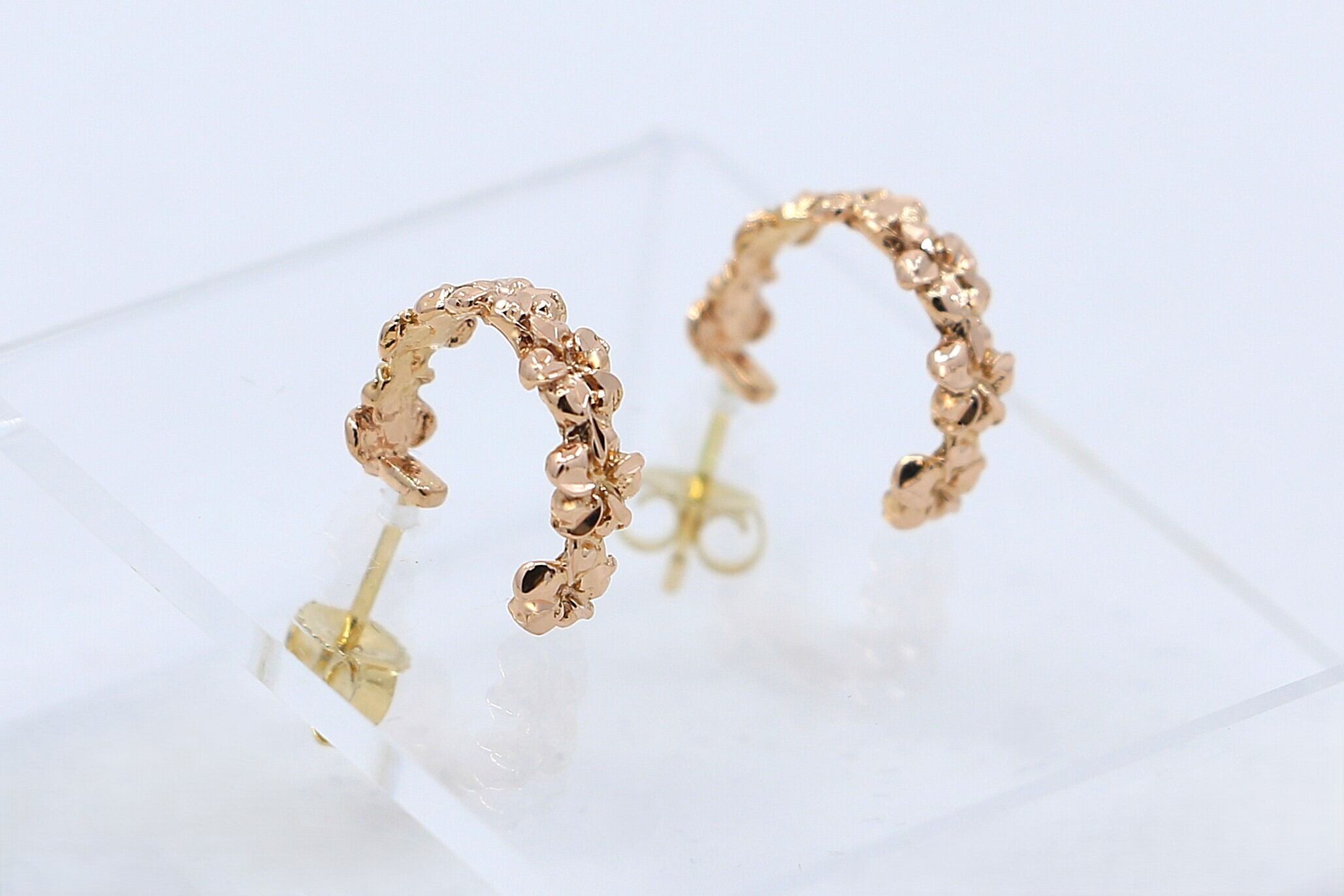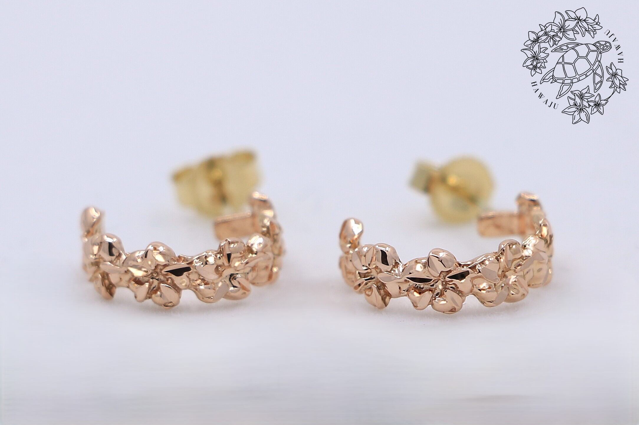 この14Kピンクゴールドピアスは、ハワイの自然を象徴するプルメリアの花が連なる美しいデザインが特徴的な、優雅で女性らしいハワイアンジュエリーです。柔らかなピンクゴールドの輝きと、繊細なプルメリアの花々が耳元を華やかに演出します。ポストタイプのデザインは、シンプルでありながら存在感があり、デイリーから特別な日まで、幅広いシーンで活躍するアイテムです。