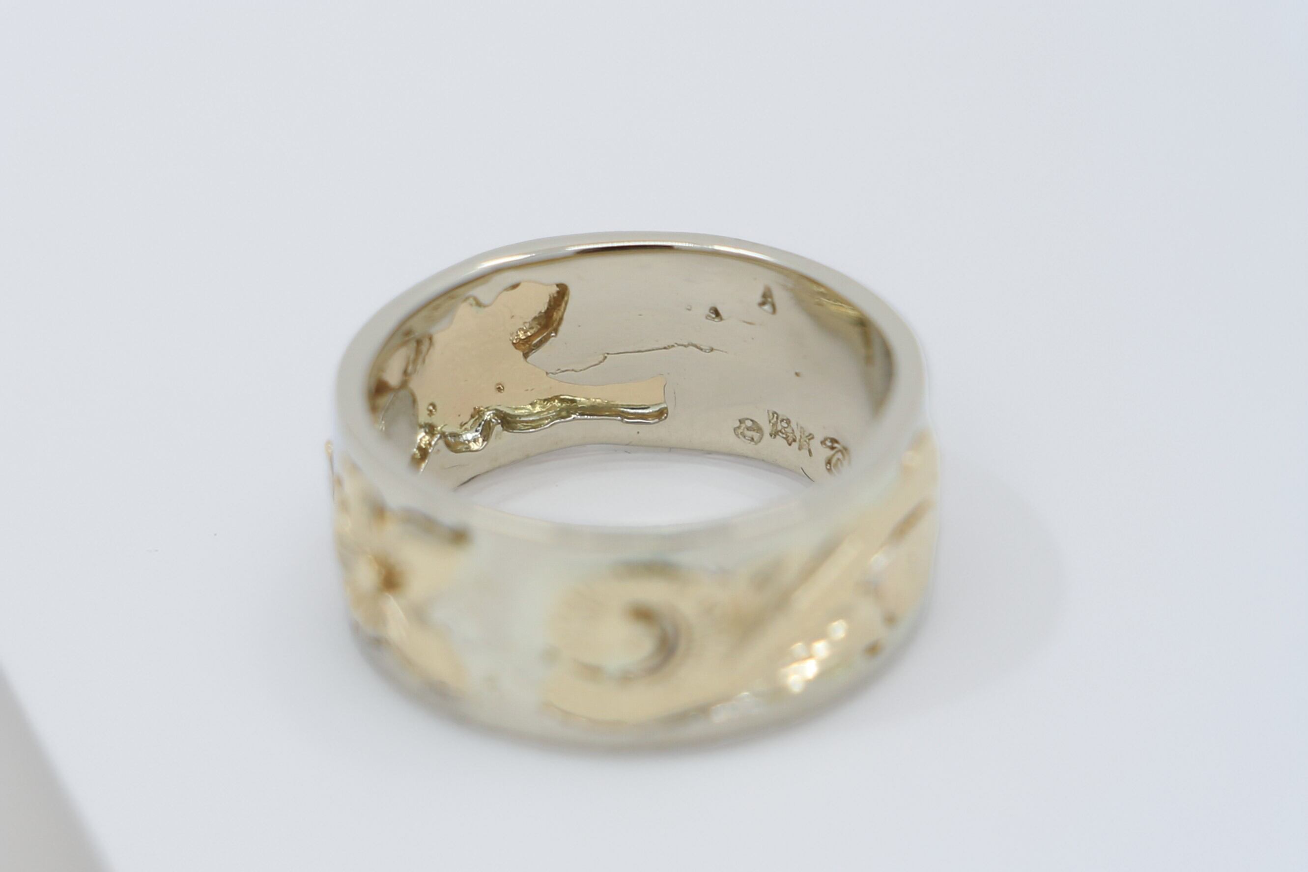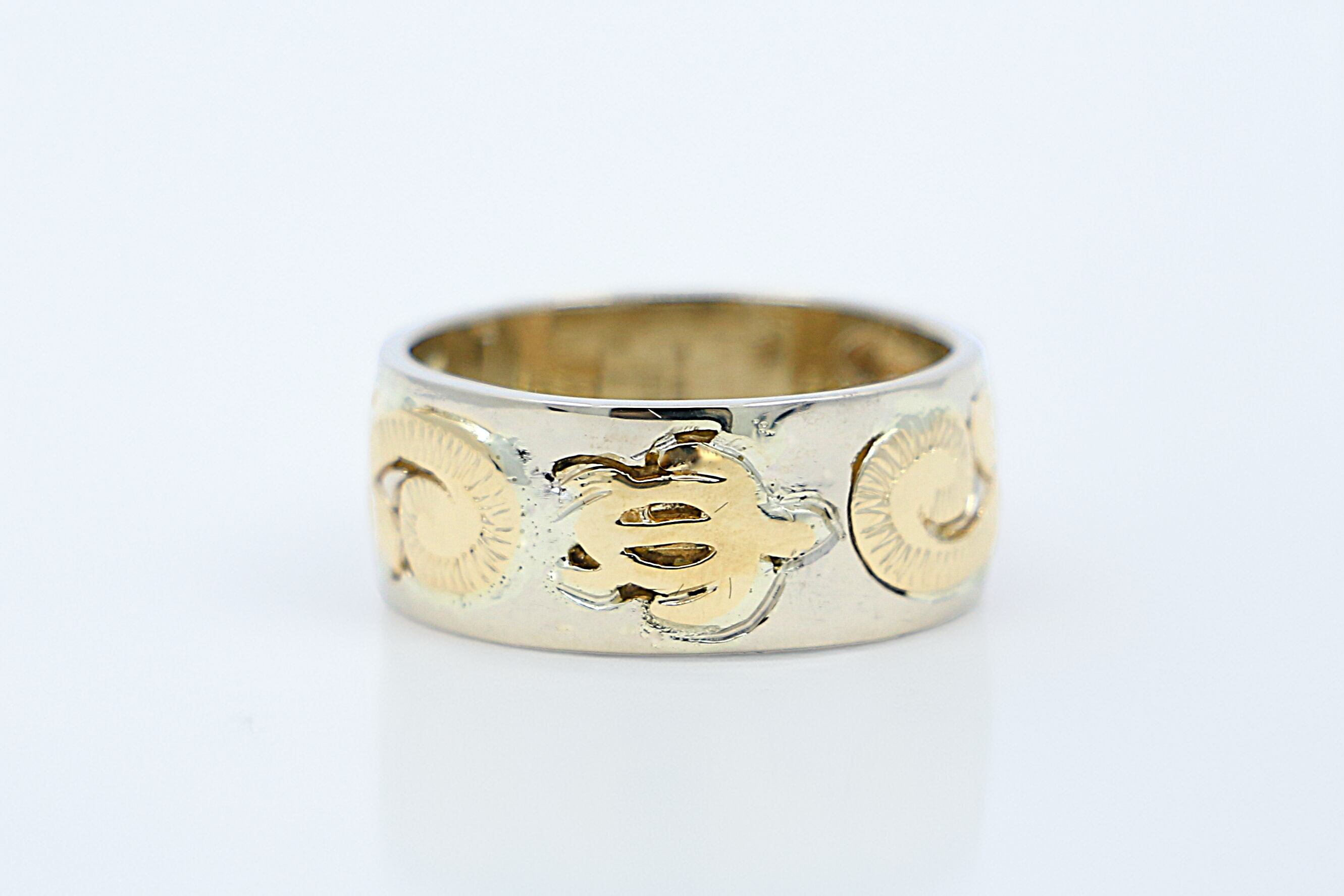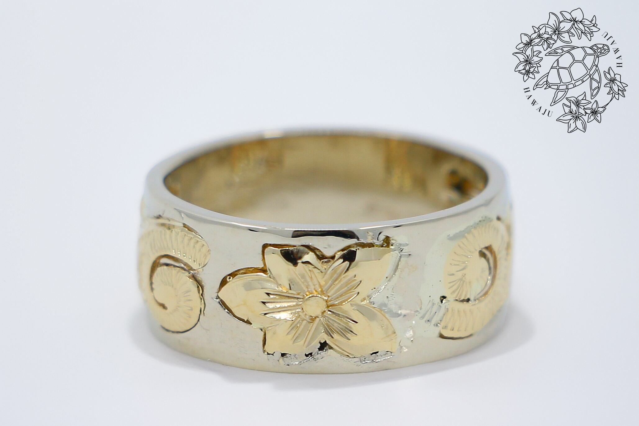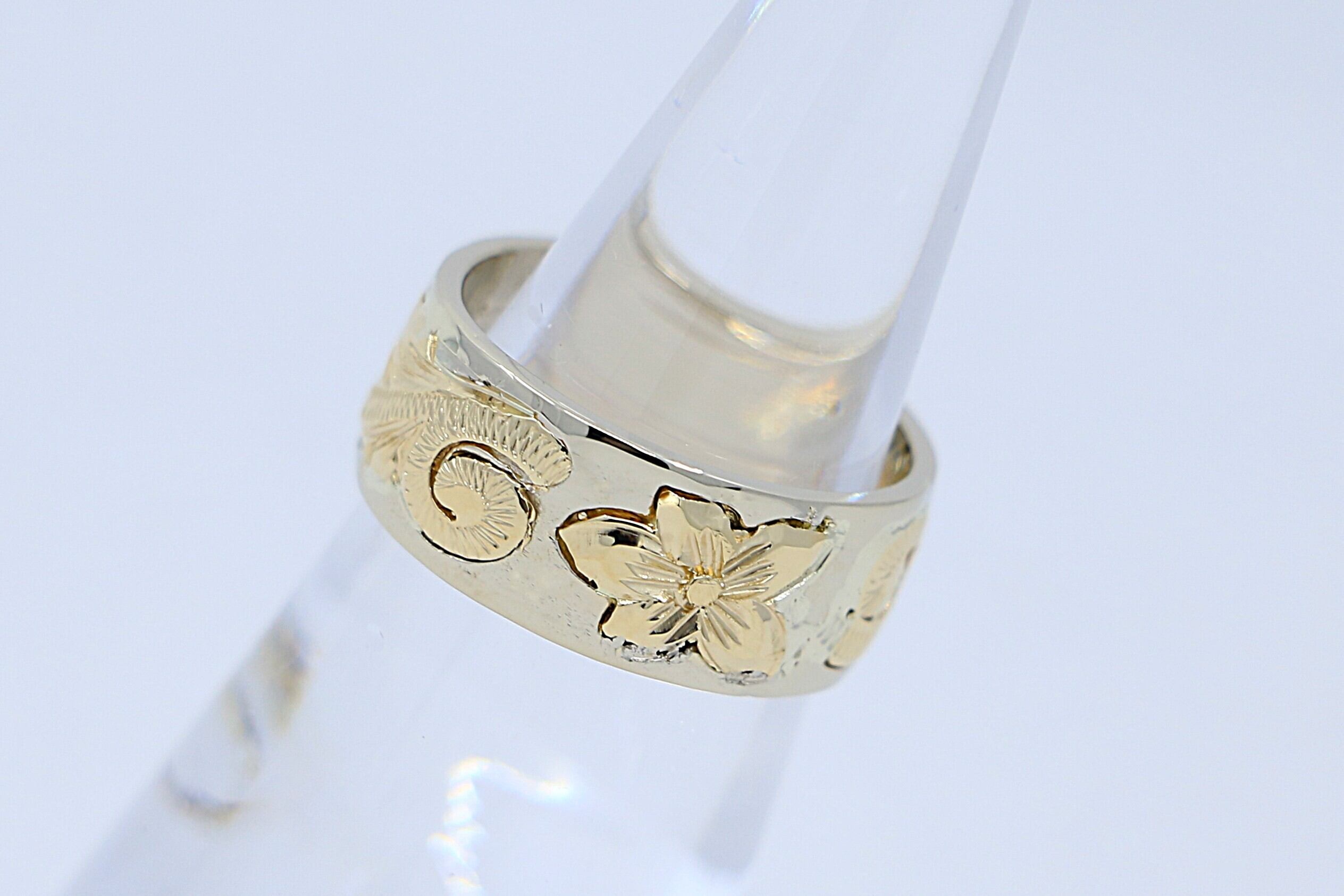 14Kホワイトゴールドにイエローゴールドのホヌ(海亀)、プルメリア、スクロールといったハワイの自然と伝統を象徴するデザインが、繊細に施された幅広のハワイアンジュエリーリングです。幸運や長寿を象徴するモチーフとゴールドの美しいコントラストが指元を華やかに演出し、大切な人へのギフトや自分へのご褒美に最適な逸品です。