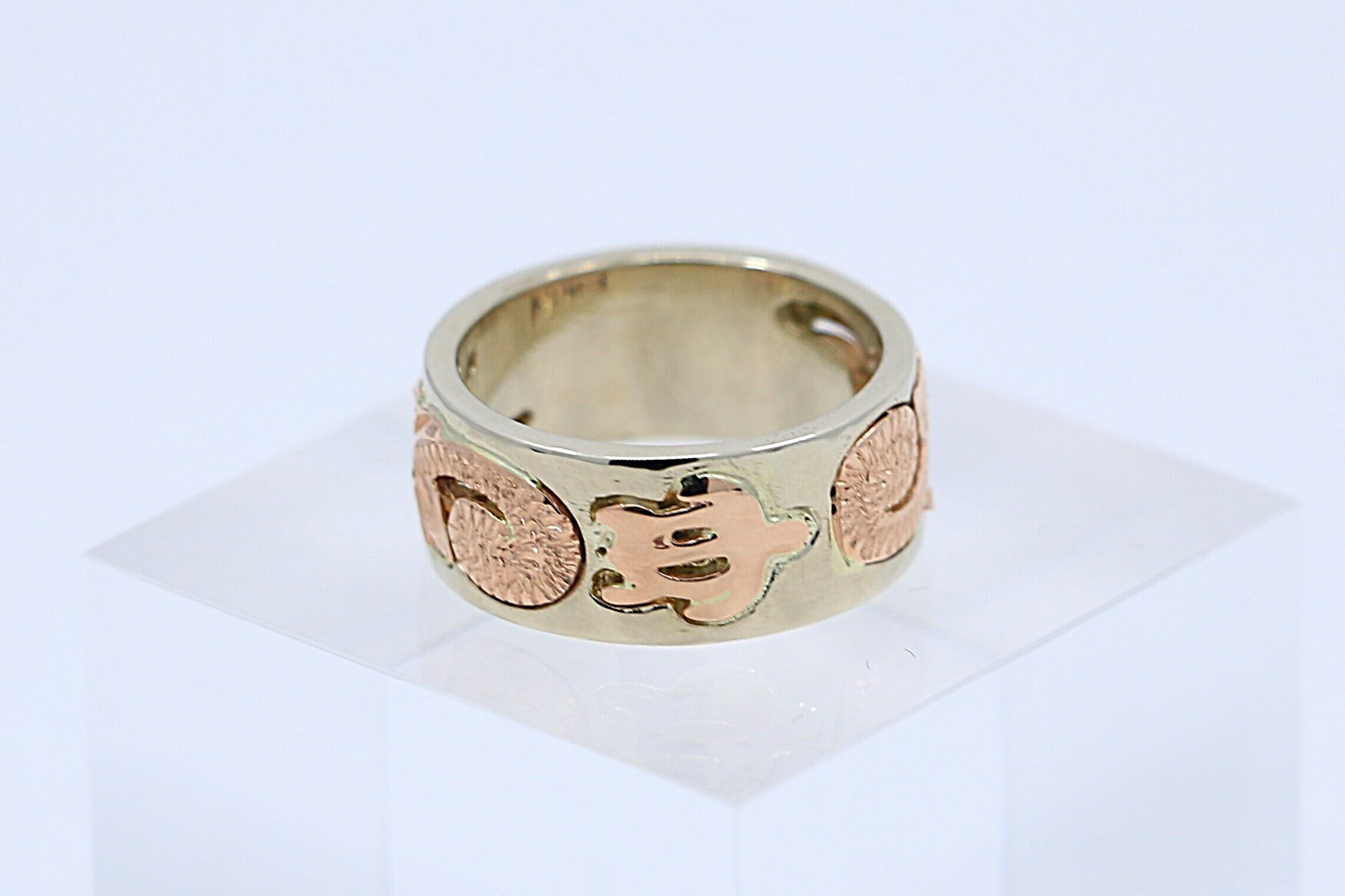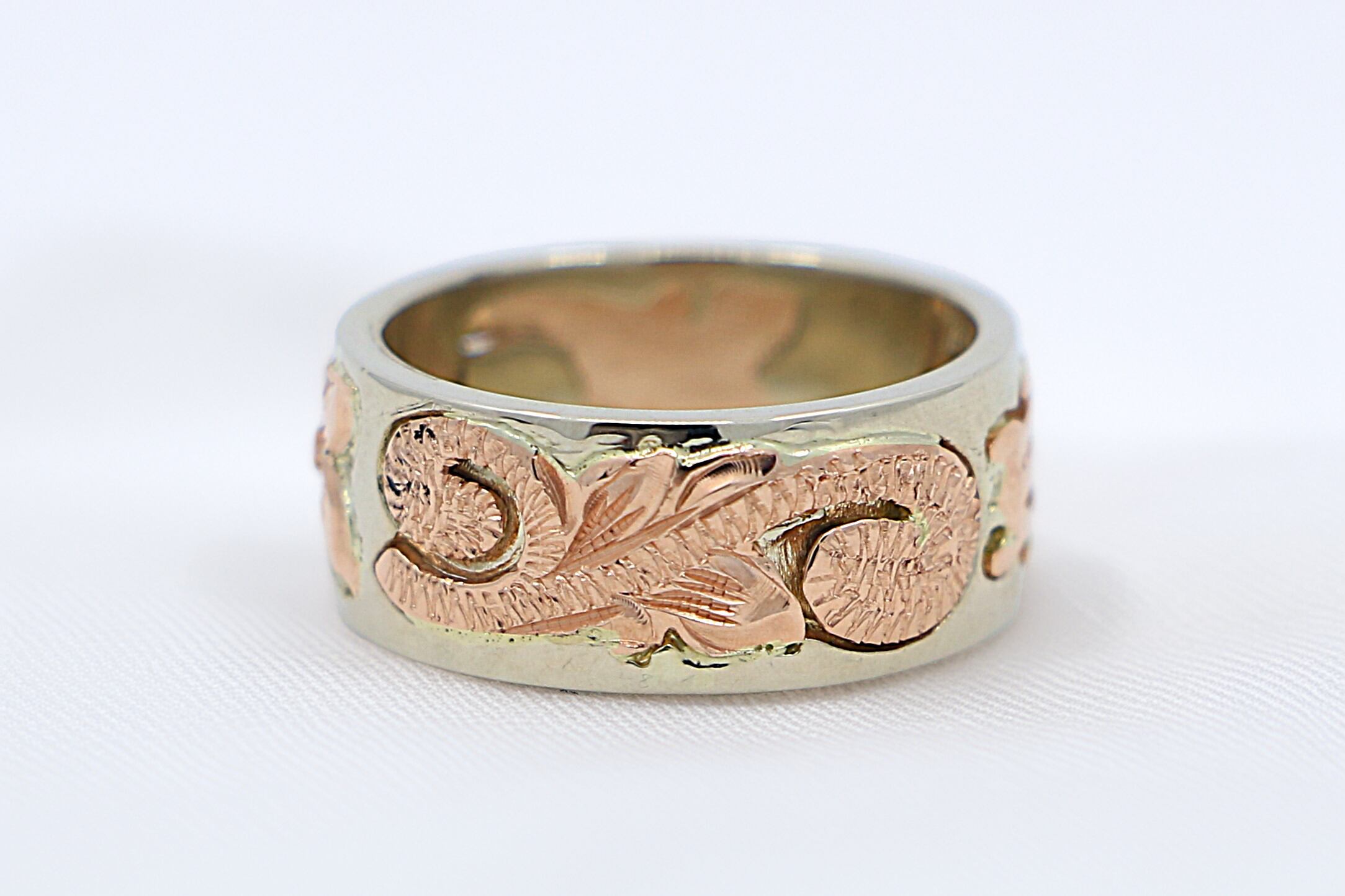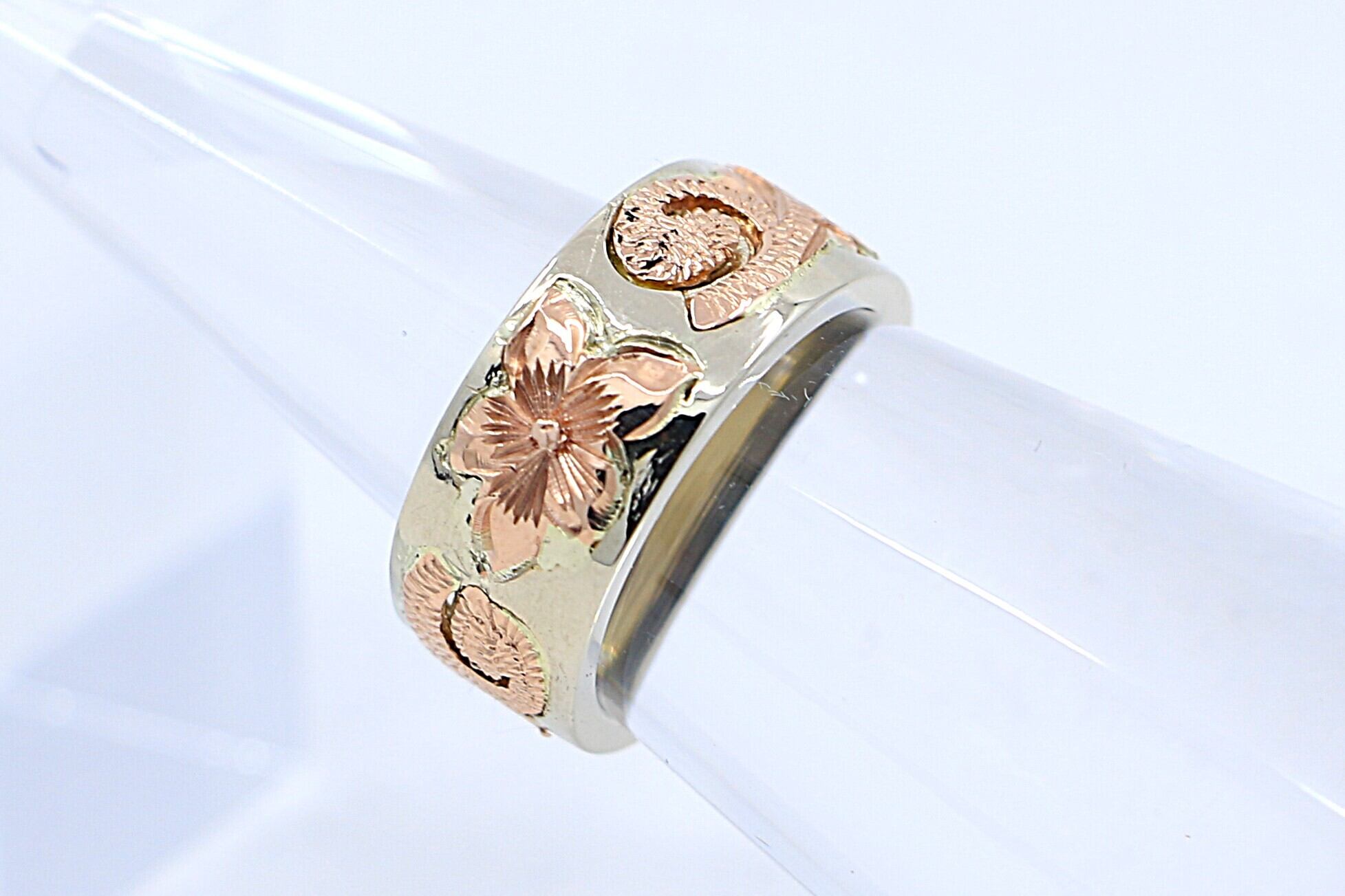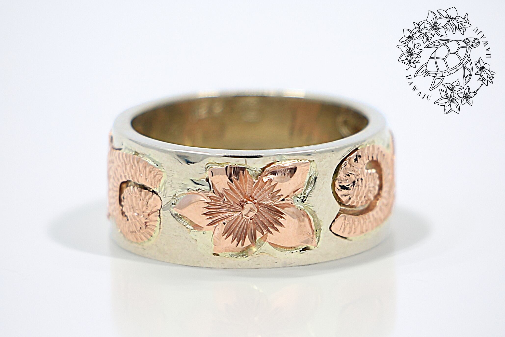 14Kホワイトゴールドにピンクゴールドのホヌ(海亀)、プルメリア、スクロールといったハワイの自然と伝統を象徴するデザインが、繊細に施された幅広のハワイアンジュエリーリングです。幸運や長寿を象徴するモチーフとゴールドの美しいコントラストが指元を華やかに演出し、大切な人へのギフトや自分へのご褒美に最適な逸品です。