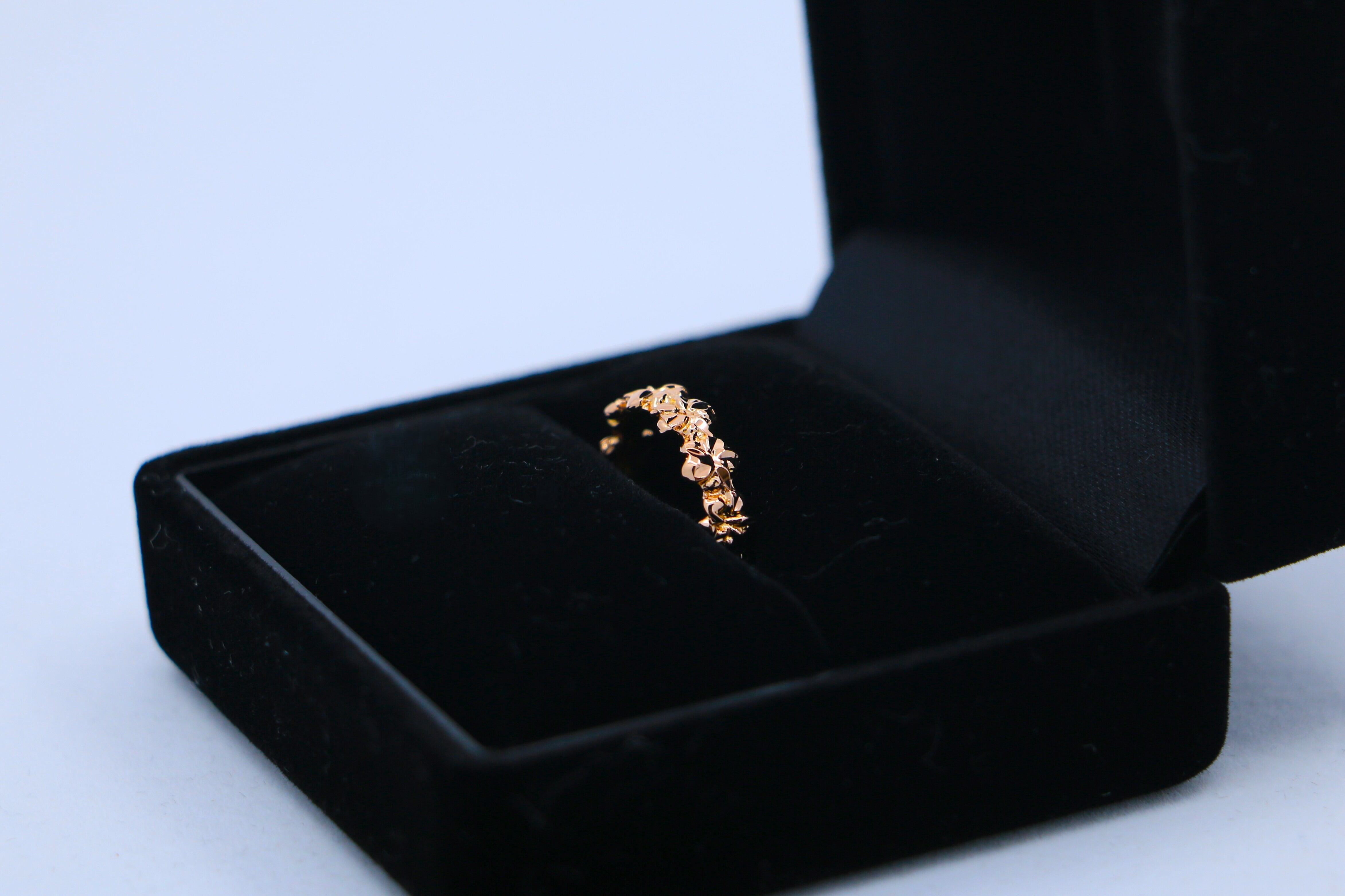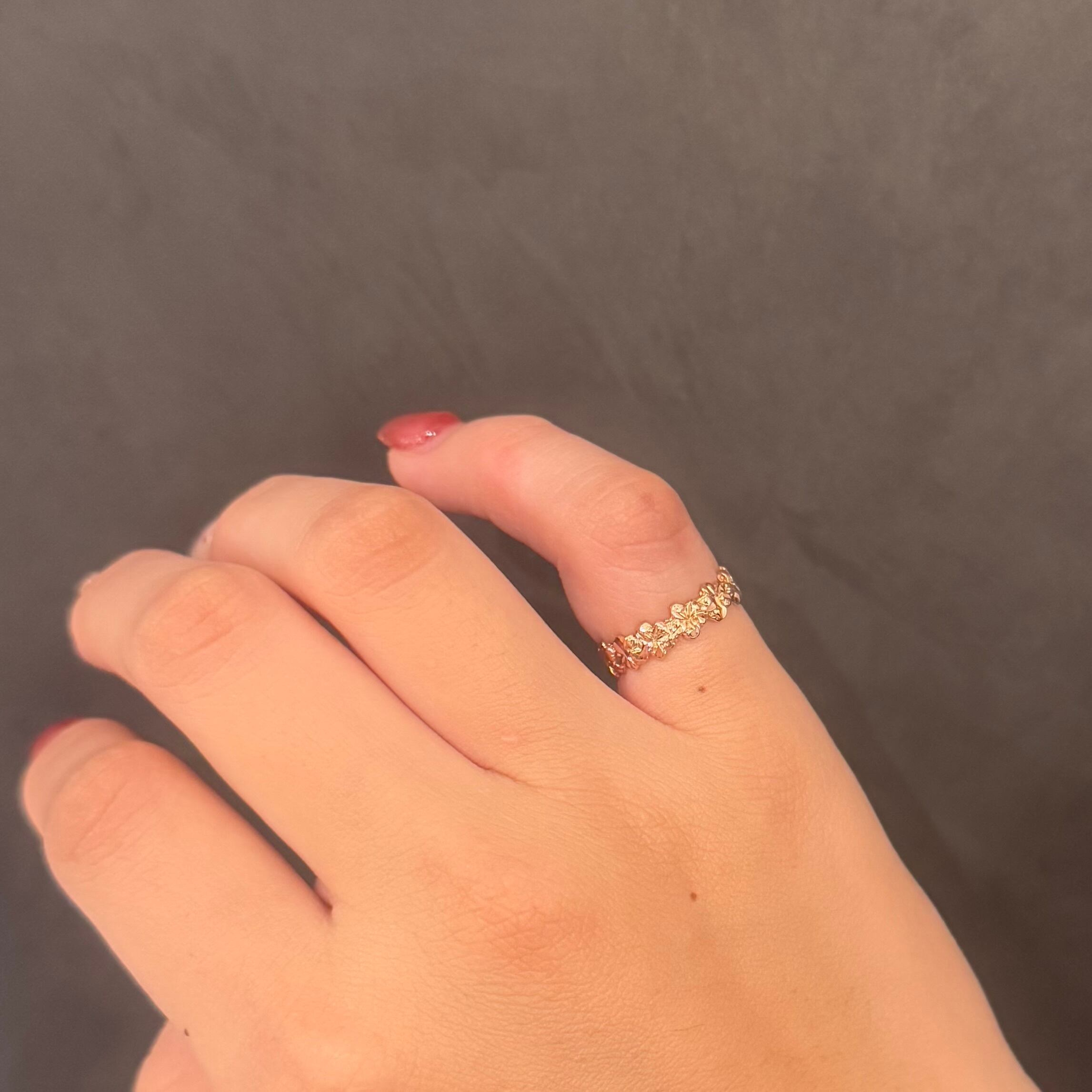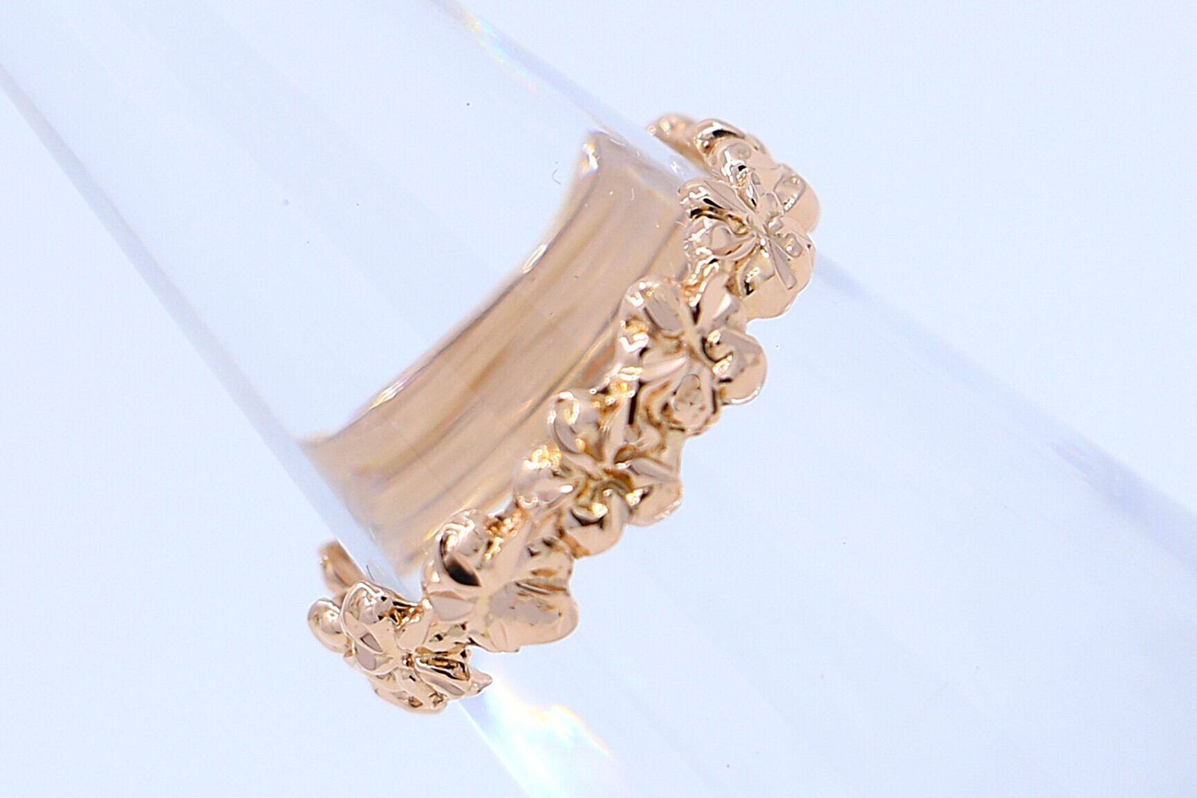 14Kピンクゴールドの温かみある輝きの中に、幸運と愛を象徴するプルメリアの花が連なるようにデザインされたハワイアンジュエリーのリングは、立体的な彫刻が施された繊細な仕上がりで、指元に優雅な華やかさを添えながら、ハワイのスピリットを感じさせるエレガントな逸品です。