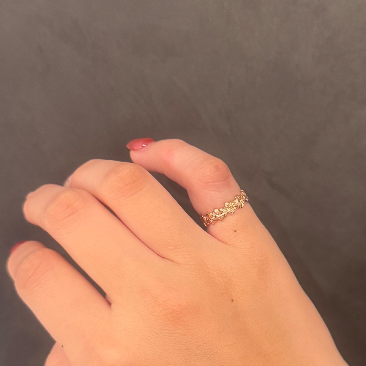 14Kピンクゴールドは、銅の成分が多く含まれるため、温かみのあるローズカラーが特徴です。この柔らかいピンク色が、肌に馴染みやすく、女性らしさを引き立てるため、特に人気のあるカラーです。ピンクゴールドは、華やかさと優雅さを兼ね備えており、ジュエリーとして特別な輝きを放ちます。