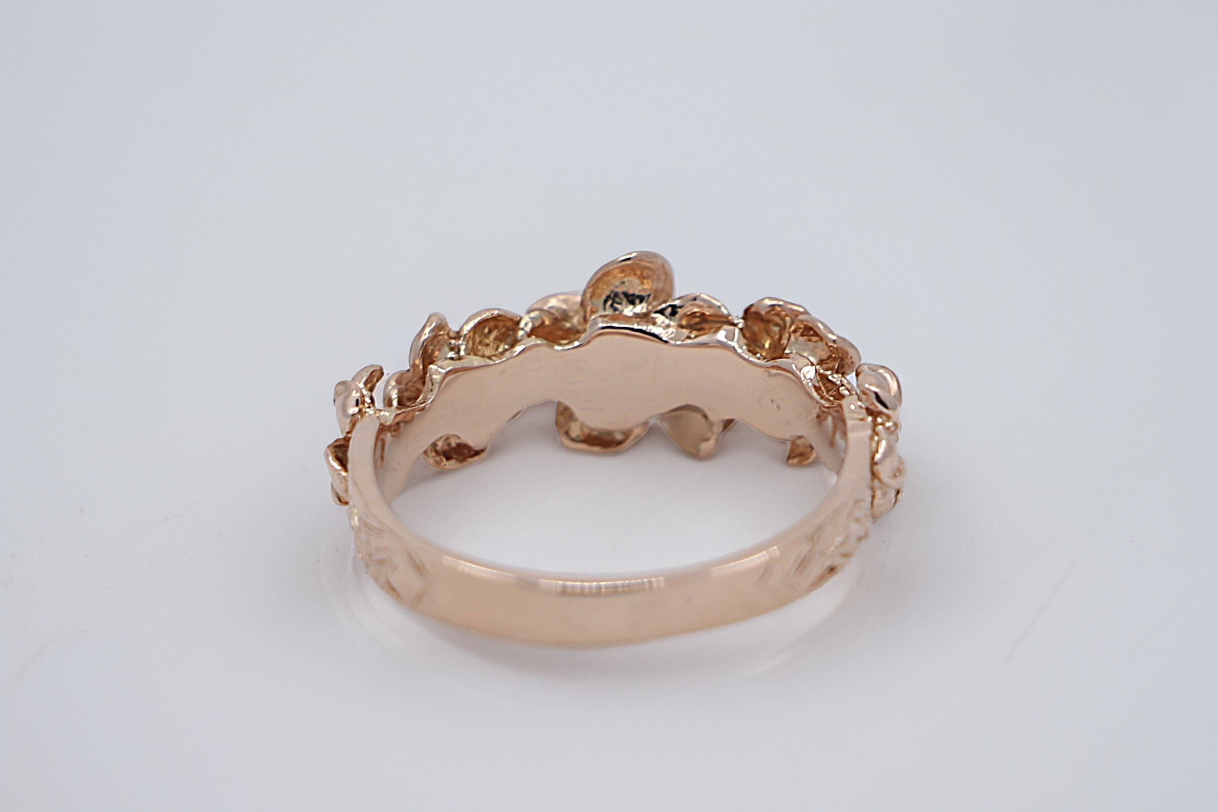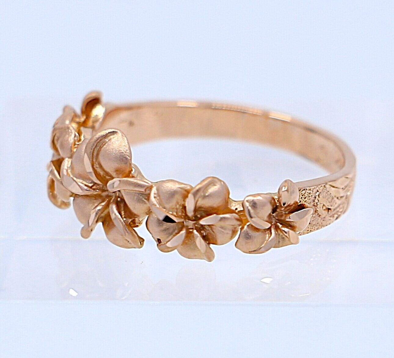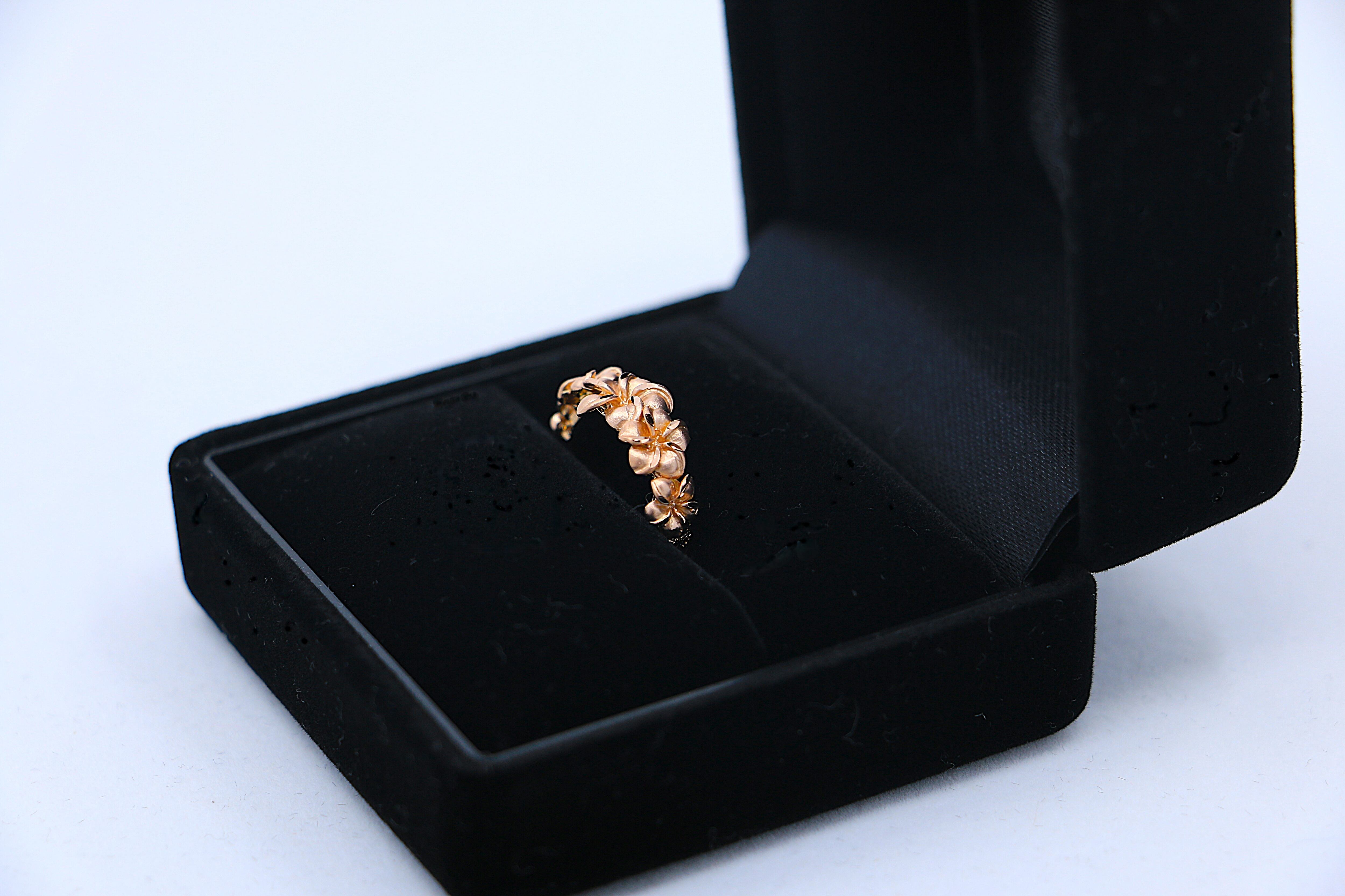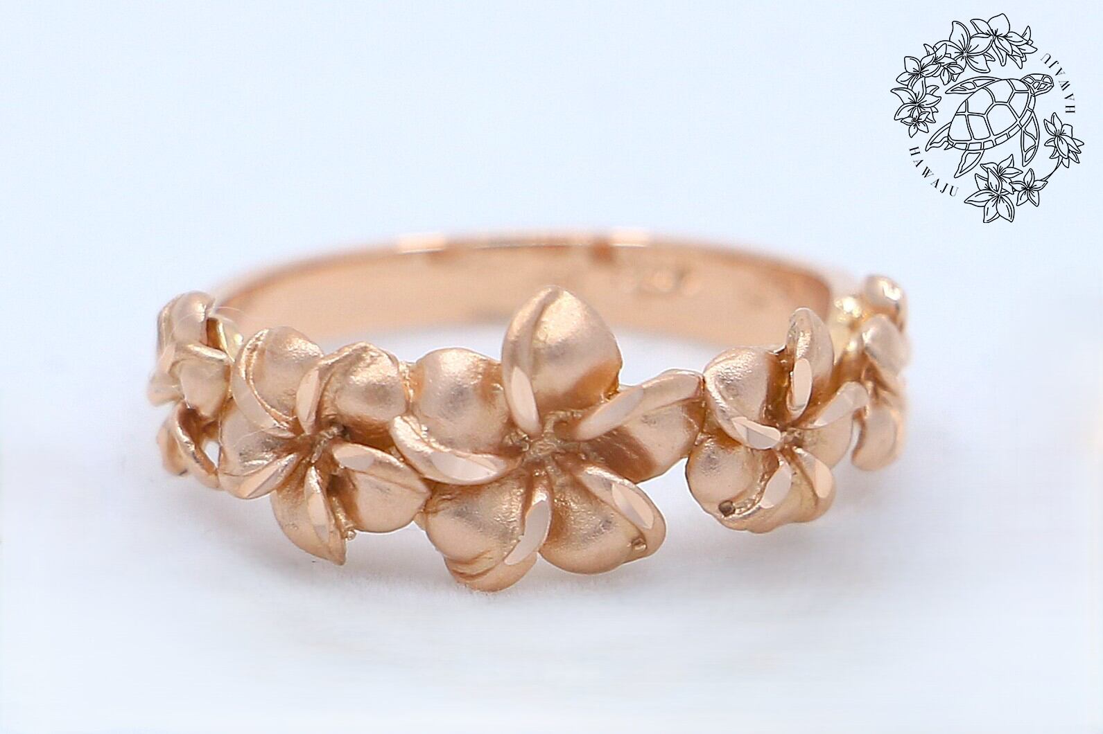 14Kピンクゴールドのリングに華やかに5輪並んだプルメリアの花が、永遠の愛や幸せを象徴し、精緻な彫刻と温かみのある輝きが指元にエレガントさを加え、日常使いから特別な日まで幅広く活躍するハワイアンジュエリーの逸品です。プルメリアの花が繋がることで、永遠の愛や幸せを感じることができる特別なリングで、大切な人へのプレゼントや、自分へのご褒美としてもおすすめのジュエリーです。