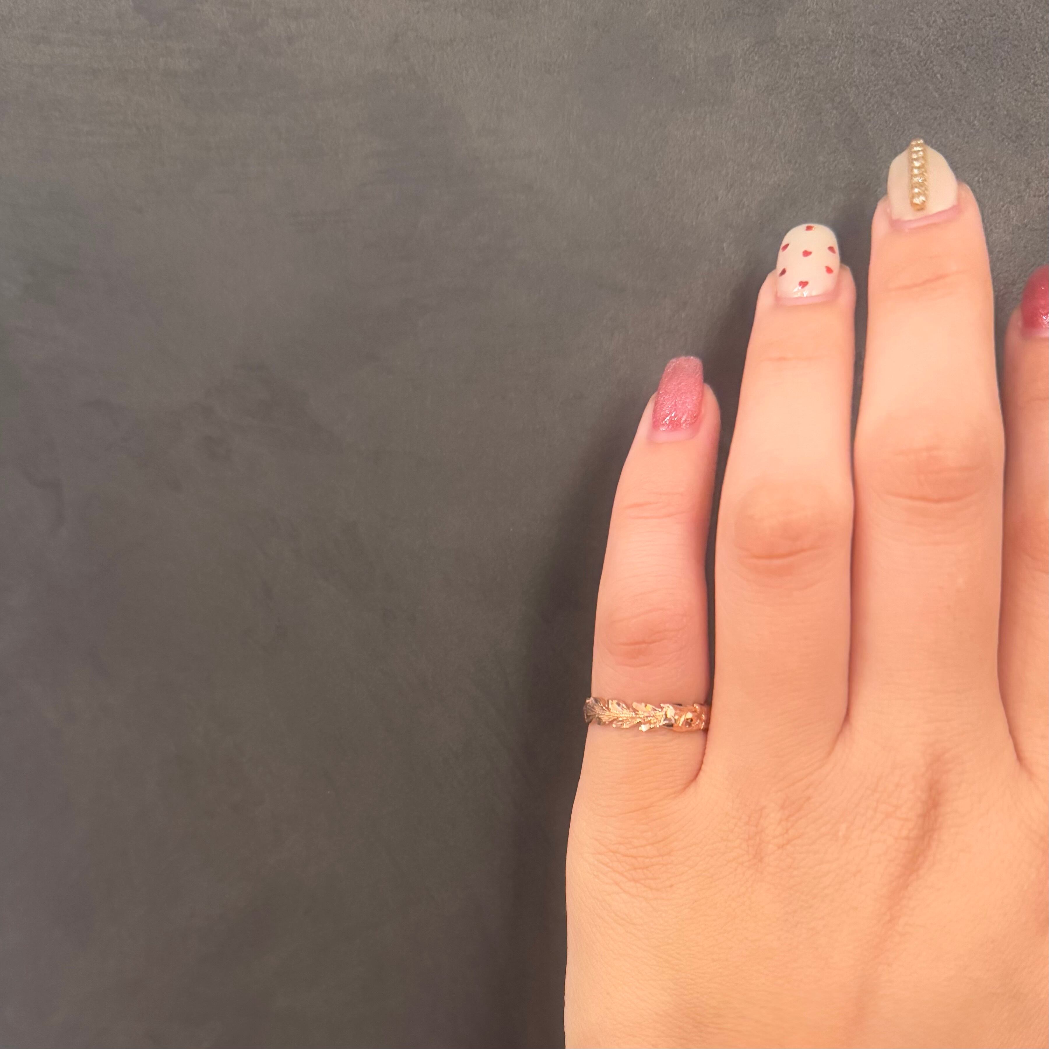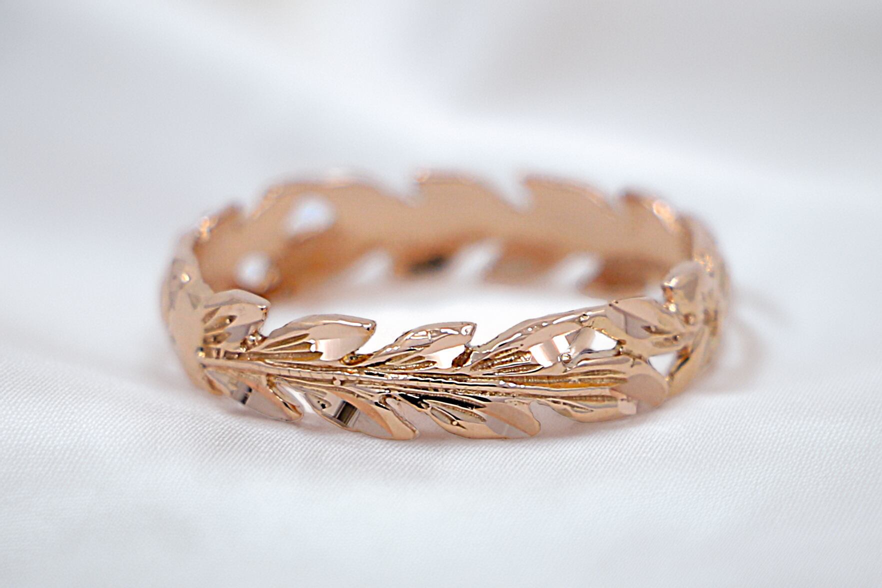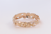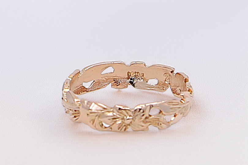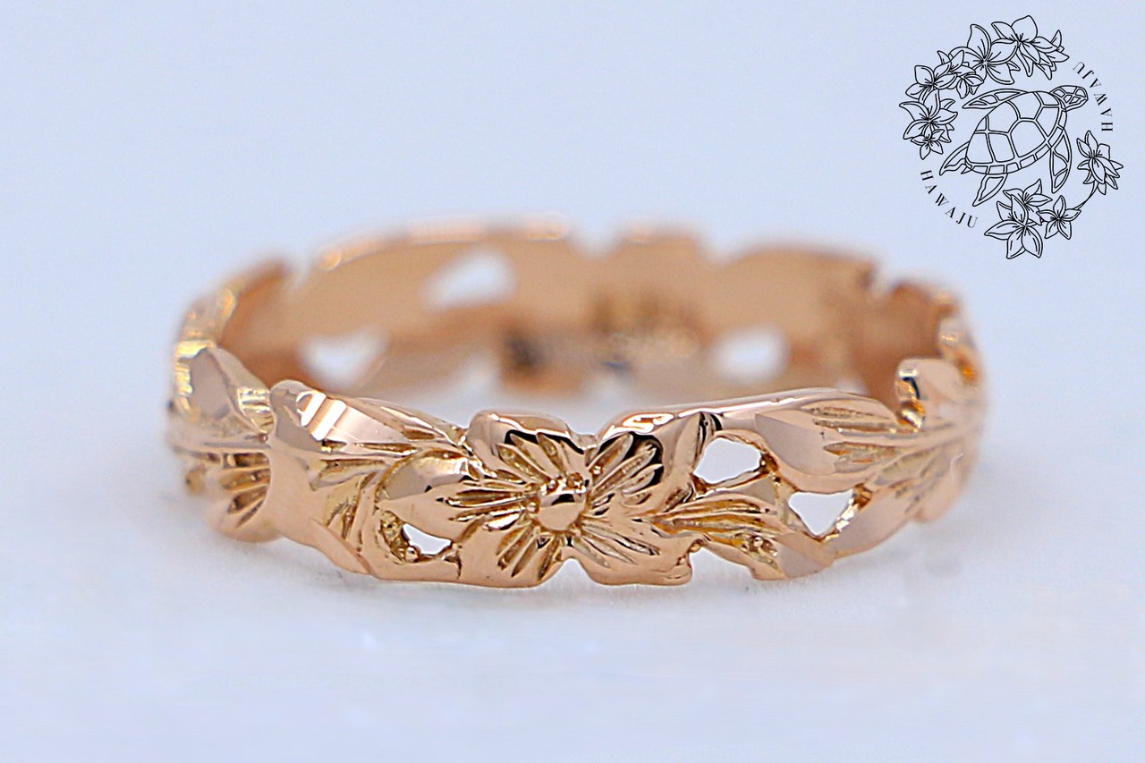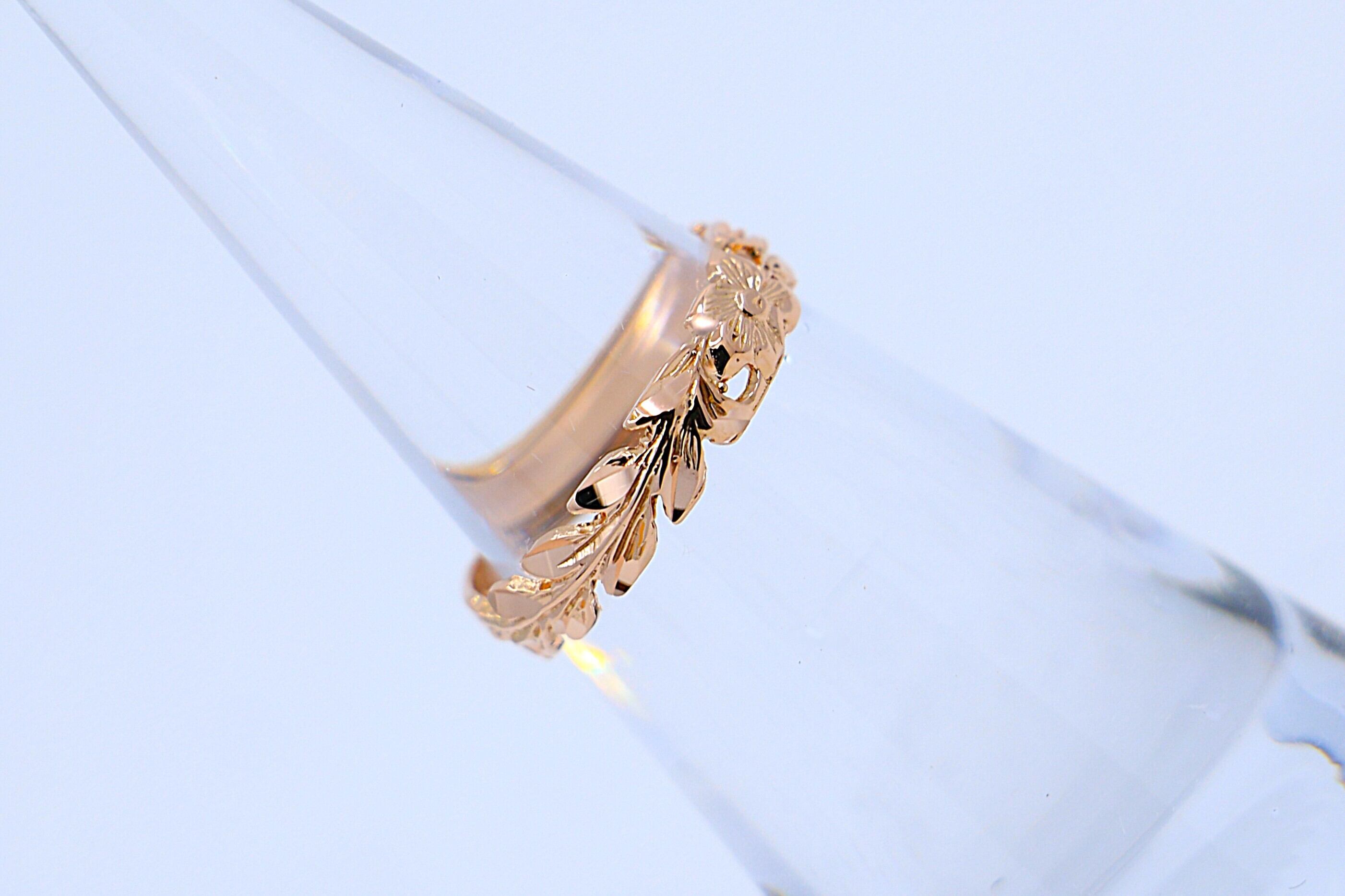 優しい色合いが魅力の14Kピンクゴールドを使用し、ハワイ伝統のマイレリーフのモチーフを繊細に彫り込んだ、ハワイアンジュエリーのリングです。透かし彫りの軽やかなデザインは、指元を優しく包み込み、上品でやわらかな雰囲気を演出します。華やかさと軽やかさを兼ね備え、日常使いにも特別な日にもおすすめです。