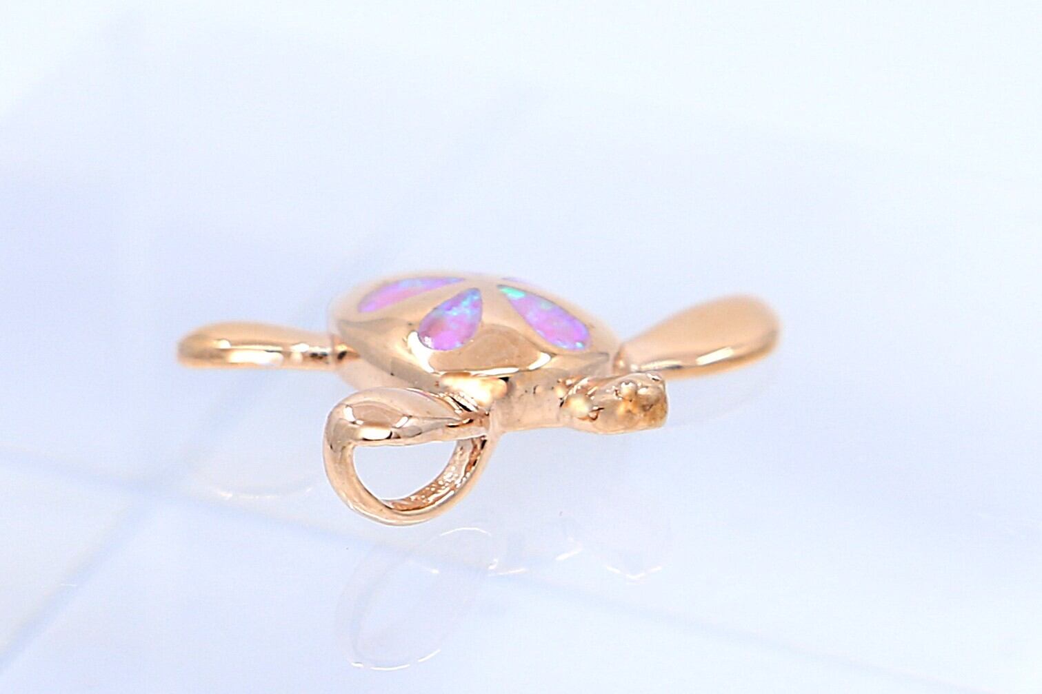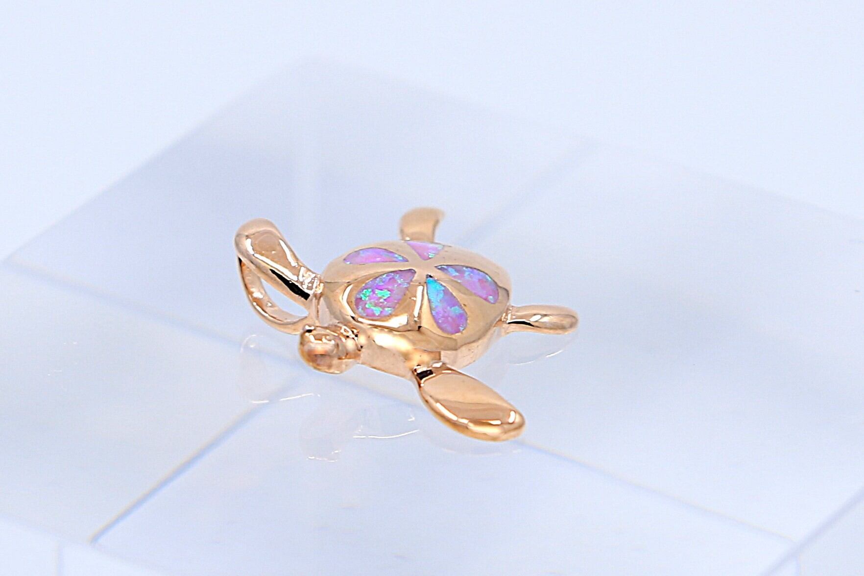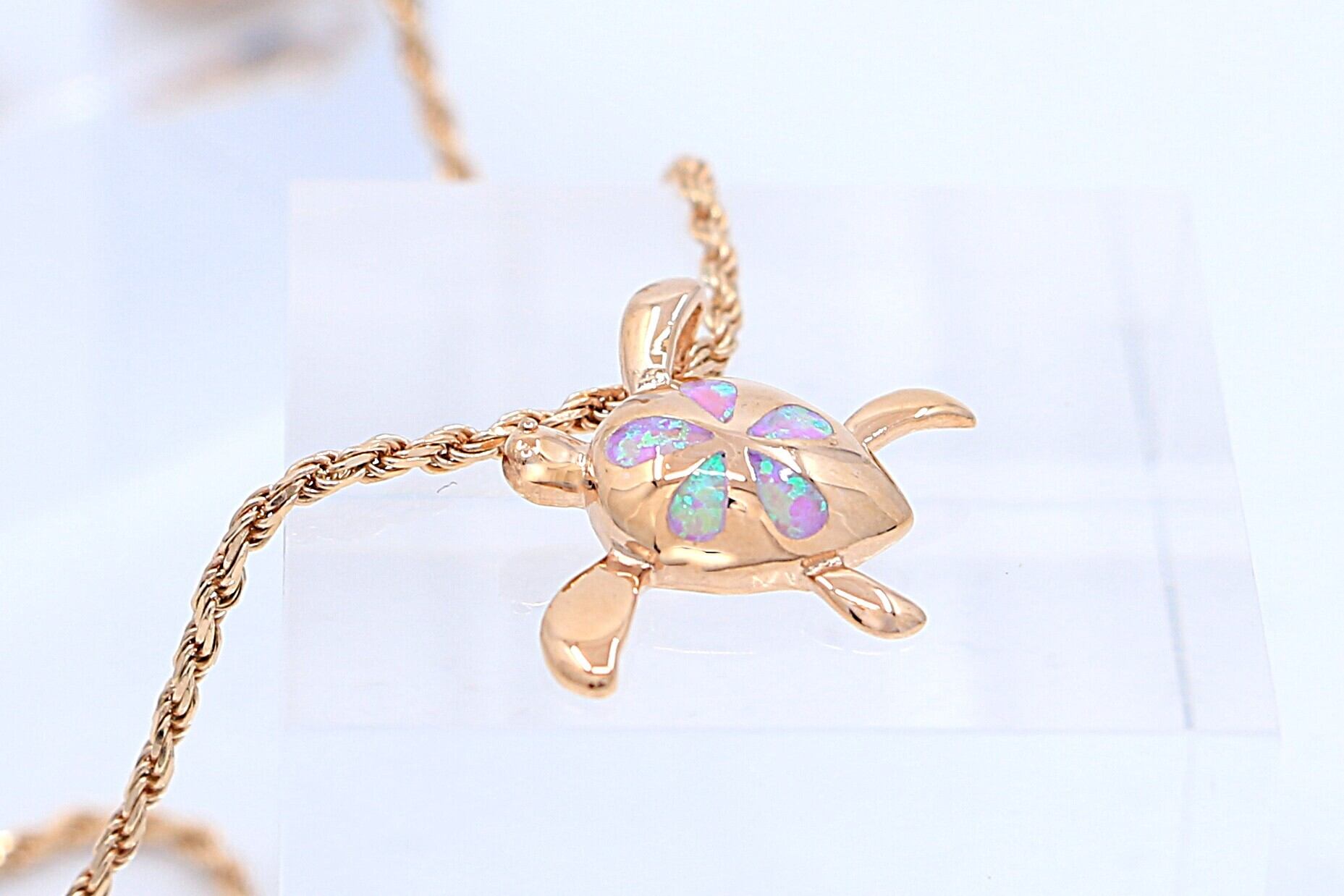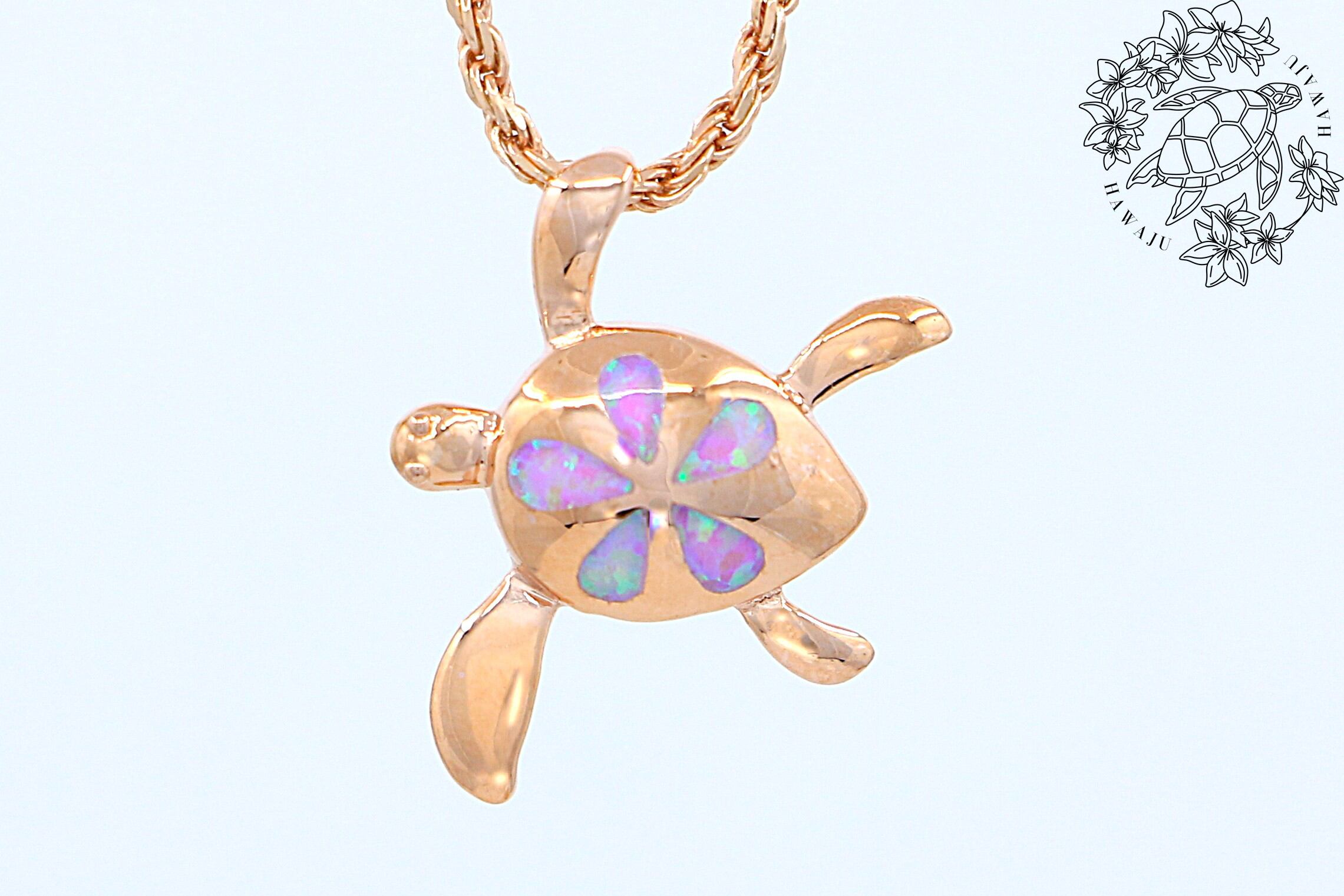 ホヌの甲羅部分には花のように配置されたピンクオパールが、光の角度によって幻想的に輝き、胸元を華やかに彩ります。