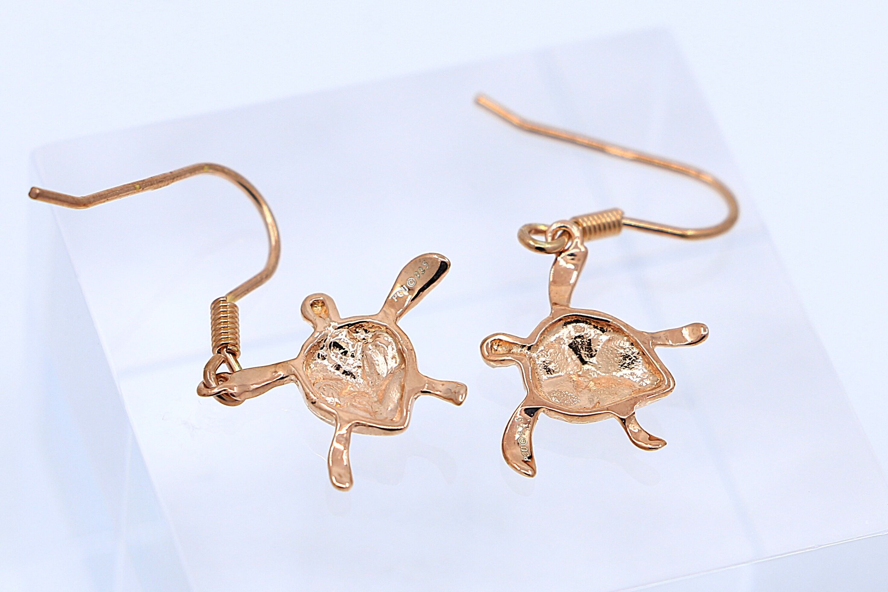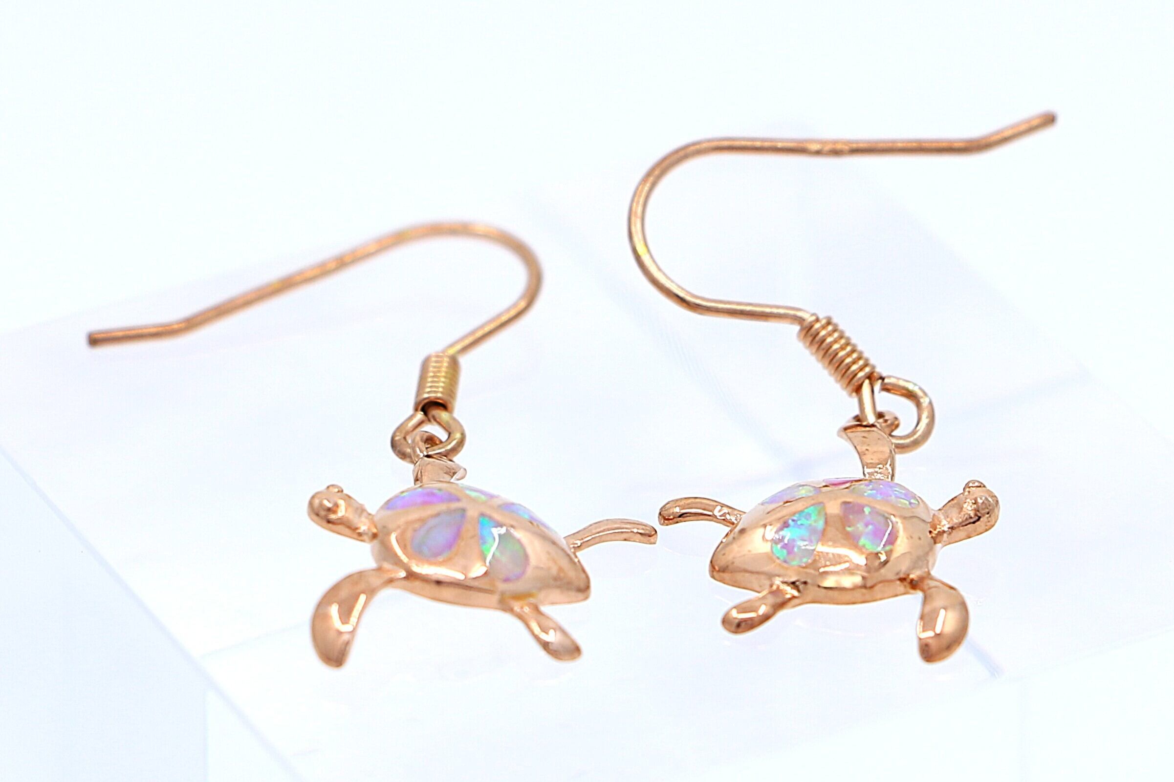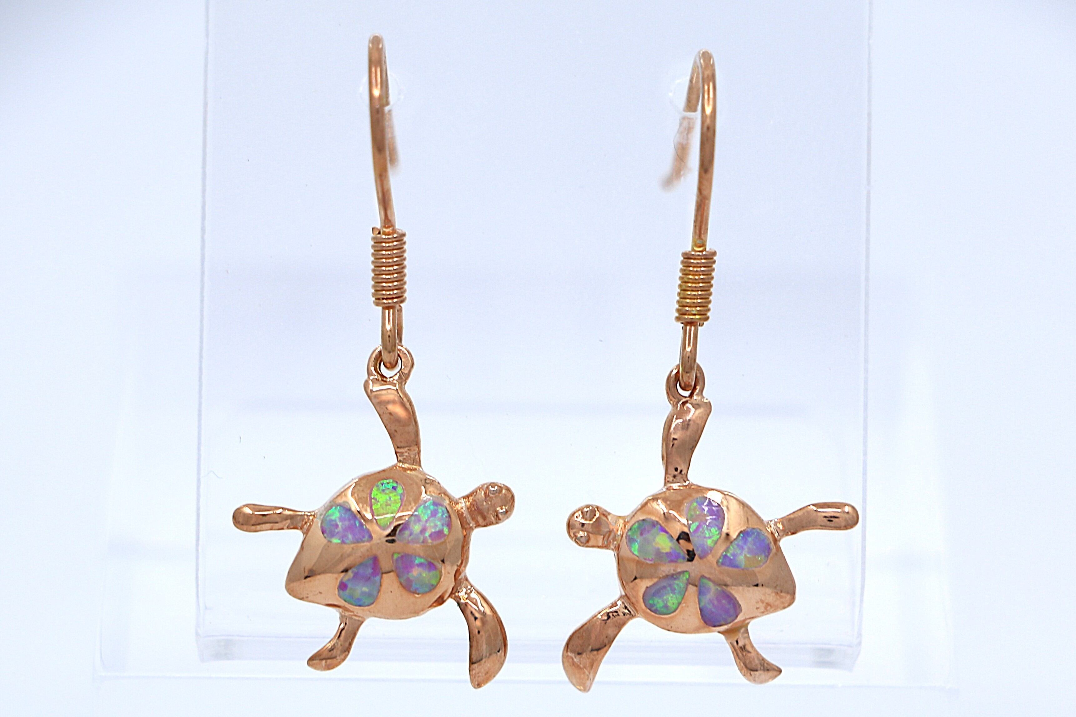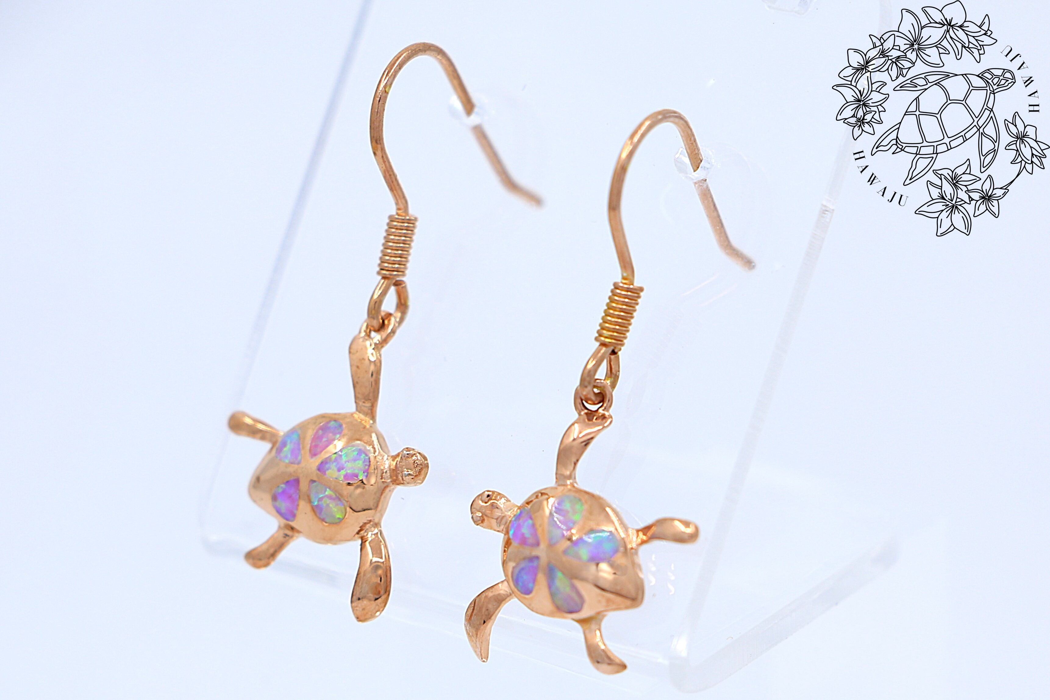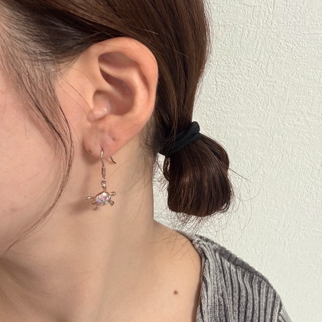 ホヌの甲羅部分には花のように配置されたピンクオパールが、光の角度によって幻想的に輝き、耳元を華やかに彩ります。