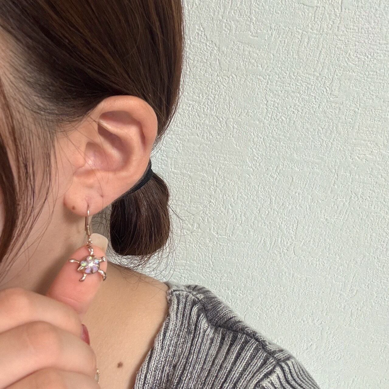 フックタイプのピアスは、耳にしっかりとフィットし、揺れるデザインが特徴的です。軽やかな印象を与えつつ、上品でエレガントな雰囲気を演出します。また、取り外しが簡単で、動きに合わせて花が揺れるため、顔周りを華やかに見せてくれます。