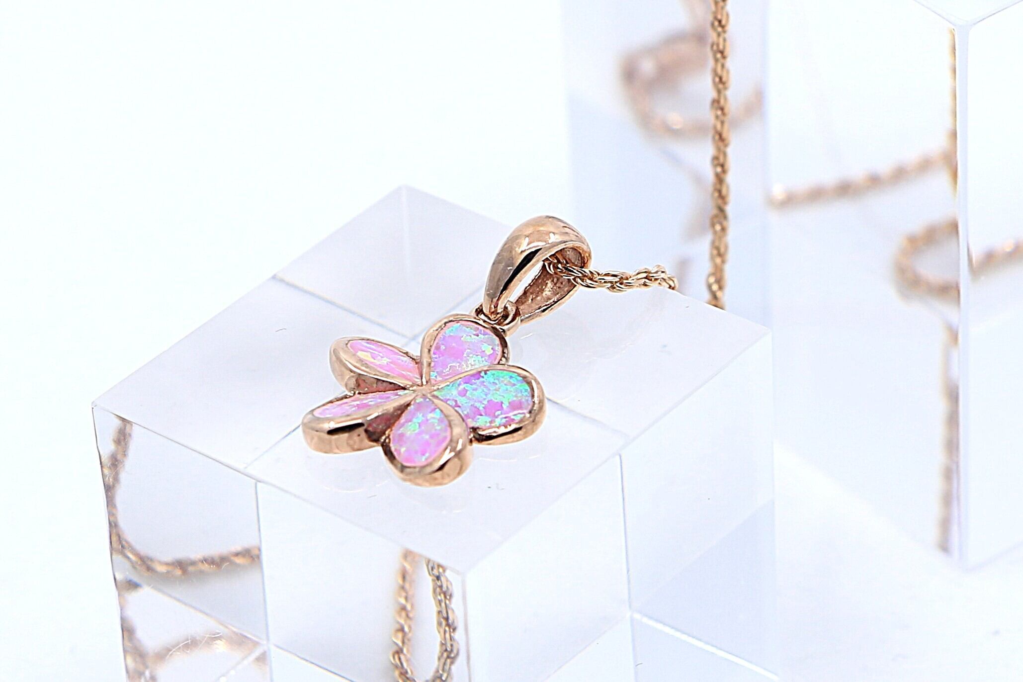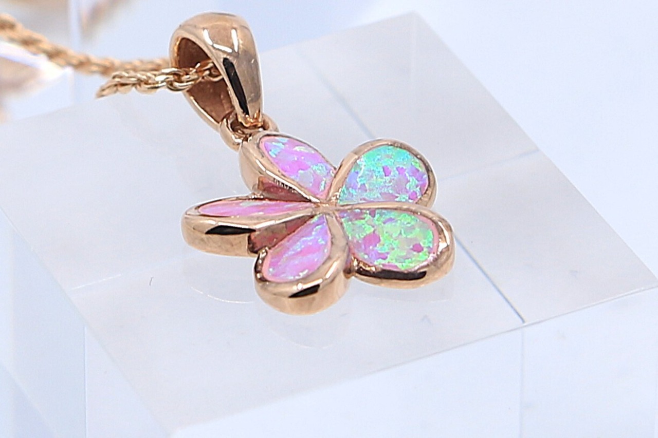 花びら一枚一枚に美しくインレイされたピンクオパールが、角度によって幻想的な光を放ち、可憐さの中に洗練された存在感を演出します。また、ピンクゴールドのやわらかな色合いで肌なじみも抜群です。