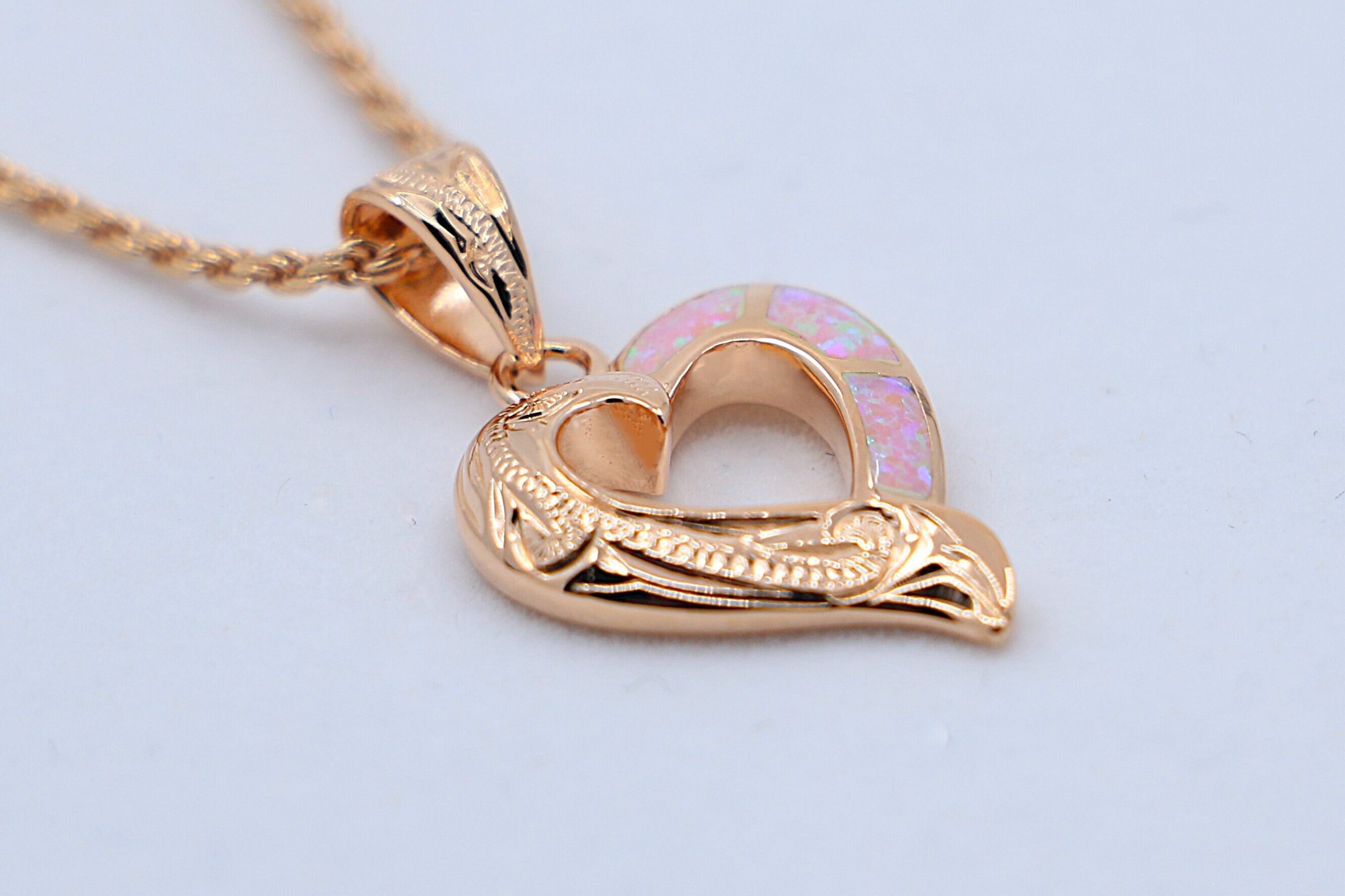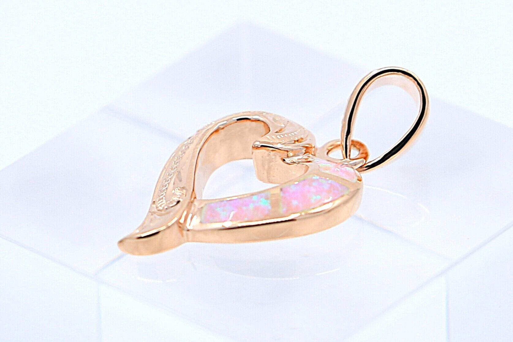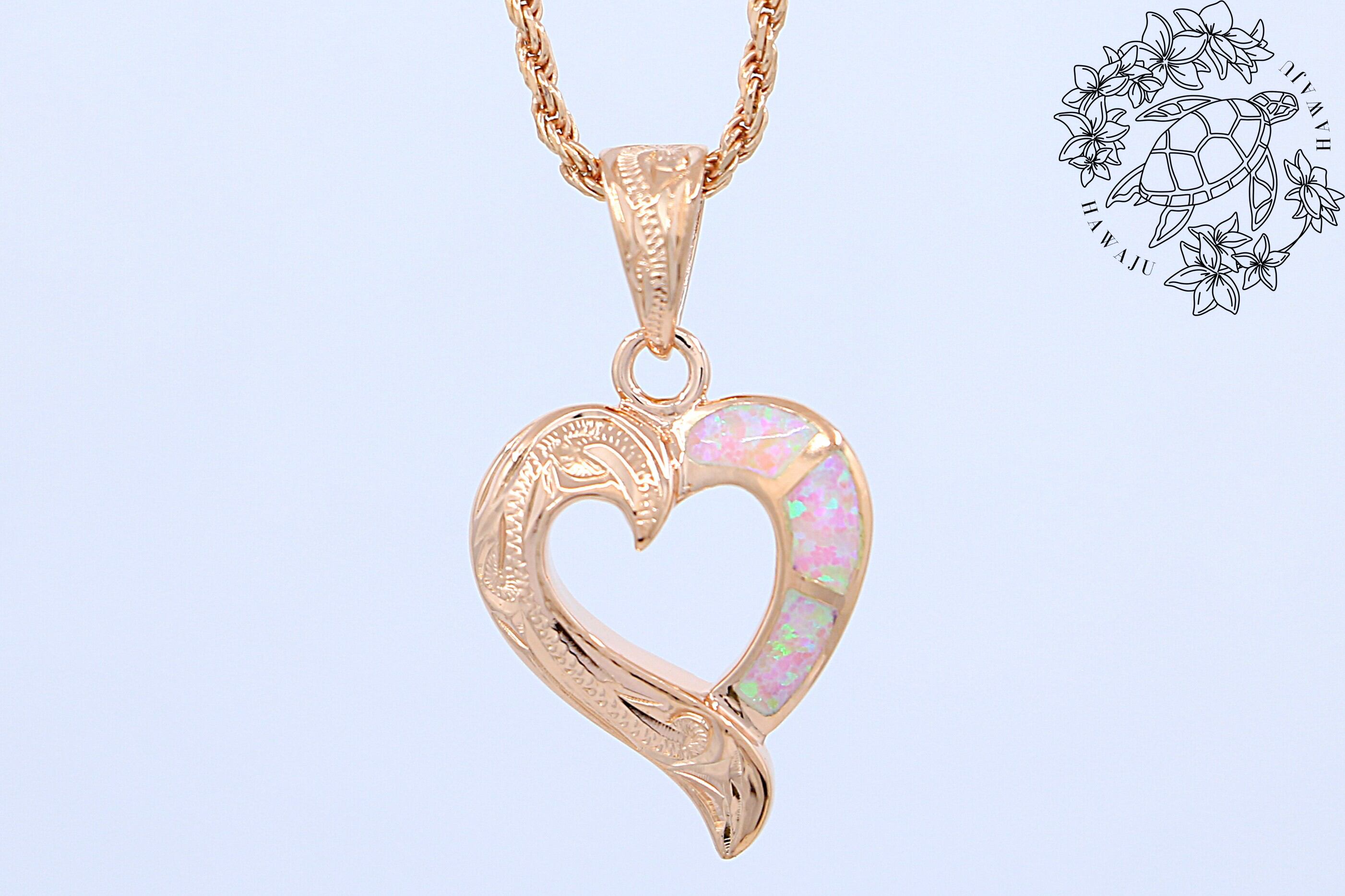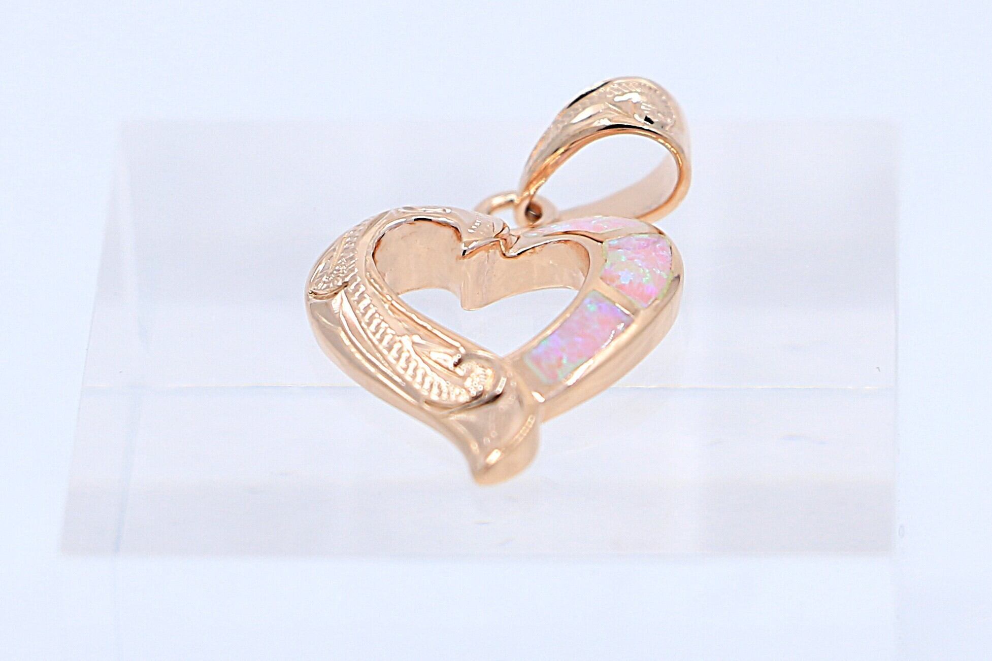 やわらかで優美な曲線のハートの中に、ピンクオパールがインレイ加工され、伝統的なスクロール(波)模様やプルメリアなどの彫りが施さています。上品でありながらしっかりと存在感のあるデザインに仕上がっています。