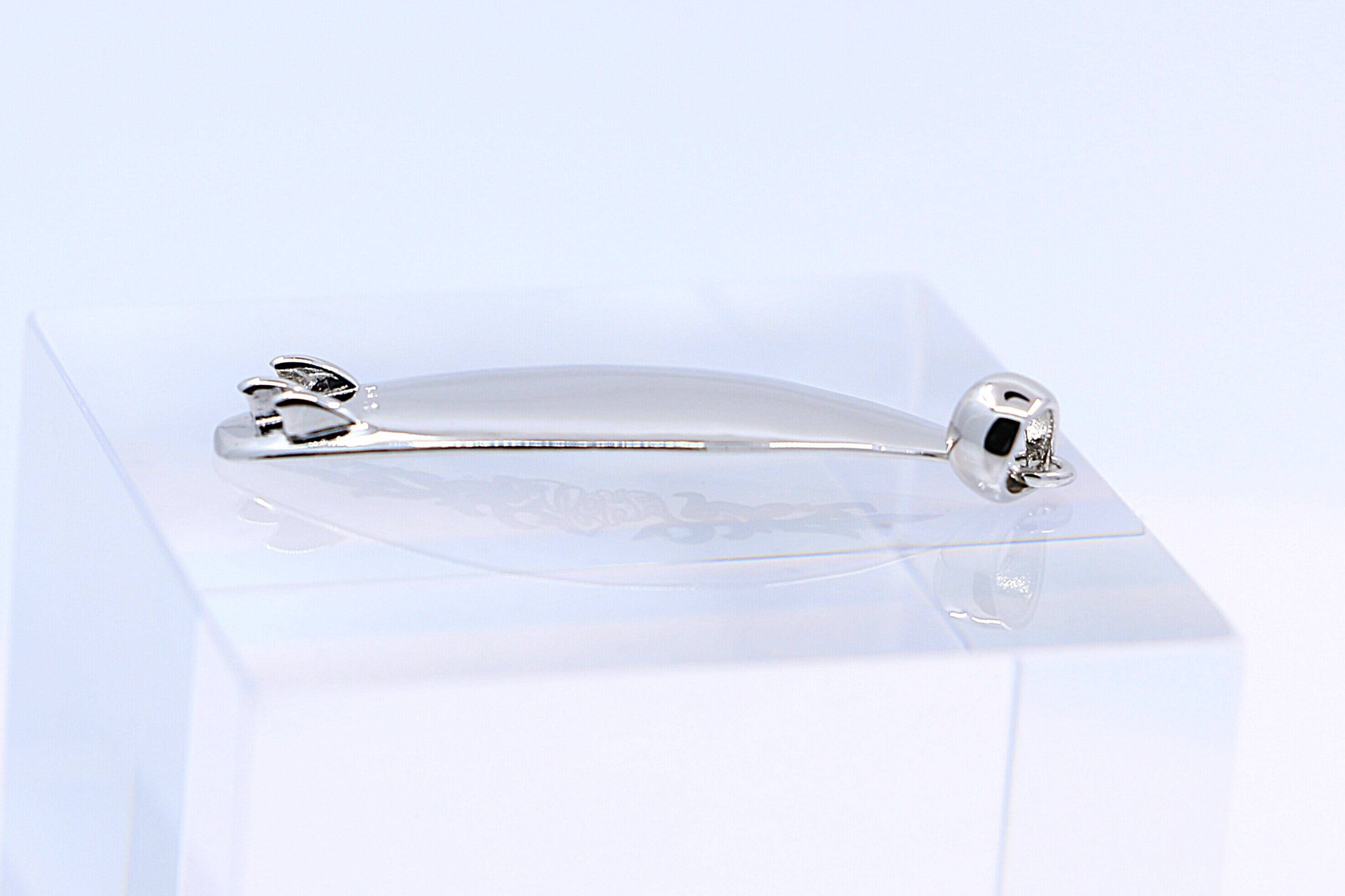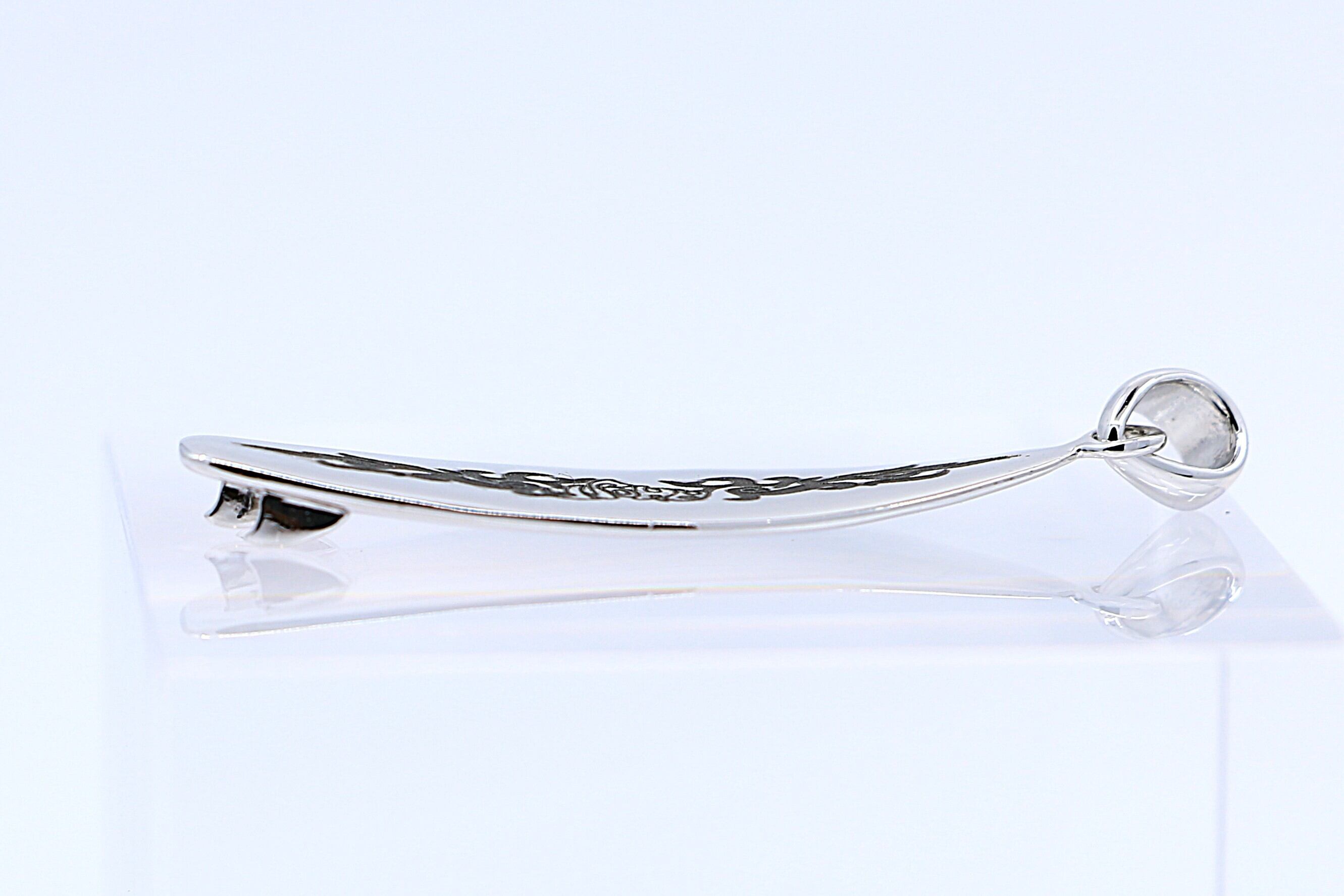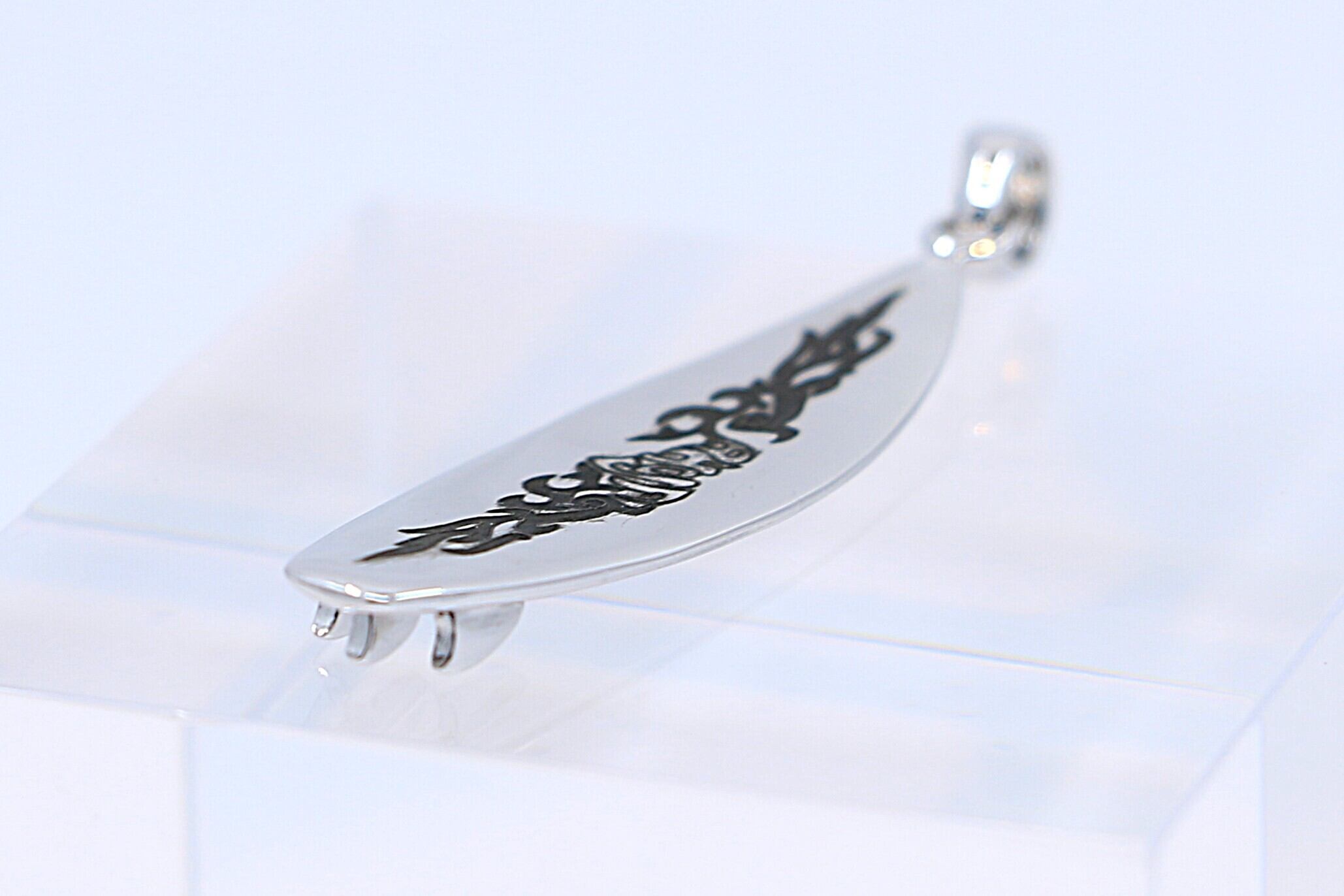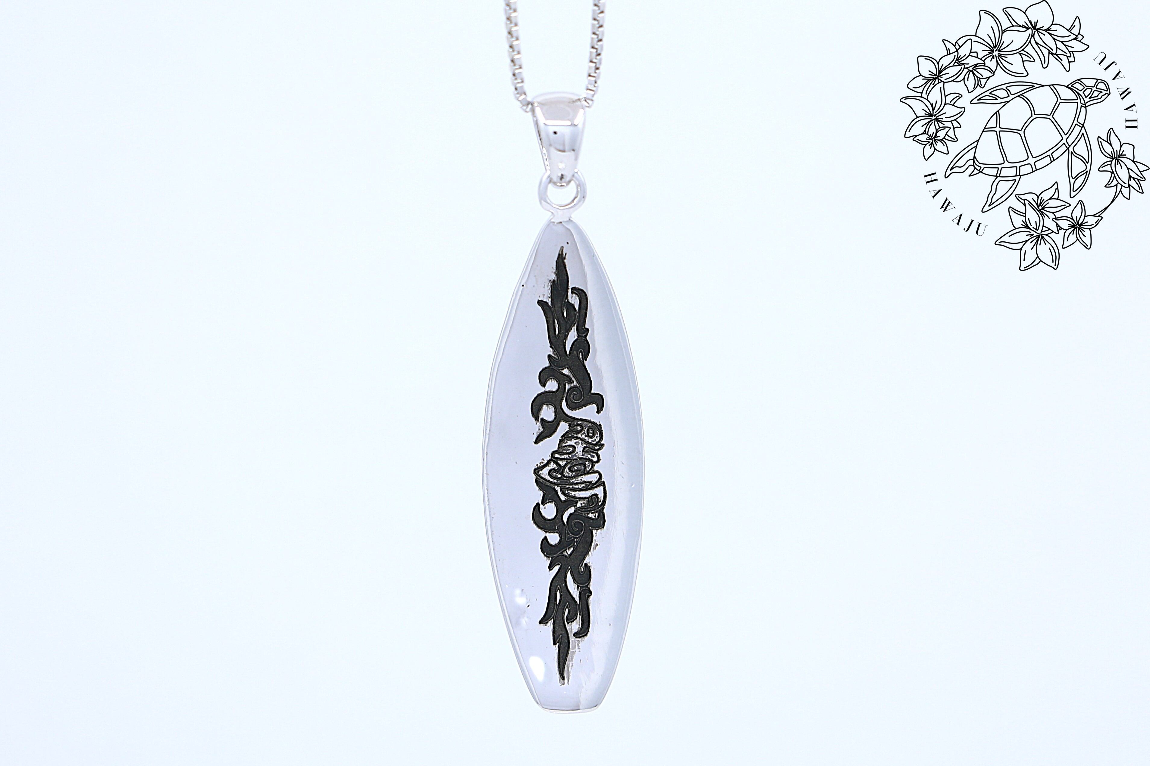 ハワイの波と自由なスピリットを象徴する、サーフボード型のシルバーペンダントトップです。サーフボードはハワイ文化において自由と冒険を象徴するアイテムとして知られており、このペンダントトップを身につけることで、そのポジティブなエネルギーを感じることができ、胸元にさりげなく海の風を運びます。ブラックサンドのハワイアンファイアフレームと「ALOHA」デザインが施されています。