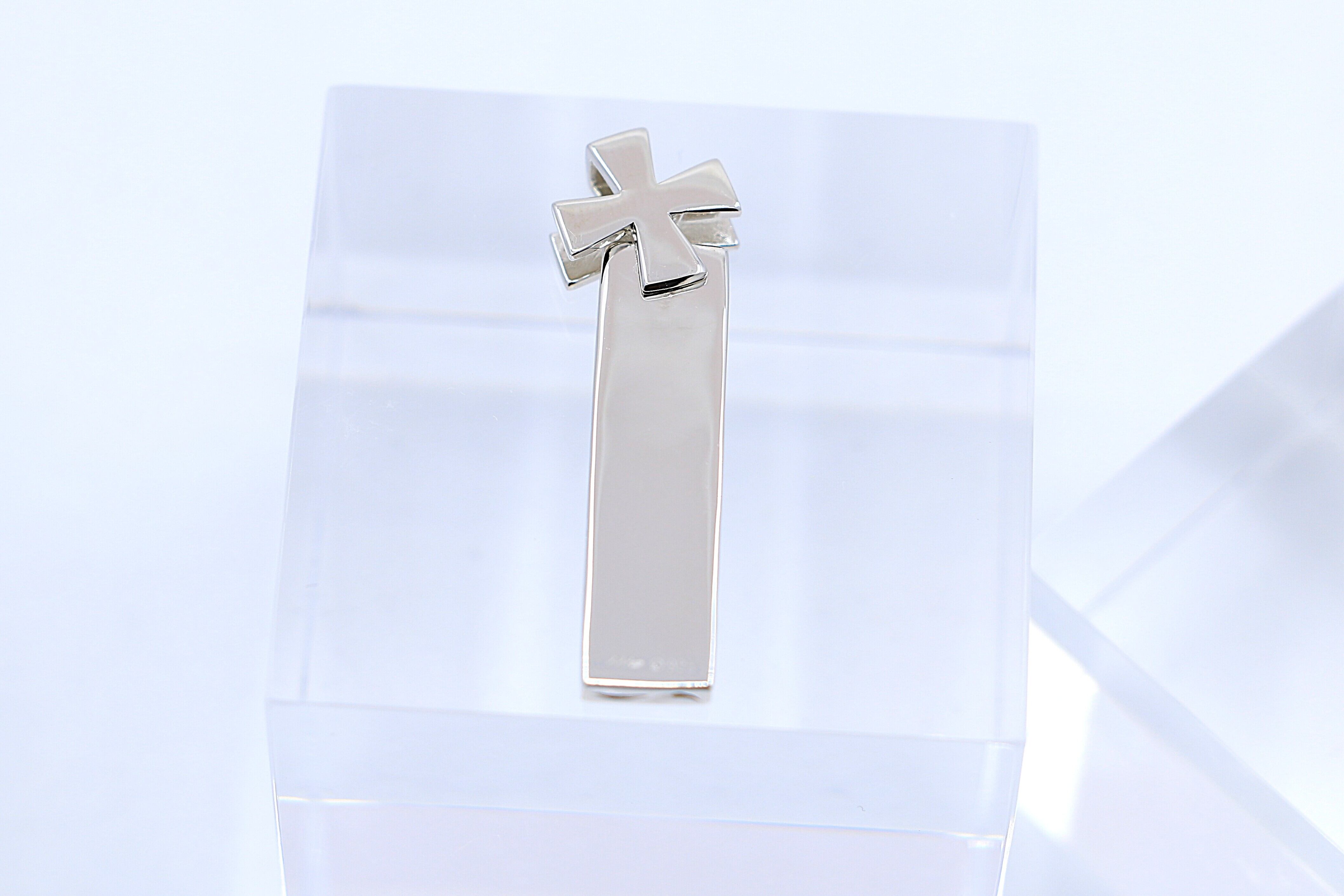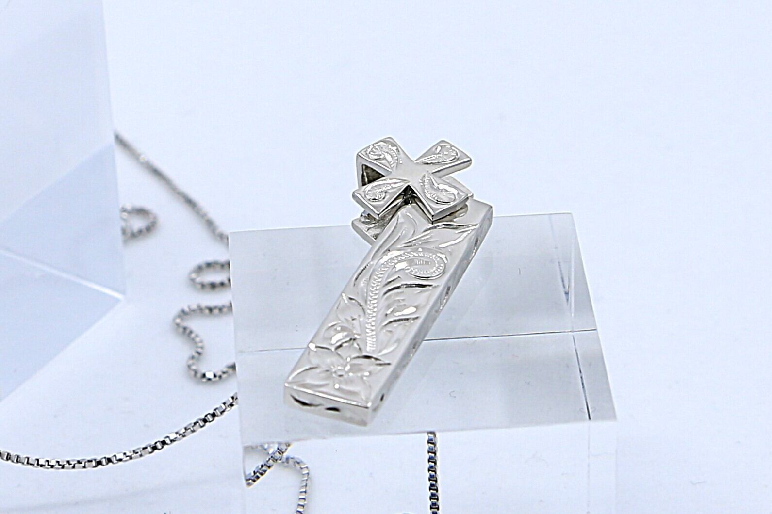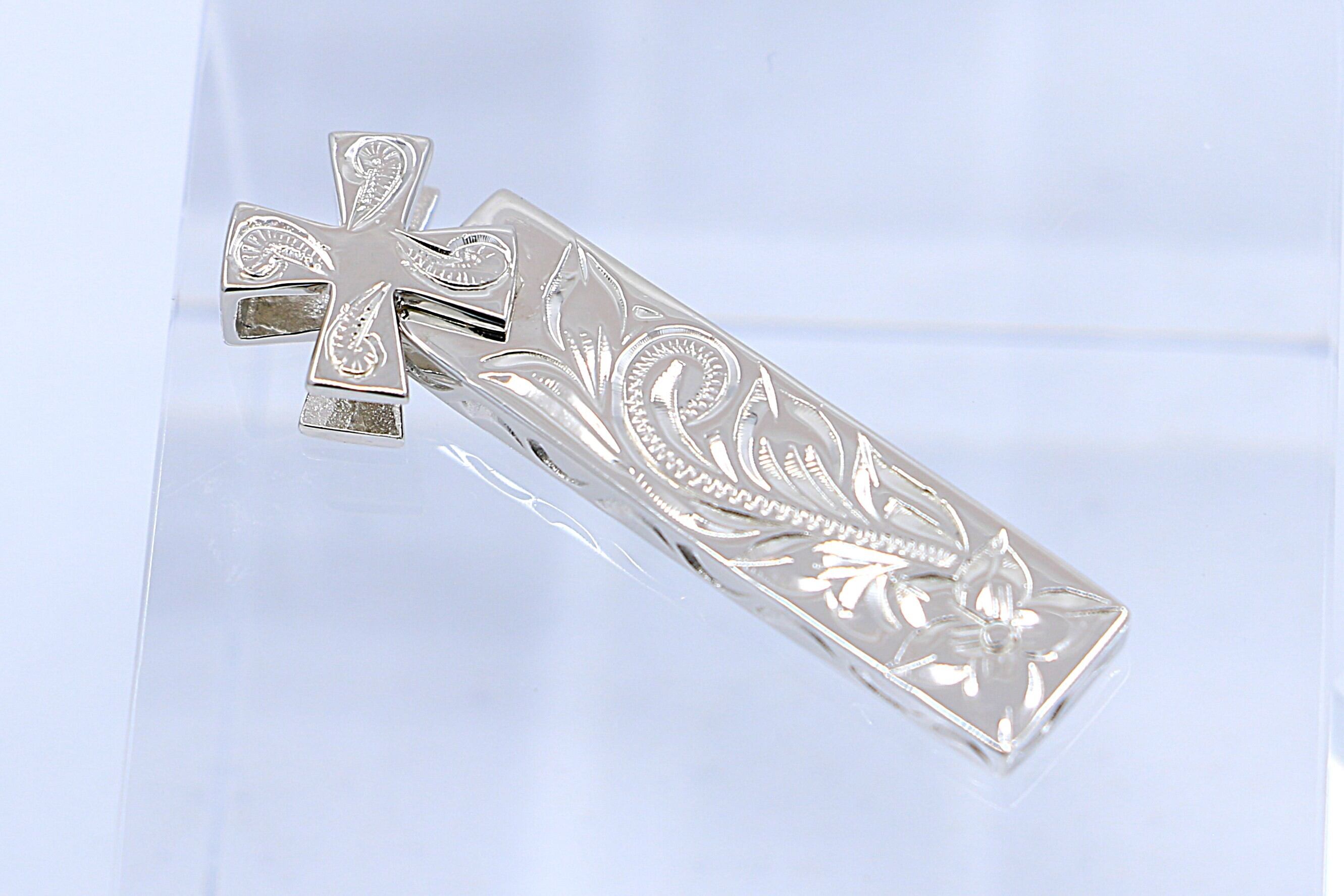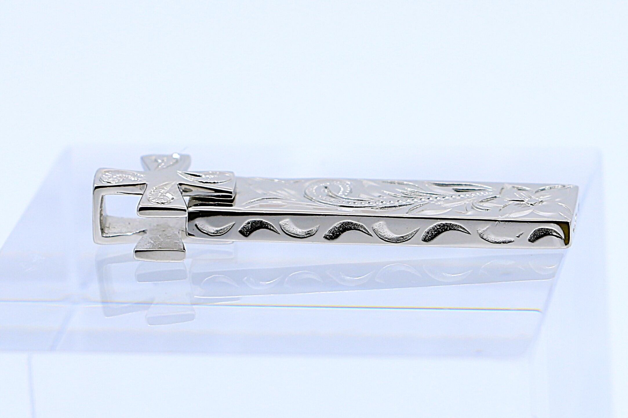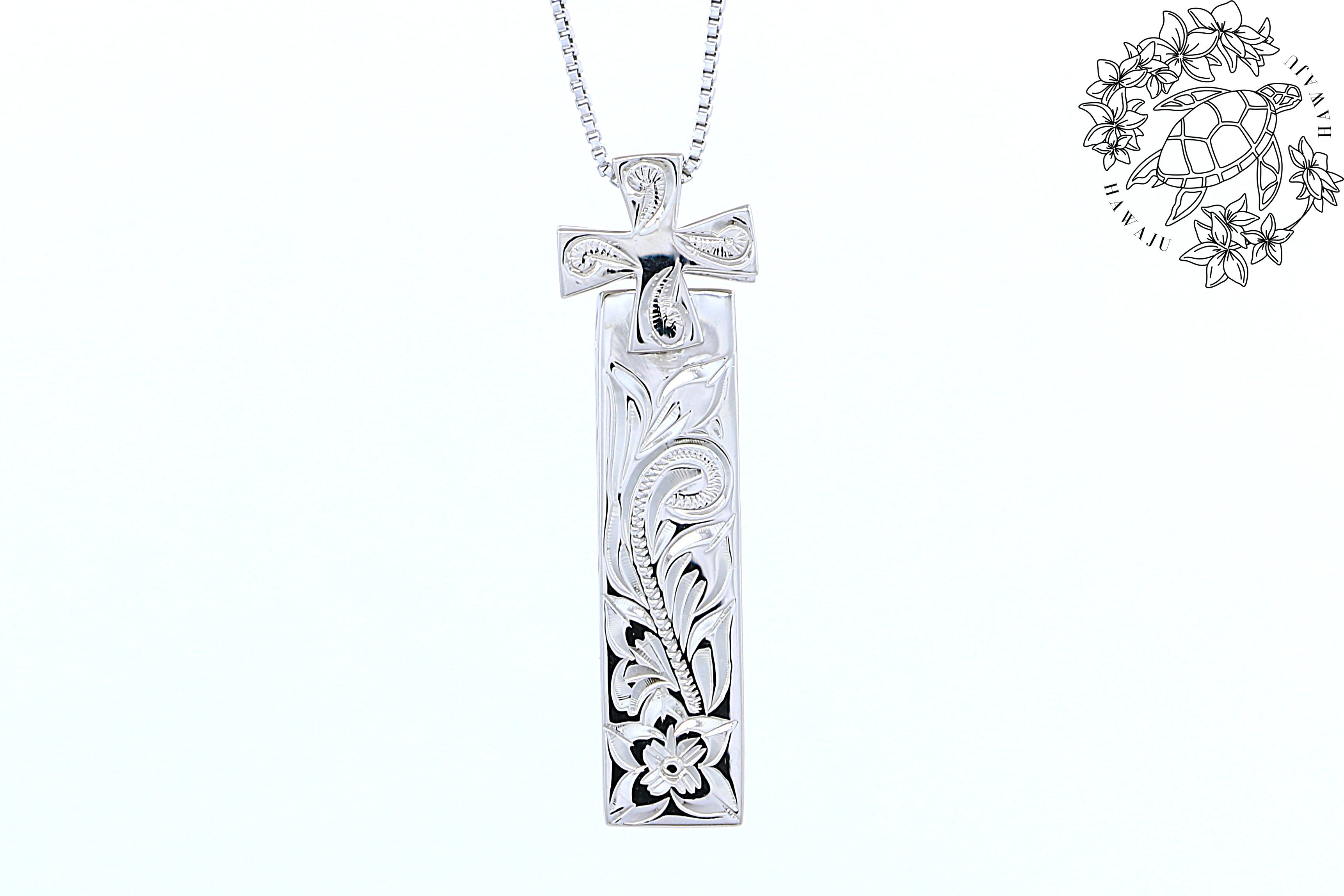 このペンダントトップは、ハワイアンジュエリーのデザインが施されたロングバー型です。ロングバーの形状はシンプルでありながらもエレガントで、どんなスタイルにも合わせやすいです。ロングバーの表面には、プルメリアやスクロール等ハワイの伝統的なデザインが彫刻されており、トップ部分にはクロスがあしらわれ、全体的に繊細で美しい仕上がりです。