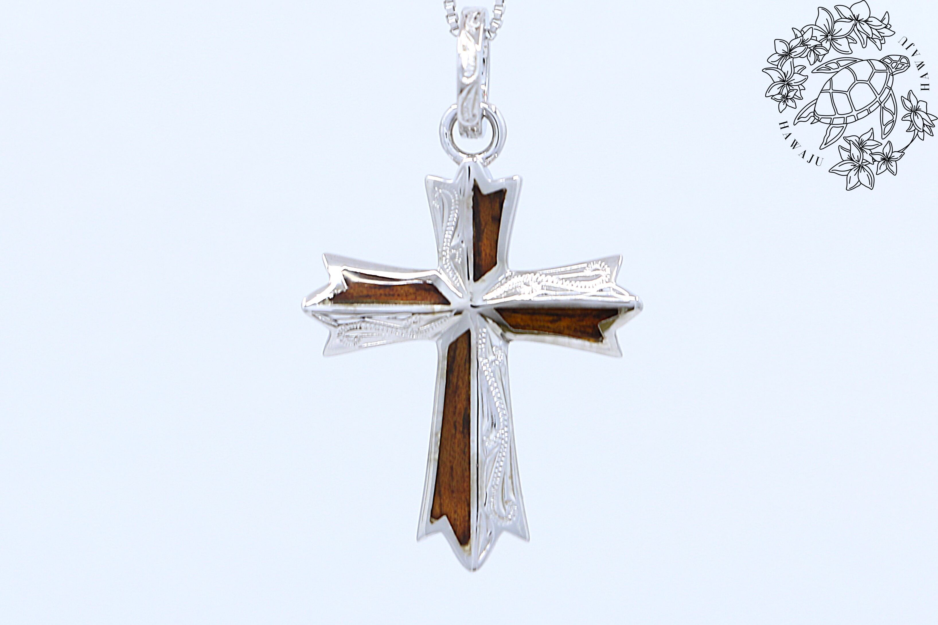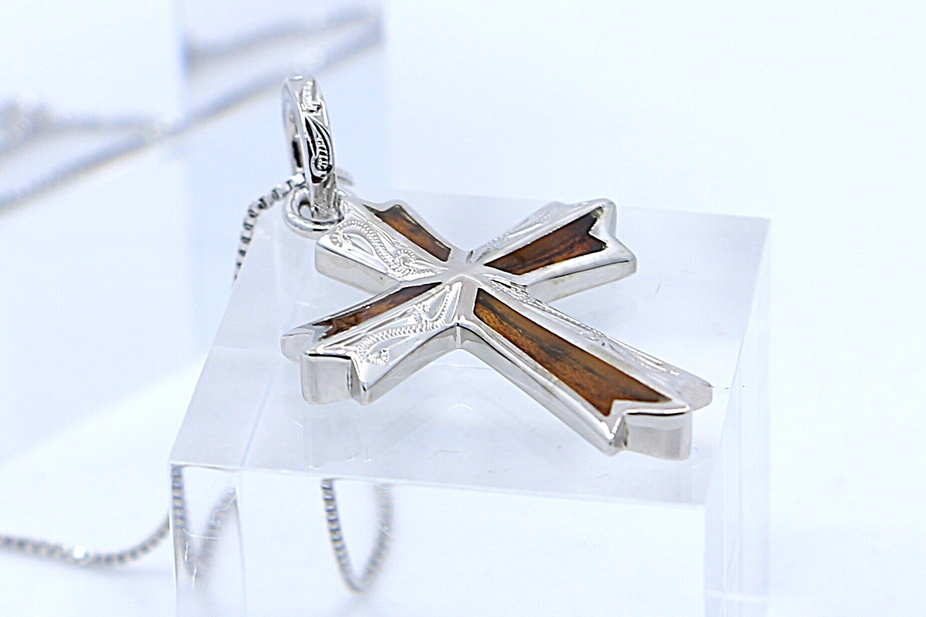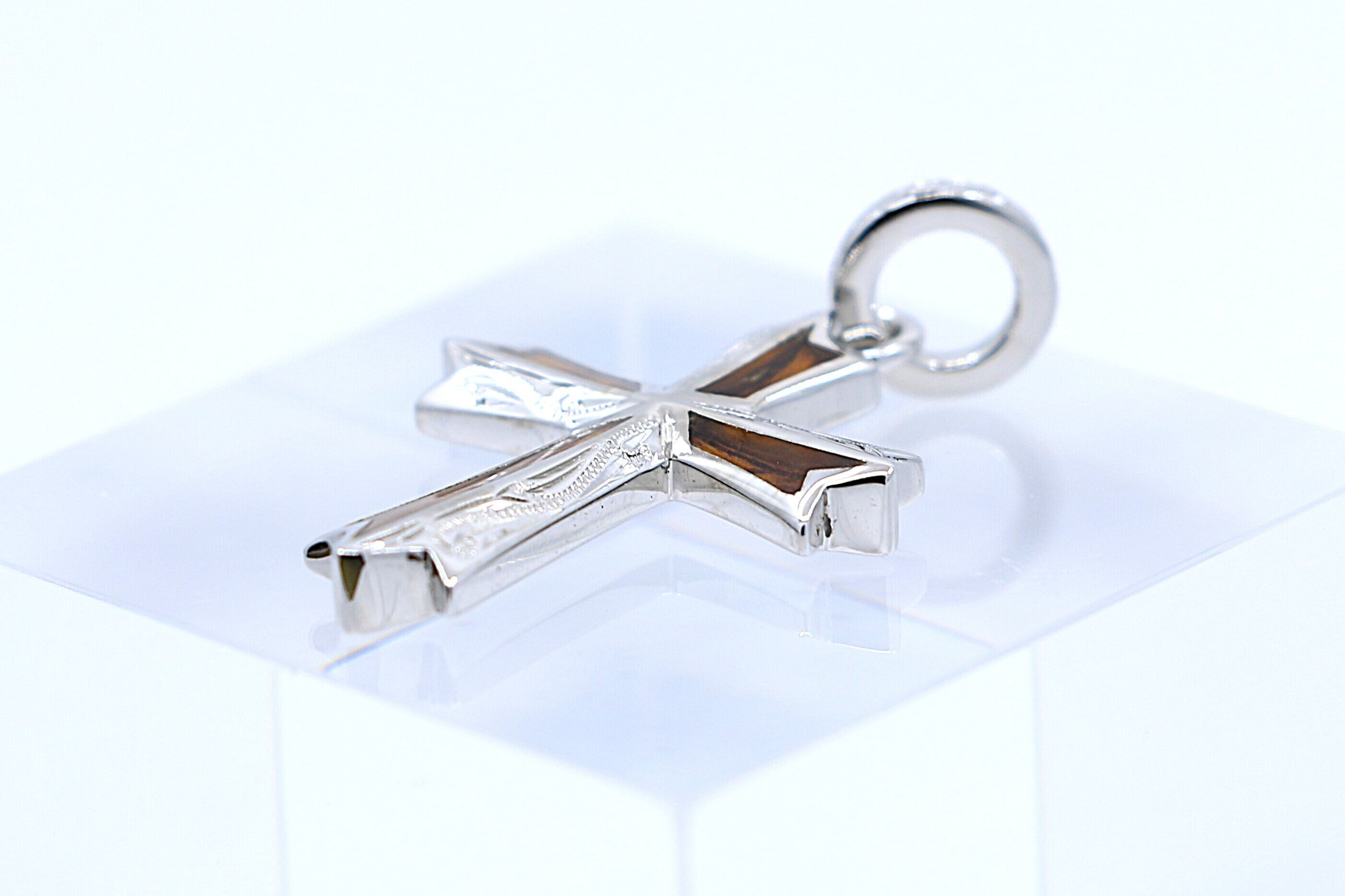 このペンダントトップは、クロス(十字架)デザインを基調とし、クロス部分にハワイ特有のコアウッドを使用したシルバー製のアイテムです。