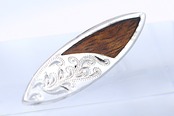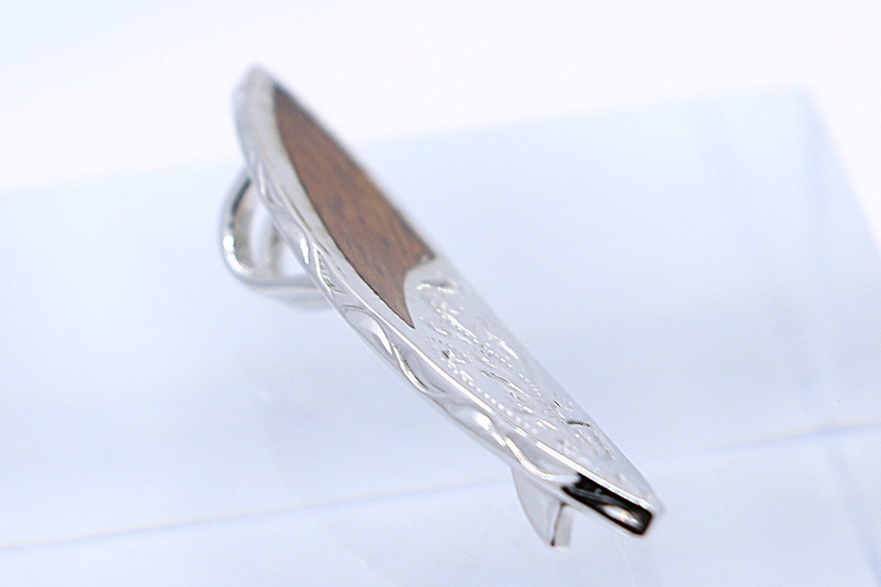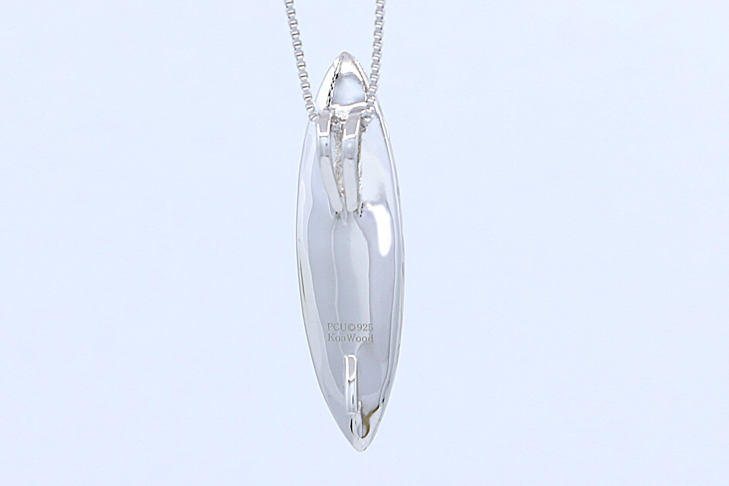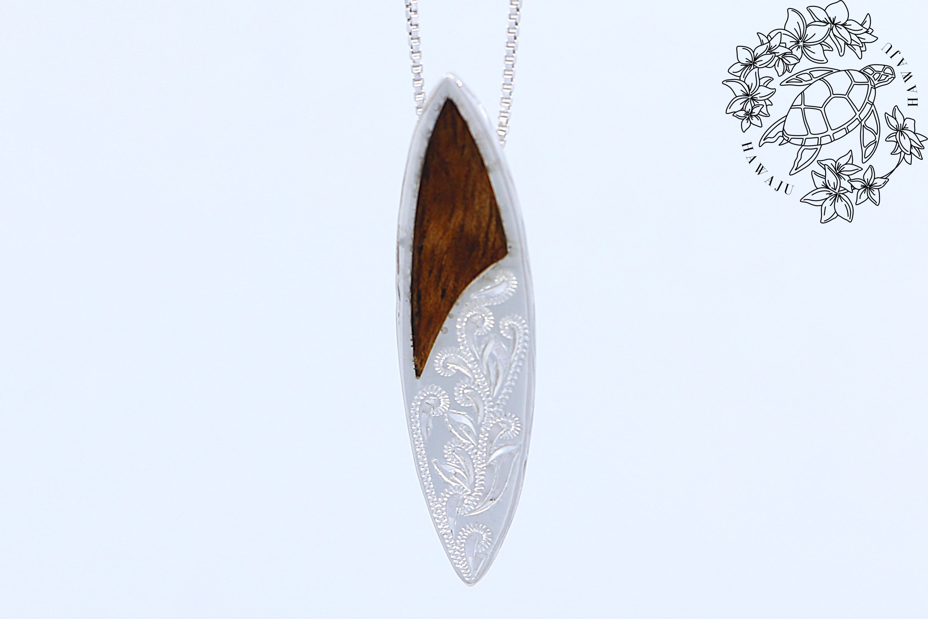 ハワイの波と自由なスピリットを象徴する、サーフボード型のコアウッドがあしらわれたシルバーペンダントトップです。サーフボードはハワイ文化において自由と冒険を象徴するアイテムとして知られており、このペンダントトップを身につけることで、そのポジティブなエネルギーを感じることができ、胸元にさりげなく海の風を運びます。