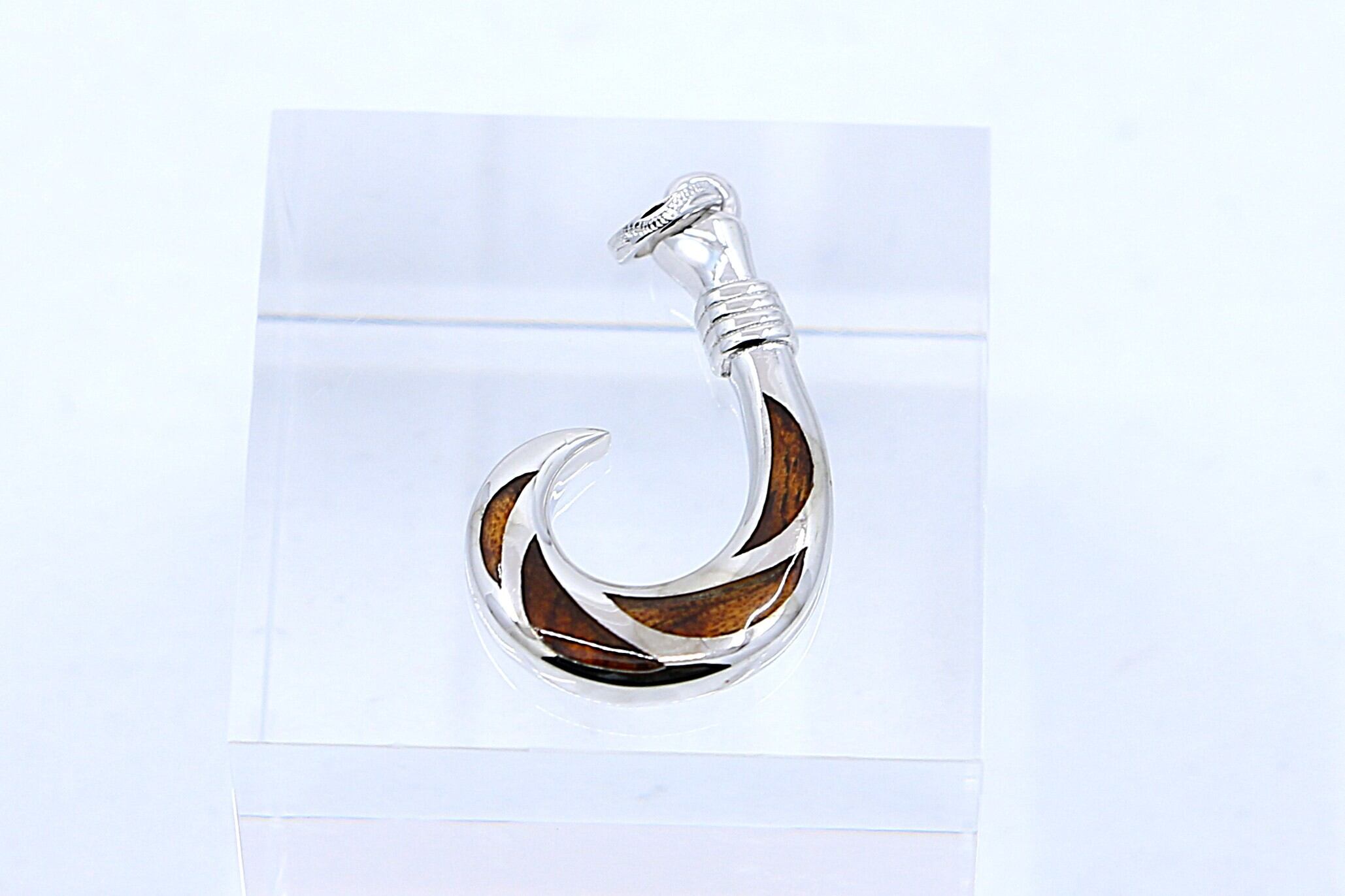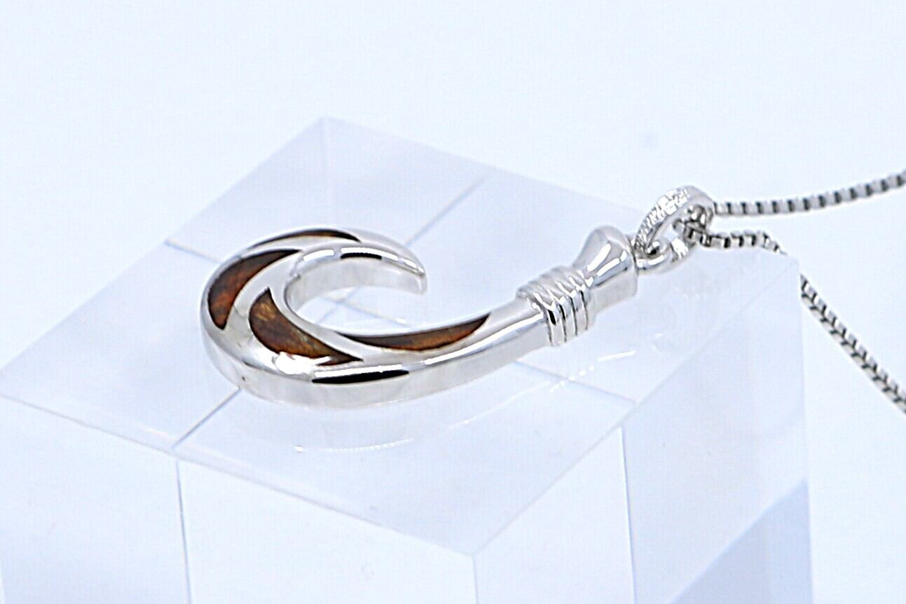 大きく存在感のあるフィッシュフックデザインのペンダントトップです。ハワイの貴重なコアウッドとシルバーの組み合わせが魅力のアイテムで、力強いフォルムとナチュラルな素材感が融合し、胸元に華やかさと個性をプラスします。