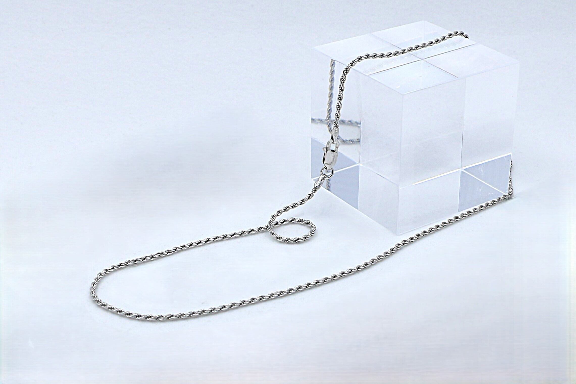 このロープチェーンは、繊細なツイストが美しく輝き、編み込まれたデザインが立体的な光沢を生み出す、シンプルながらも存在感のある仕上がりになっています。一本での着用はもちろん、ペンダントトップとの組み合わせにも最適な万能チェーンです。
