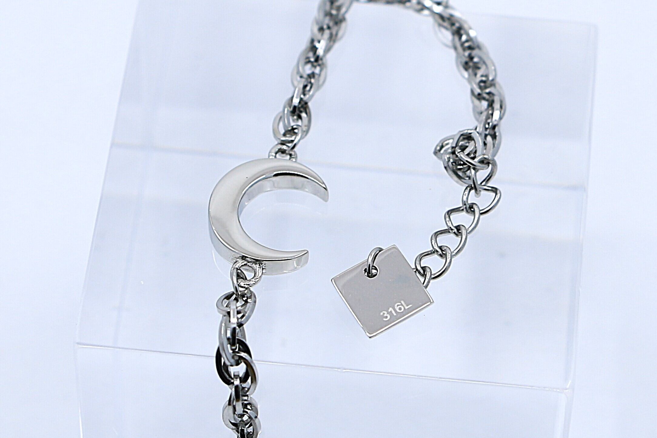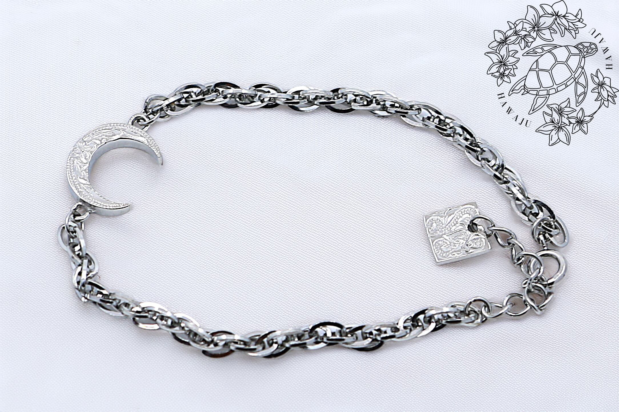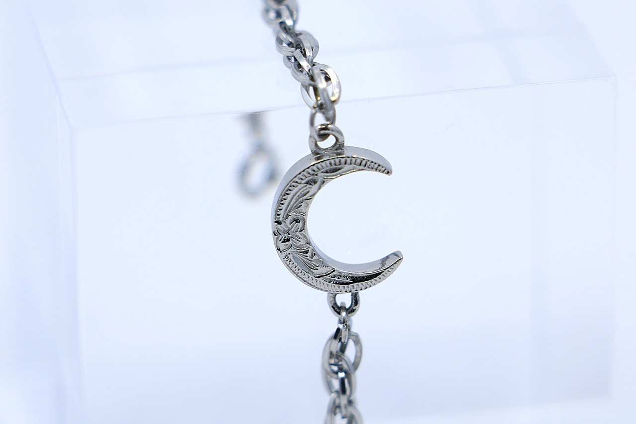 夜空にやさしく輝く「三日月(クレッセントムーン)モチーフ」をアクセントにあしらった、チェーンタイプのハワイアンブレスレットです。