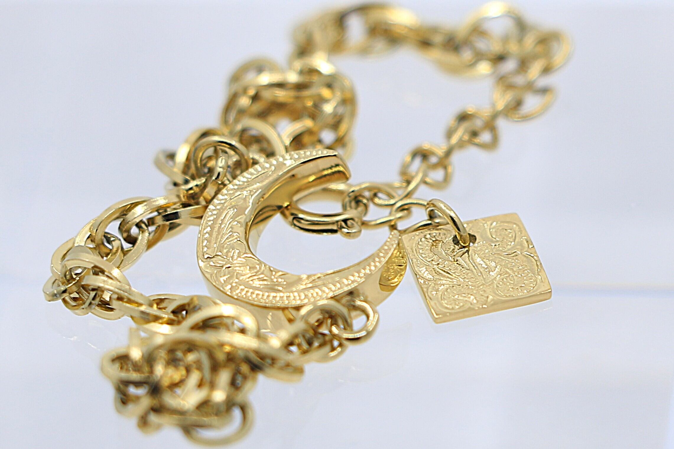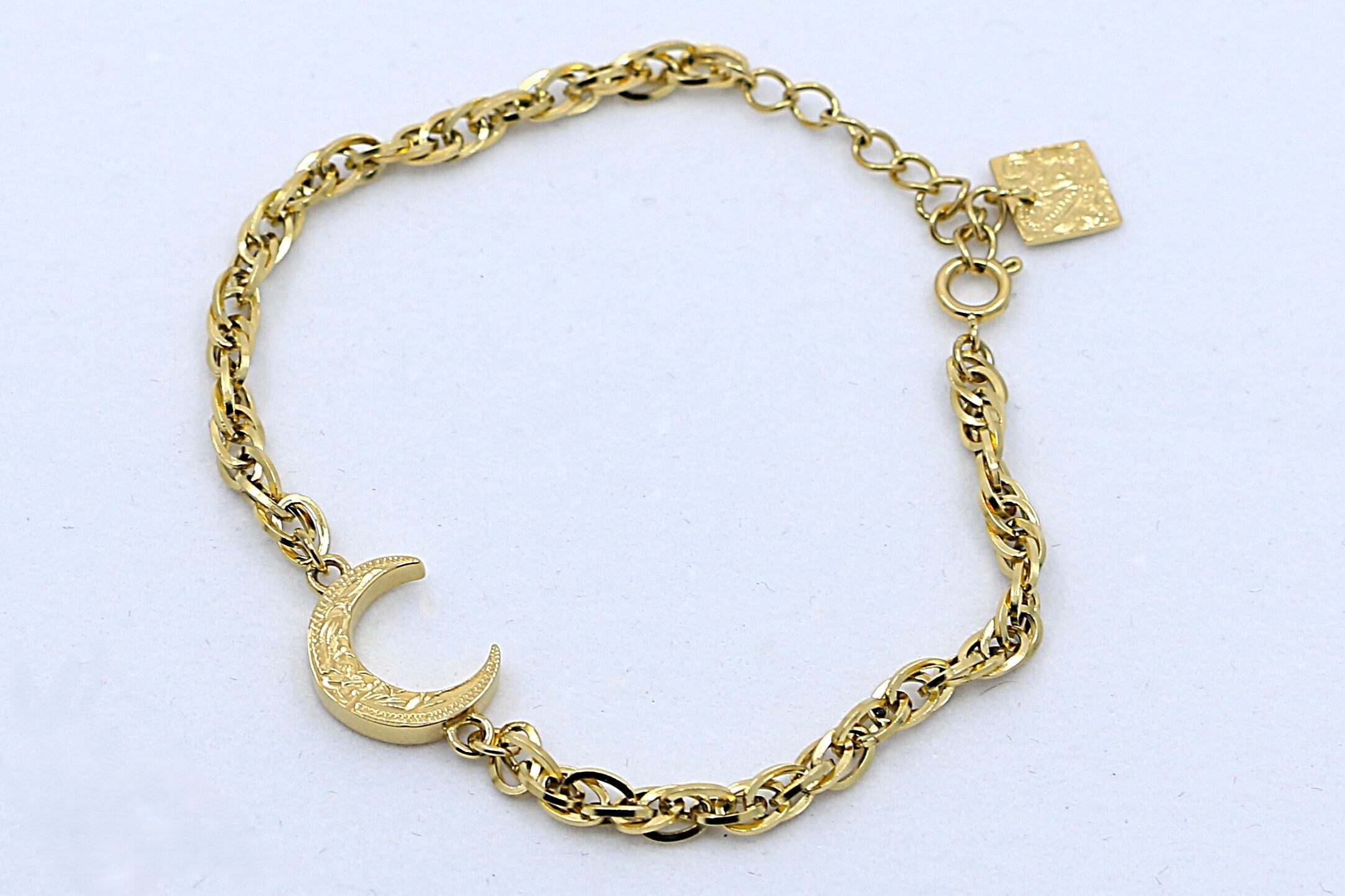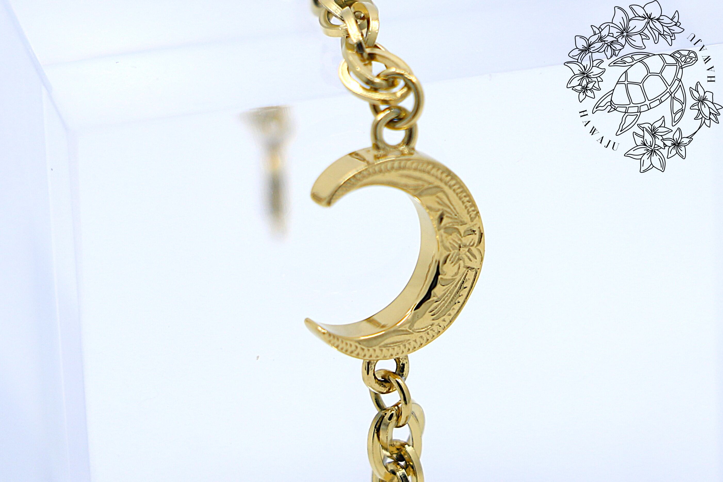 夜空にやさしく輝く「三日月(クレッセントムーン)モチーフ」をアクセントにあしらい、華やかなイエローゴールドカラーで仕上げた、チェーンタイプのハワイアンブレスレットです。