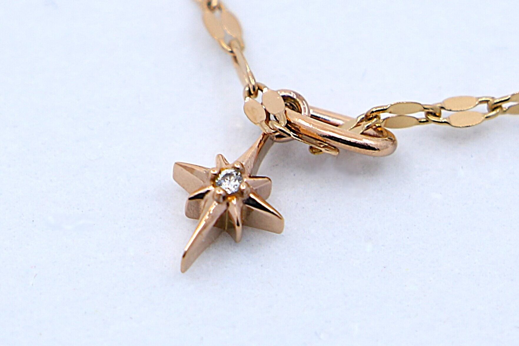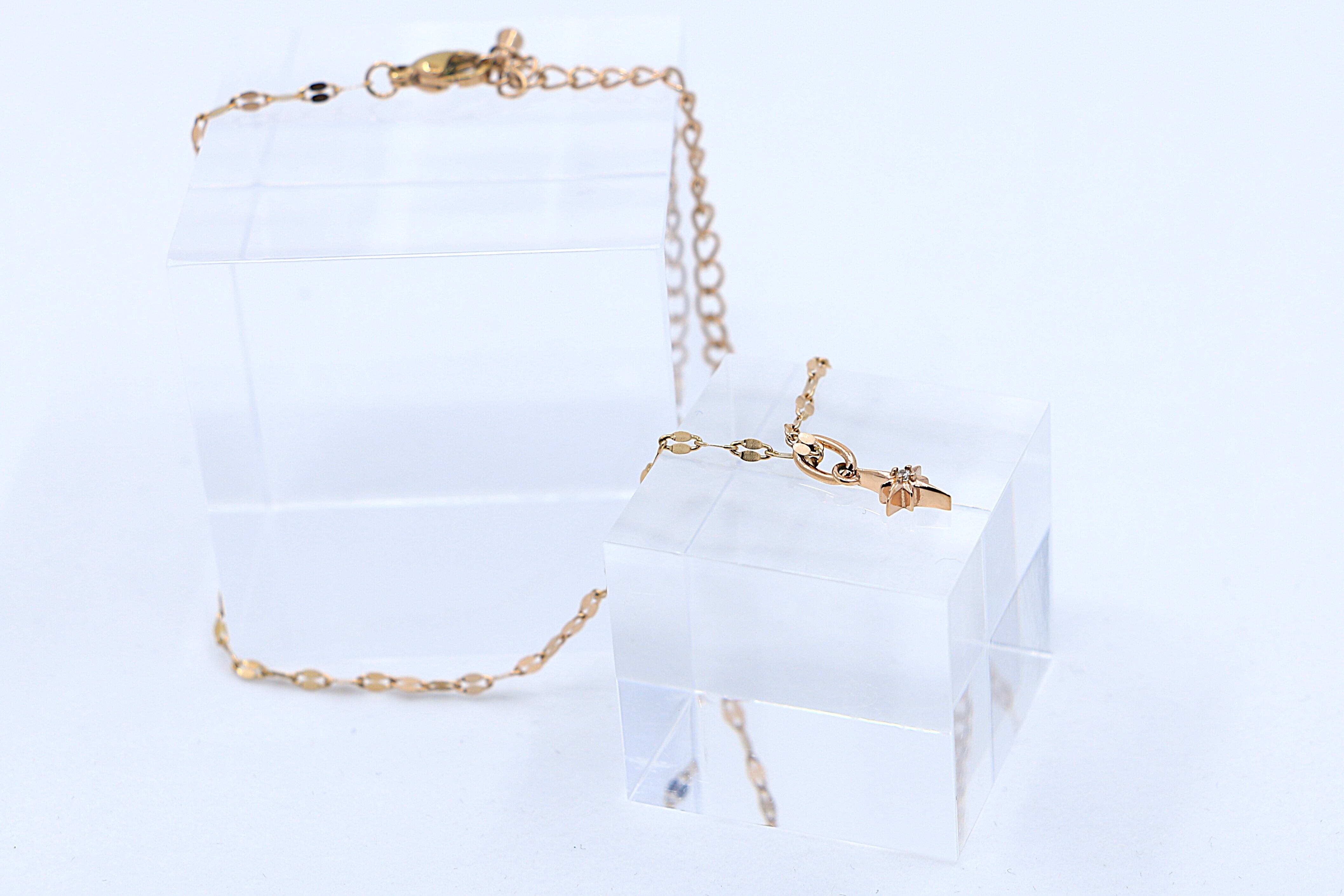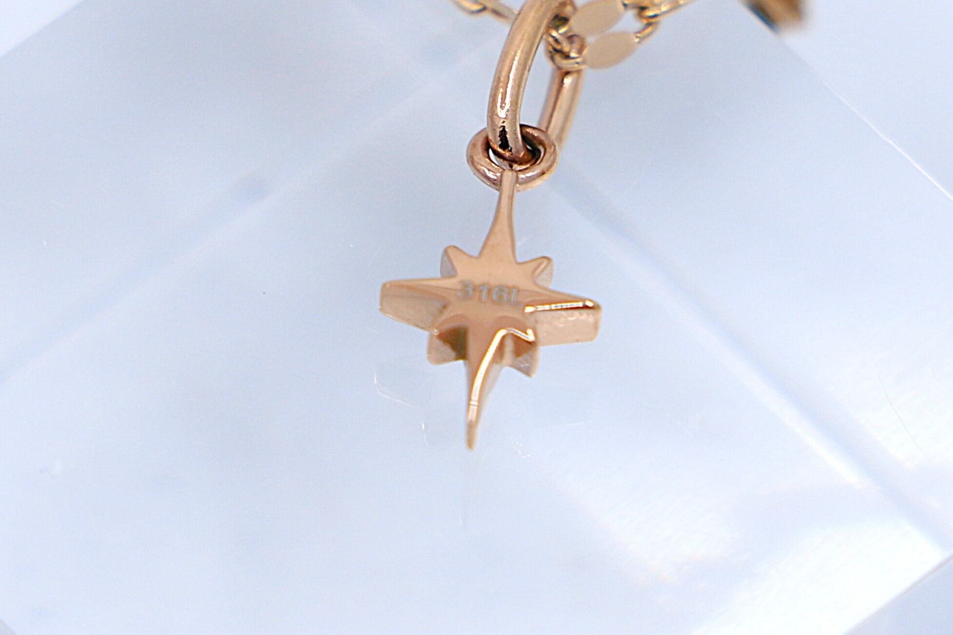 やさしく上品なピンクゴールドの輝きに、きらめくキュービックジルコニアのチャームが華やかに調和し、日常使いからリゾートスタイルまで幅広く活躍します。