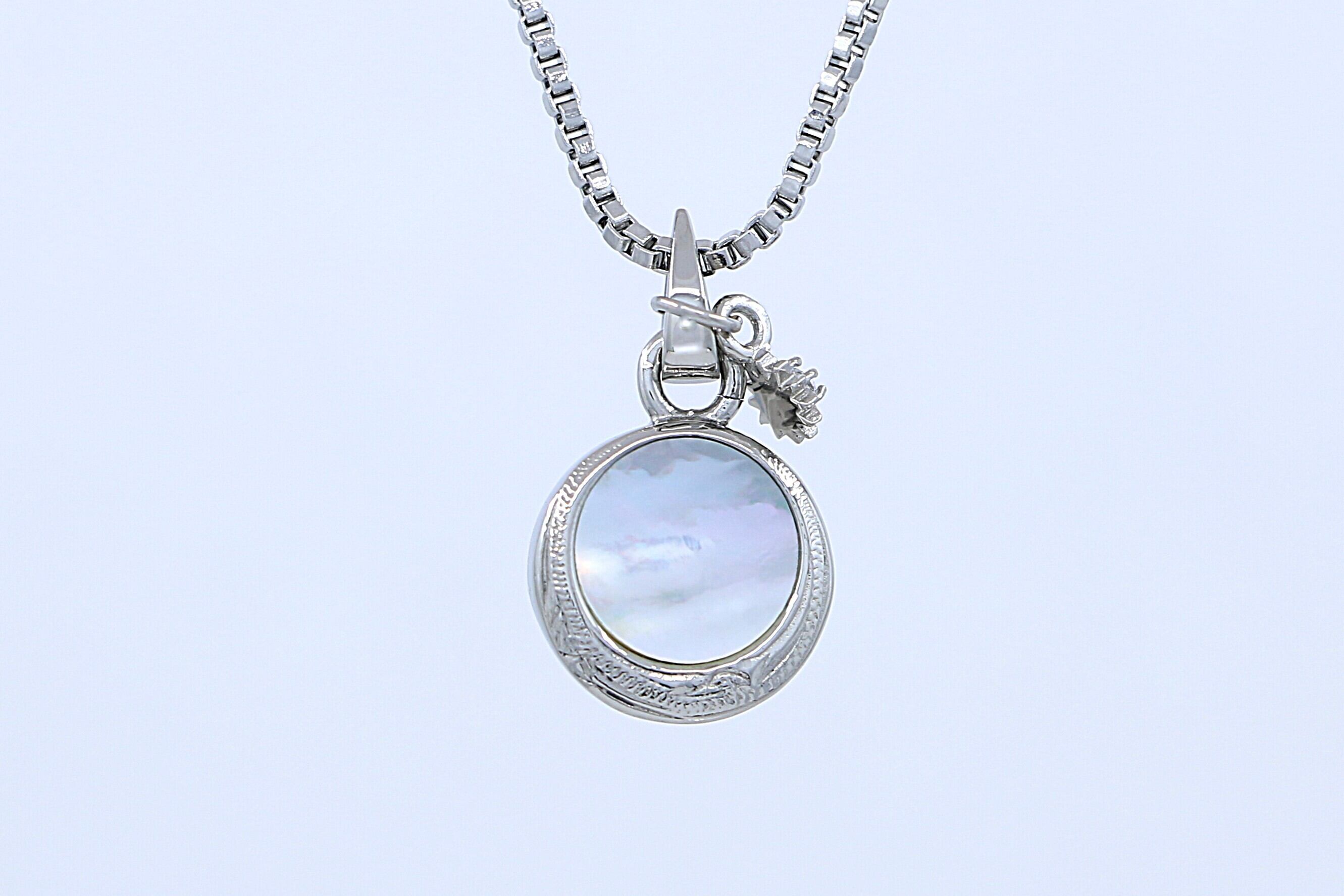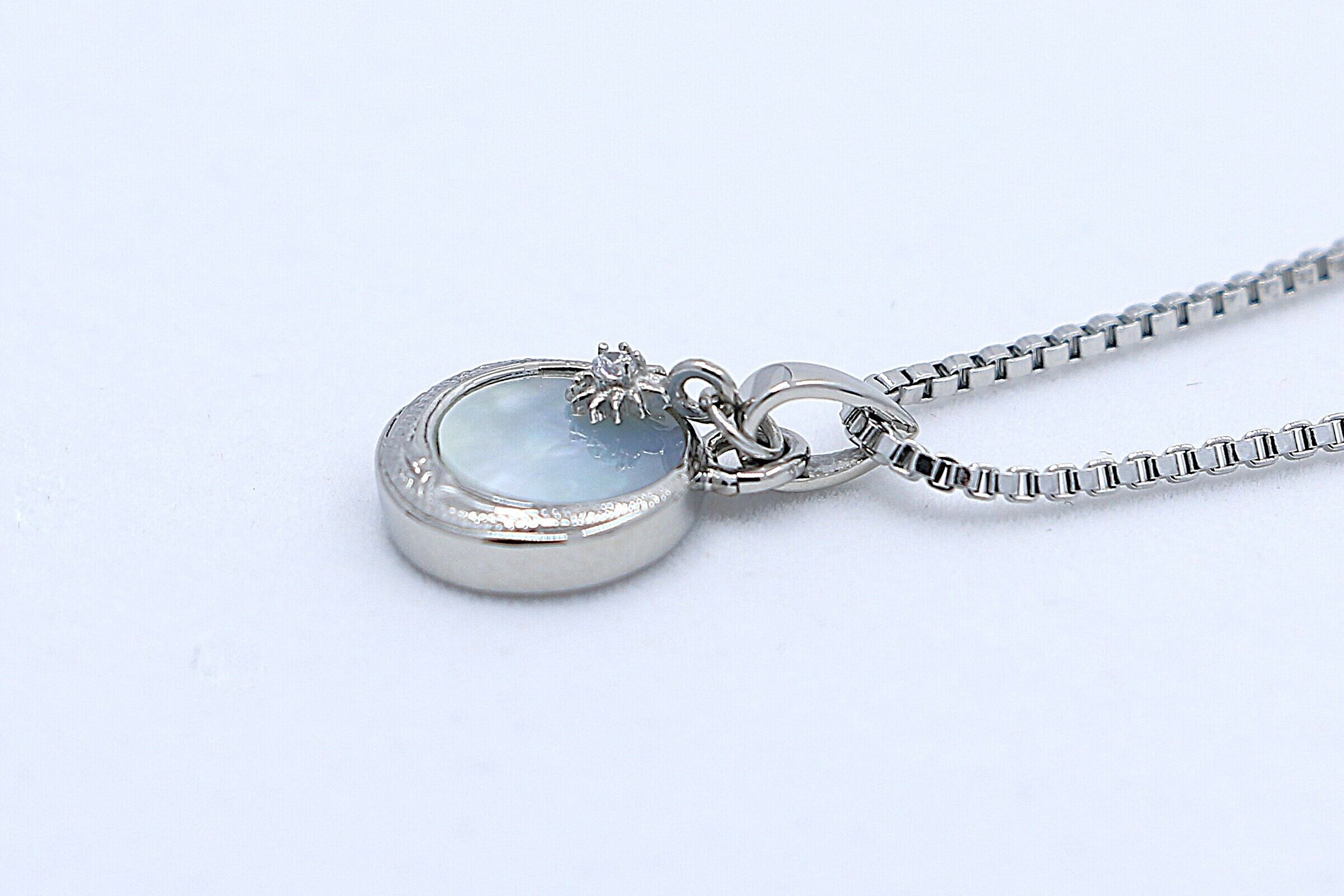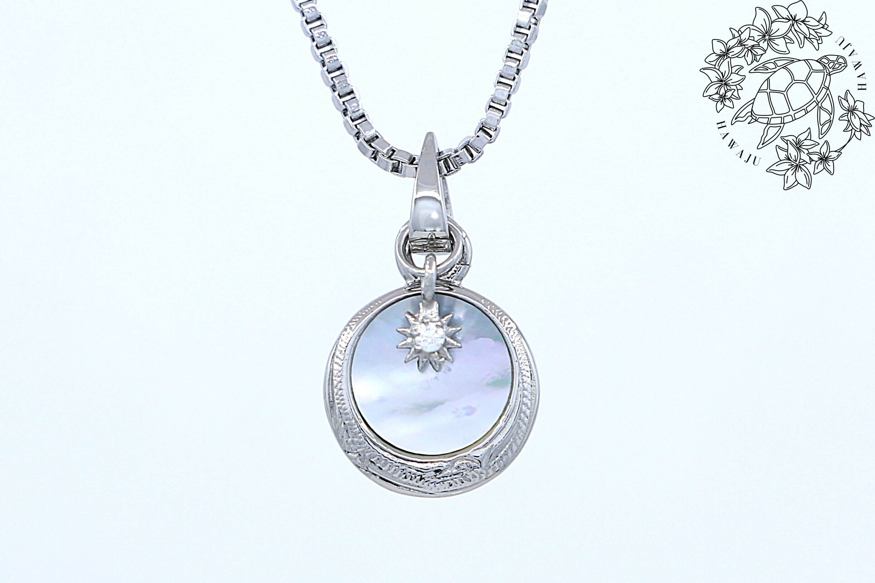 自然の美しさを映し出すシェルと、小さいながらもダイヤモンドのような輝きを放つキュービックジルコニアが織りなす華やかなペンダントトップです。耐久性と肌に優しいサージカルステンレスを使用しており、長く安心してご使用いただけます。