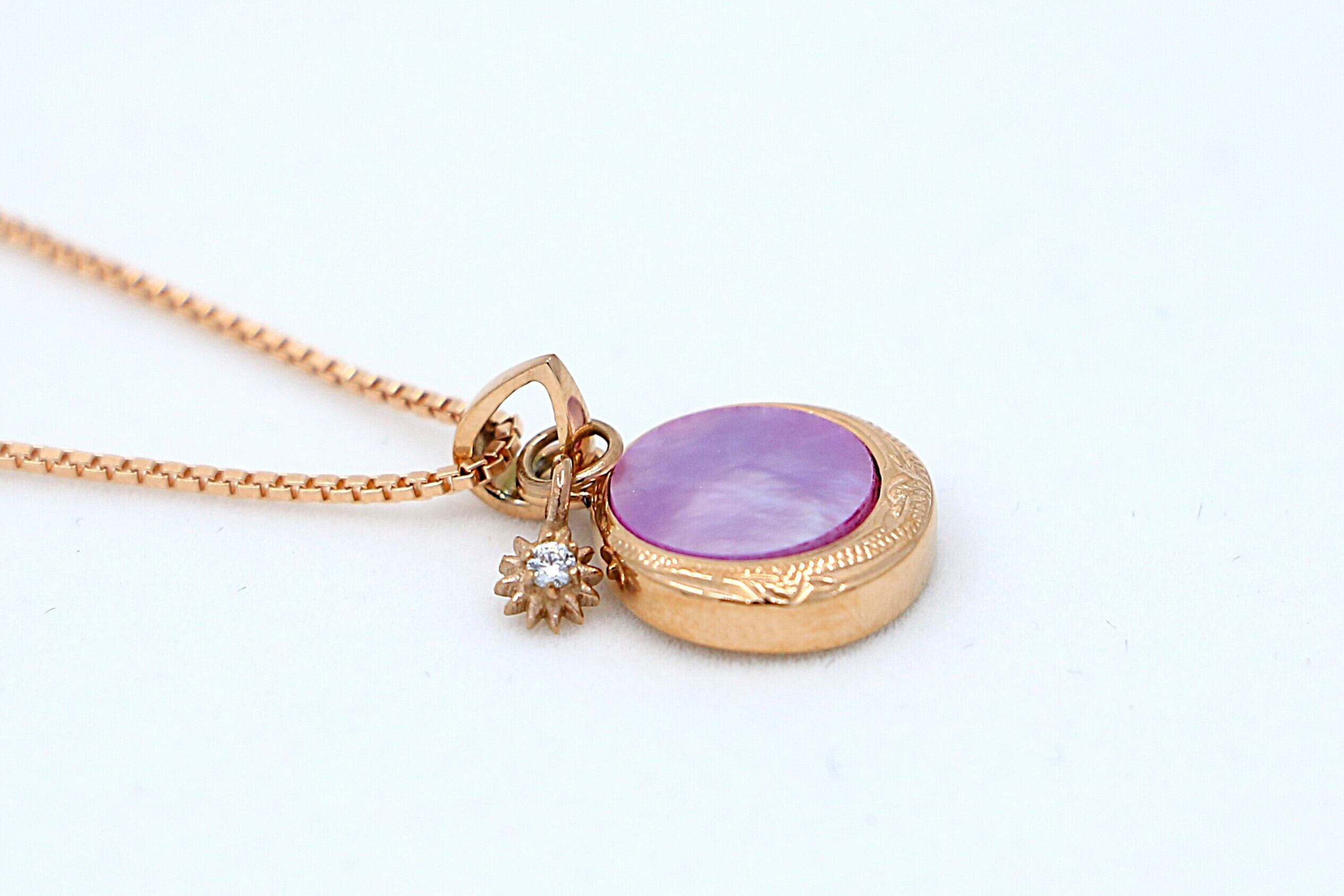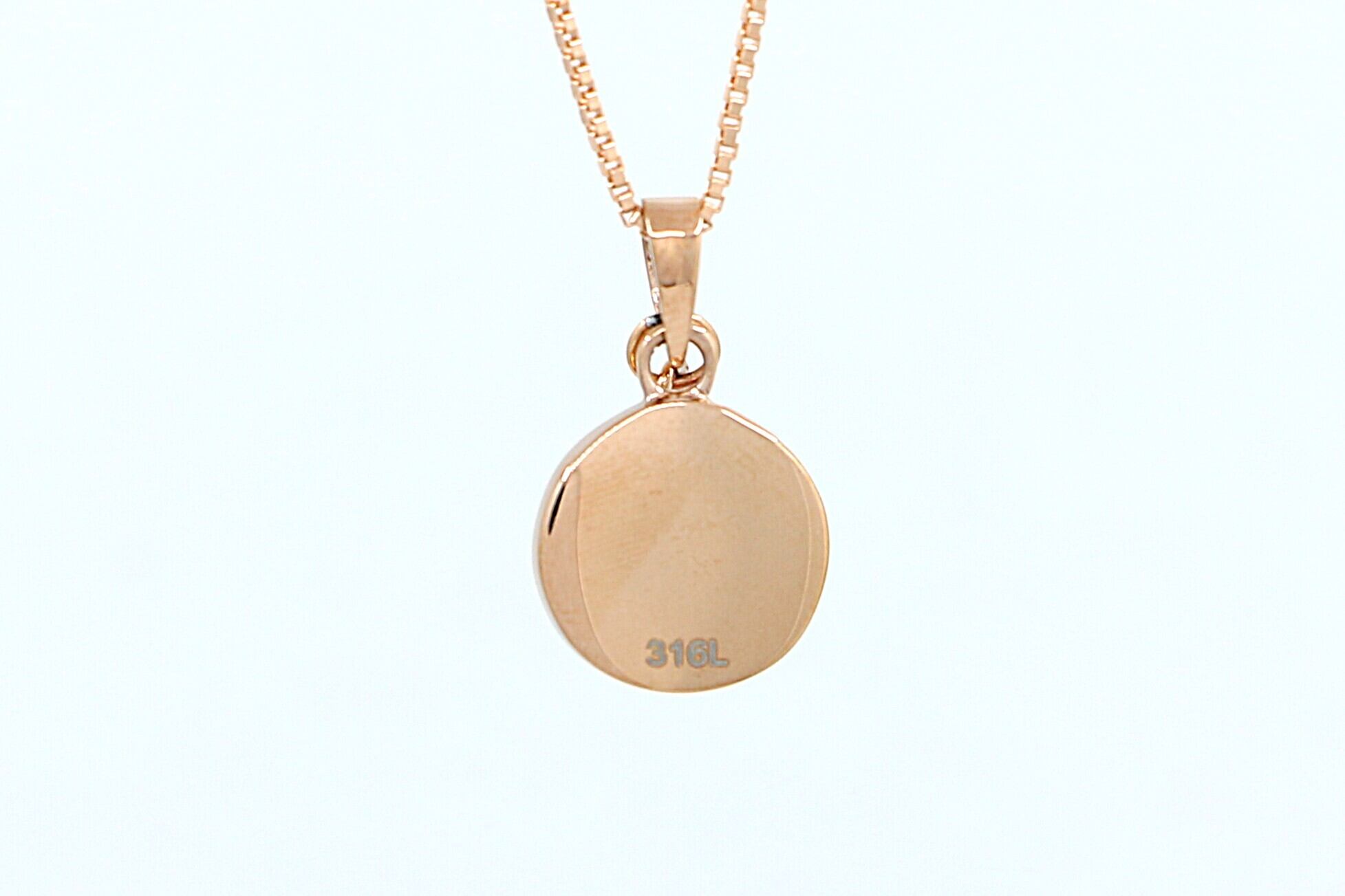 自然の美しさを映し出す、ピンクゴールドのやさしい輝きのシェルと、小さいながらもダイヤモンドのような輝きを放つキュービックジルコニアが織りなす華やかなペンダントトップです。耐久性と肌に優しいサージカルステンレスを使用しており、長く安心してご使用いただけます。