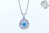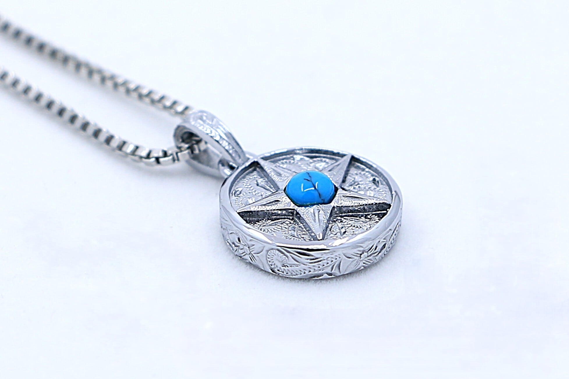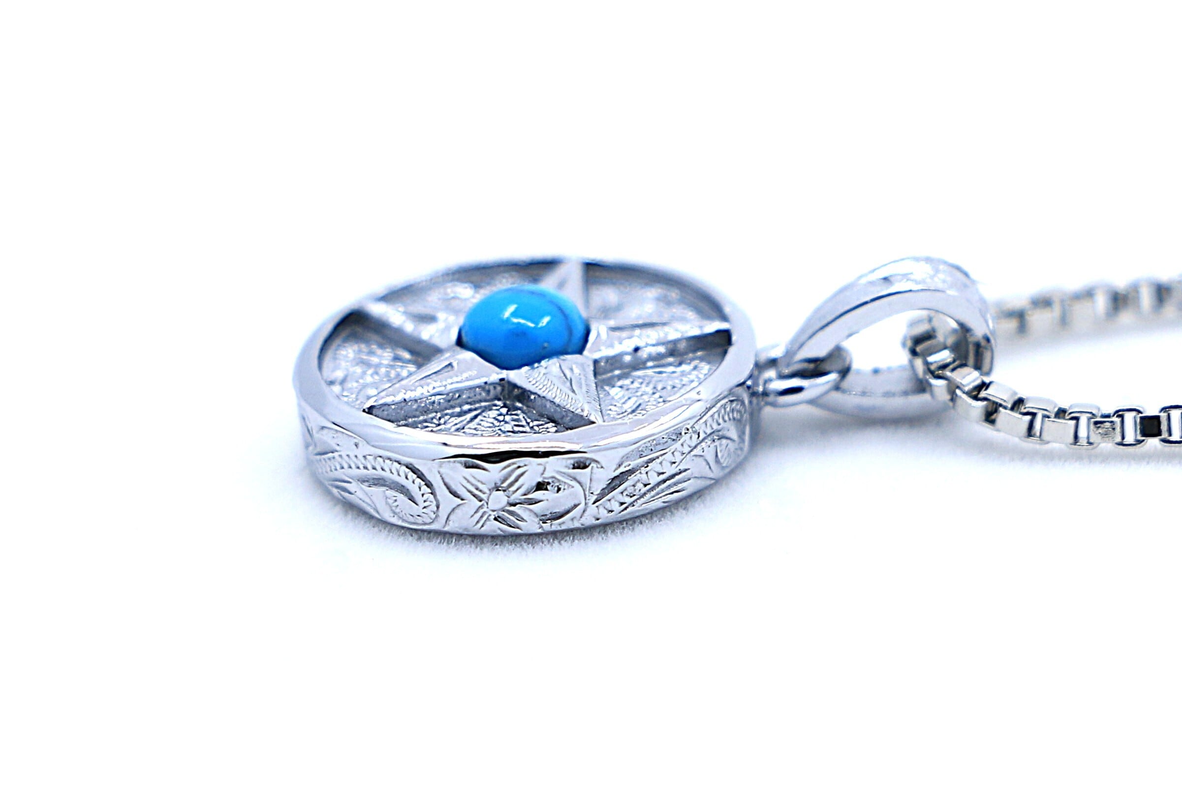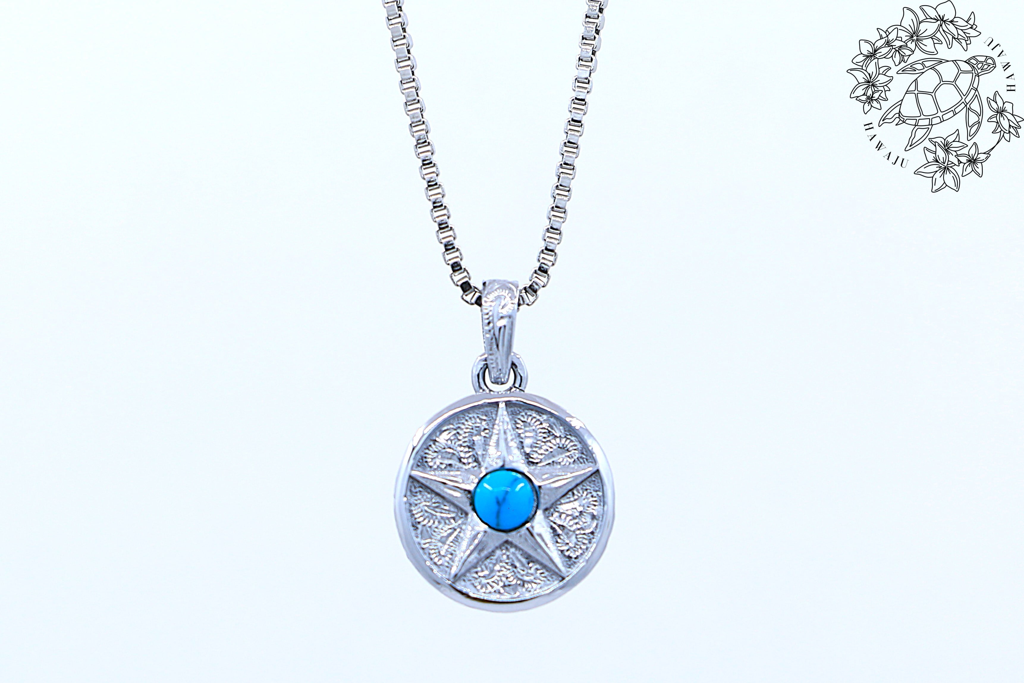 このペンダントトップは、スターコインデザインが施されたサージカルステンレス製です。中央には鮮やかなブルーのターコイズがセットされており、周囲には星形の模様が彫刻されています。ターコイズはその美しい青色が特徴で、見る人に海や空のような深い癒しをもたらします。