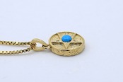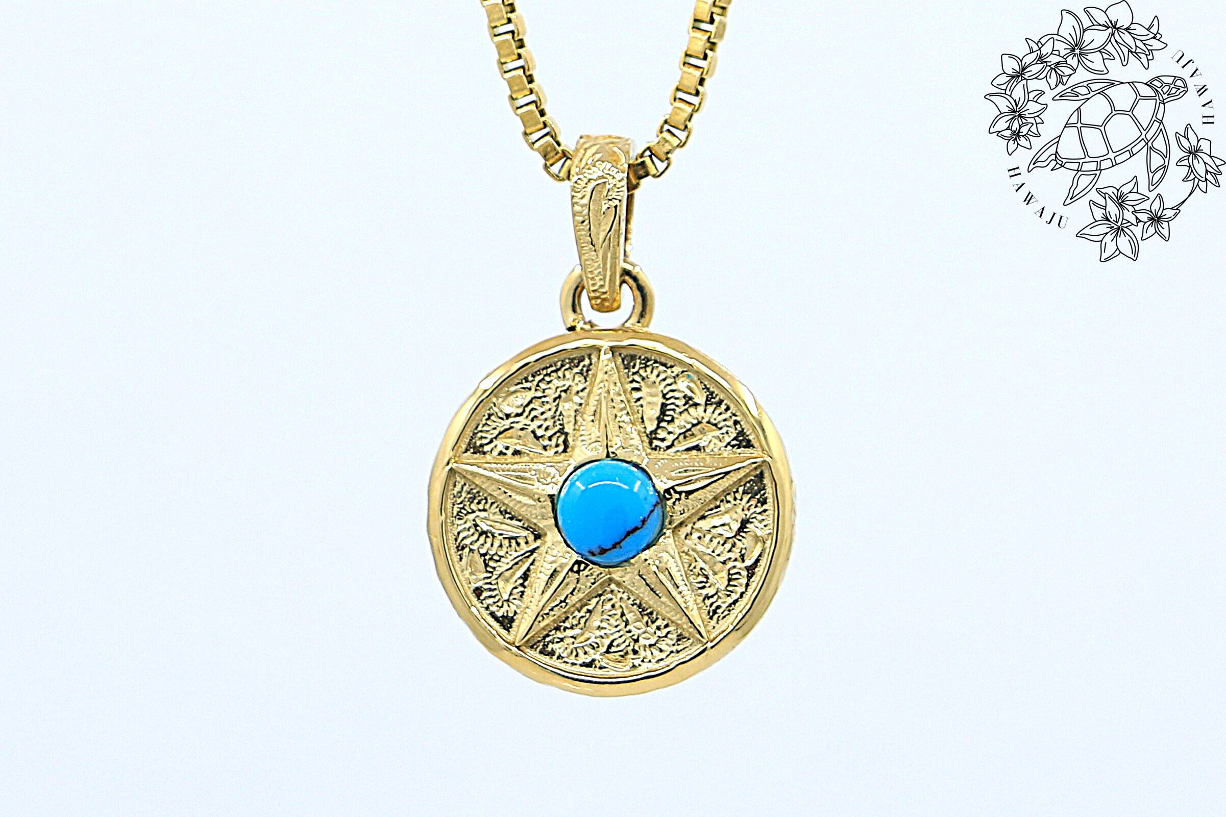 このペンダントトップは、スターコインデザインが施されたサージカルステンレス製です。中央には鮮やかなブルーのターコイズがセットされており、周囲には星形の模様が彫刻されています。ターコイズはその美しい青色が特徴で、見る人に海や空のような深い癒しをもたらします。