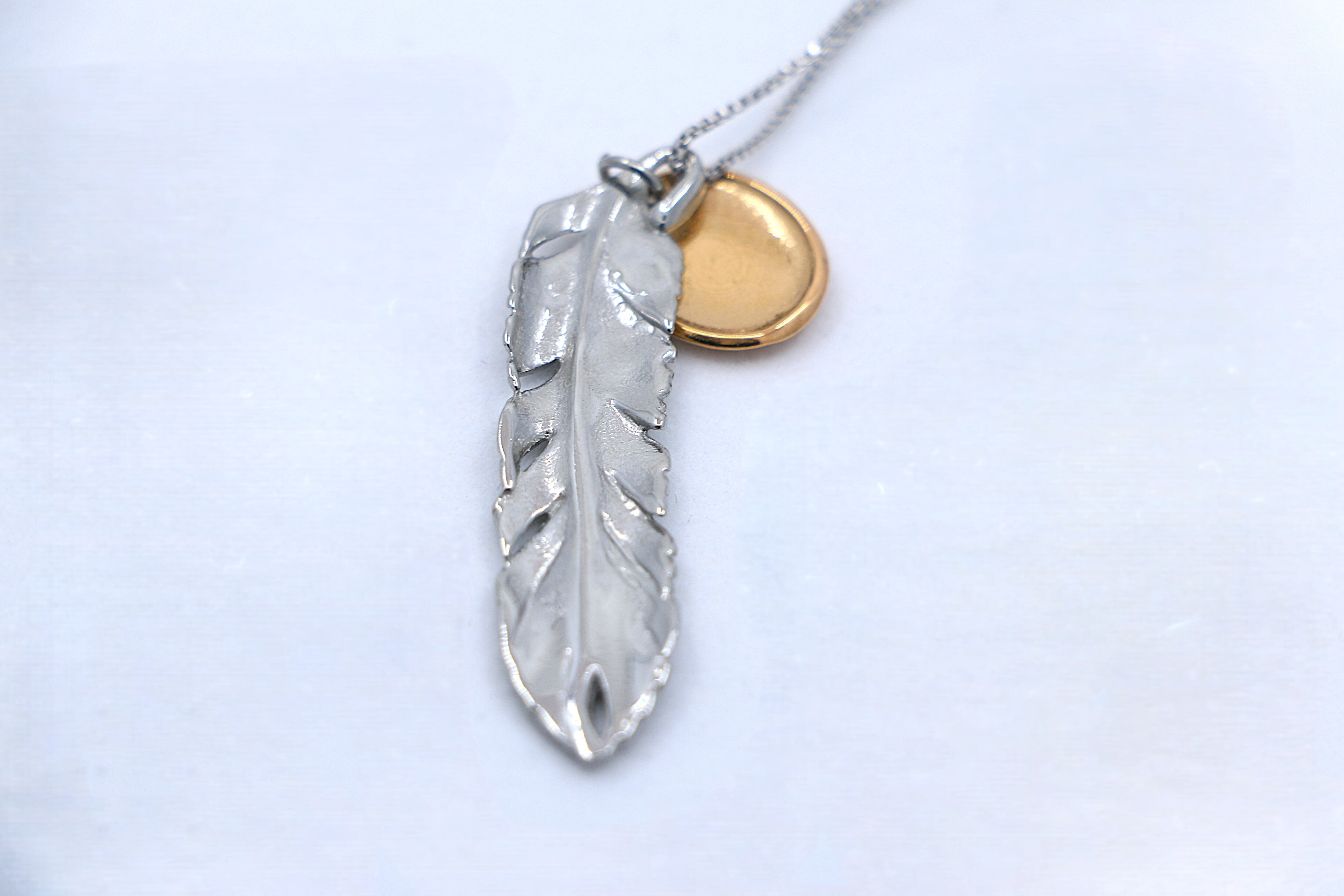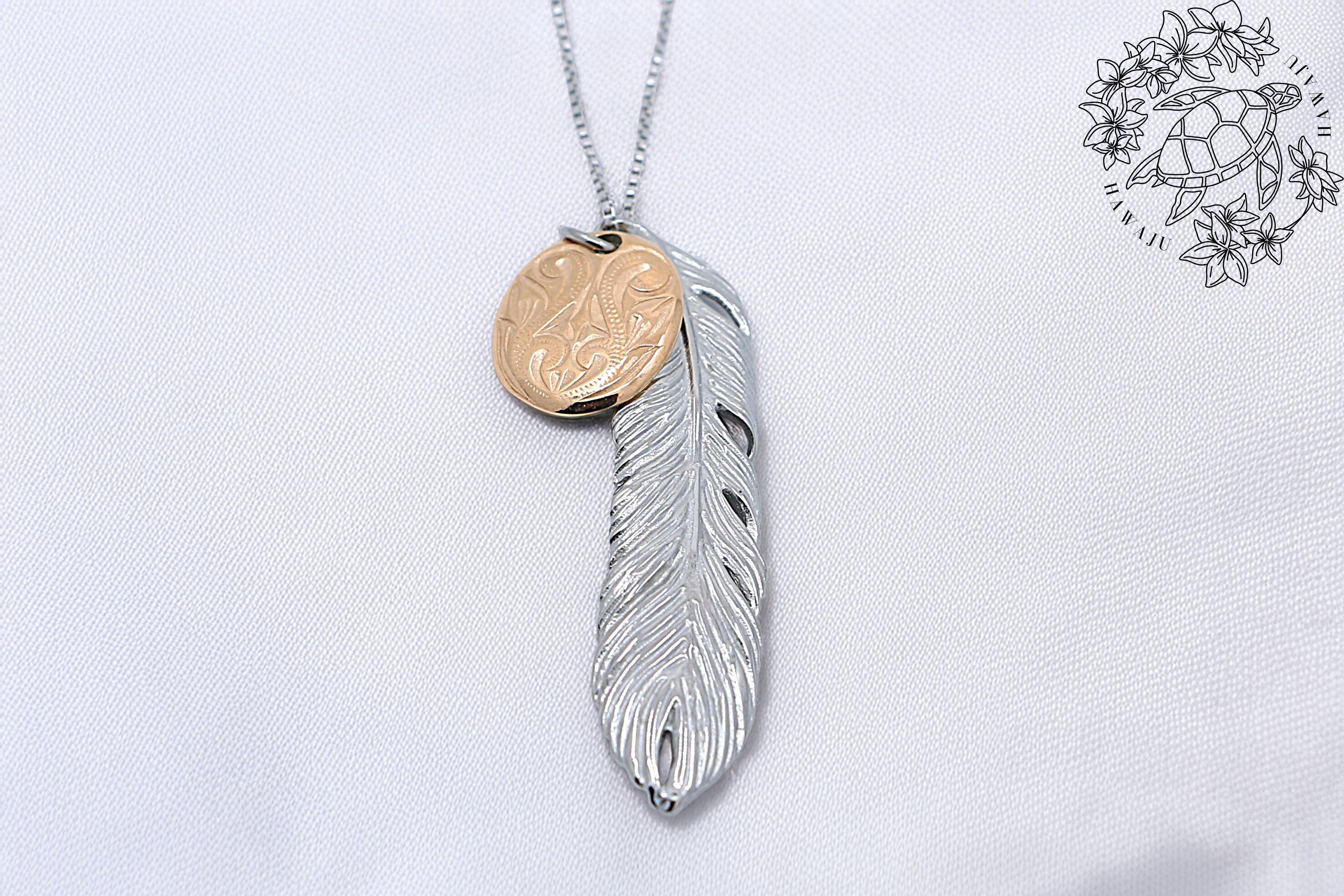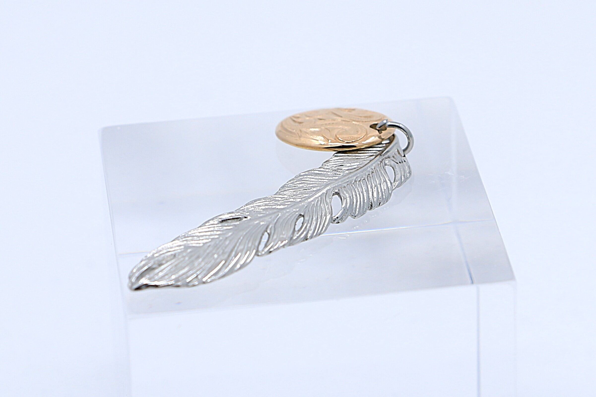 自由や軽やかさの象徴であるフェザーをモチーフにした、ハワイアンジュエリーデザインのペンダントトップです。精巧に彫刻されたフェザーにピンクゴールドのハワイアンプレートがあしらわれ、サージカルステンレスならではの輝きと高い耐久性を兼ね備えています。軽やかなつけ心地と上品な存在感で、日常のおしゃれをさりげなく引き立てます。