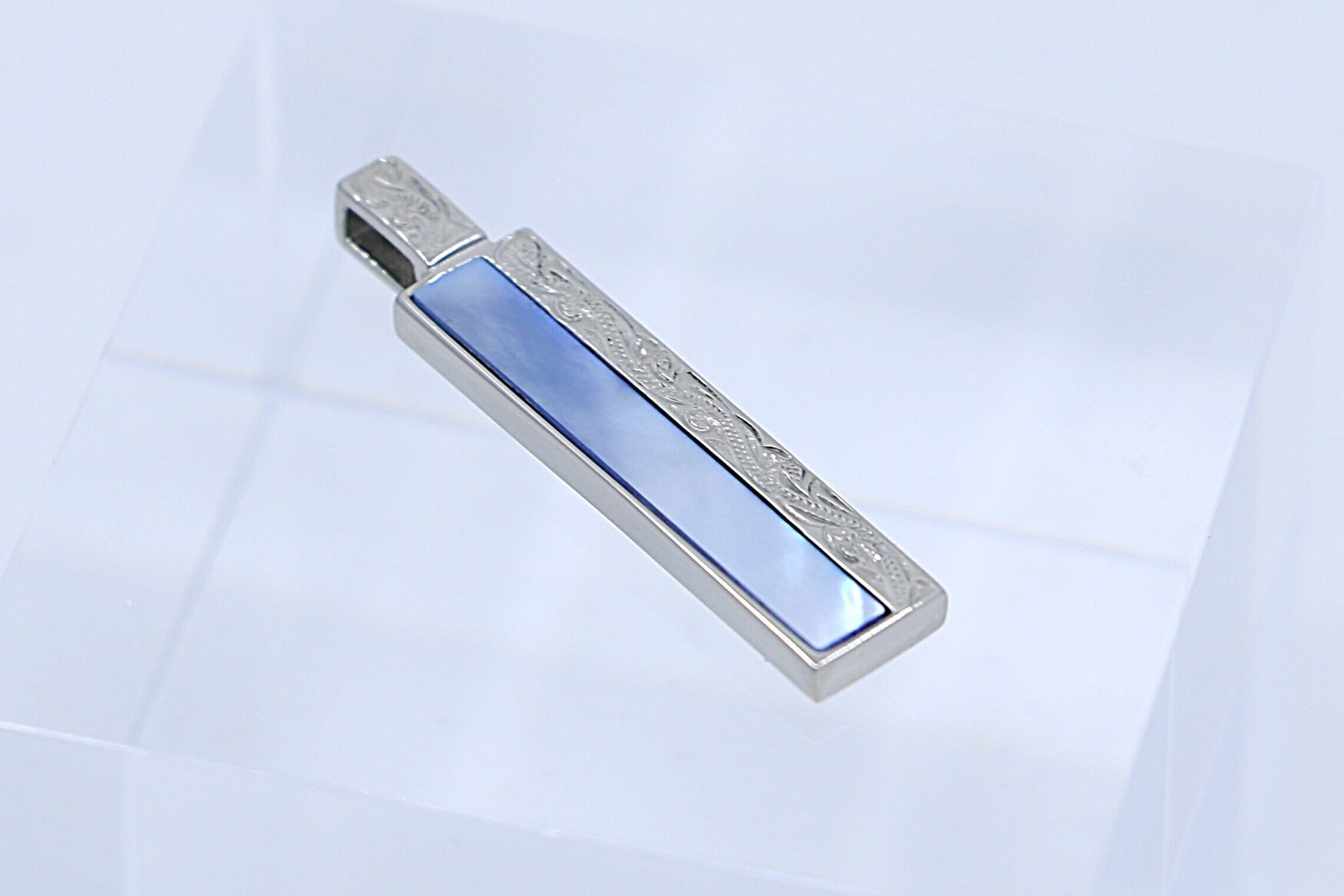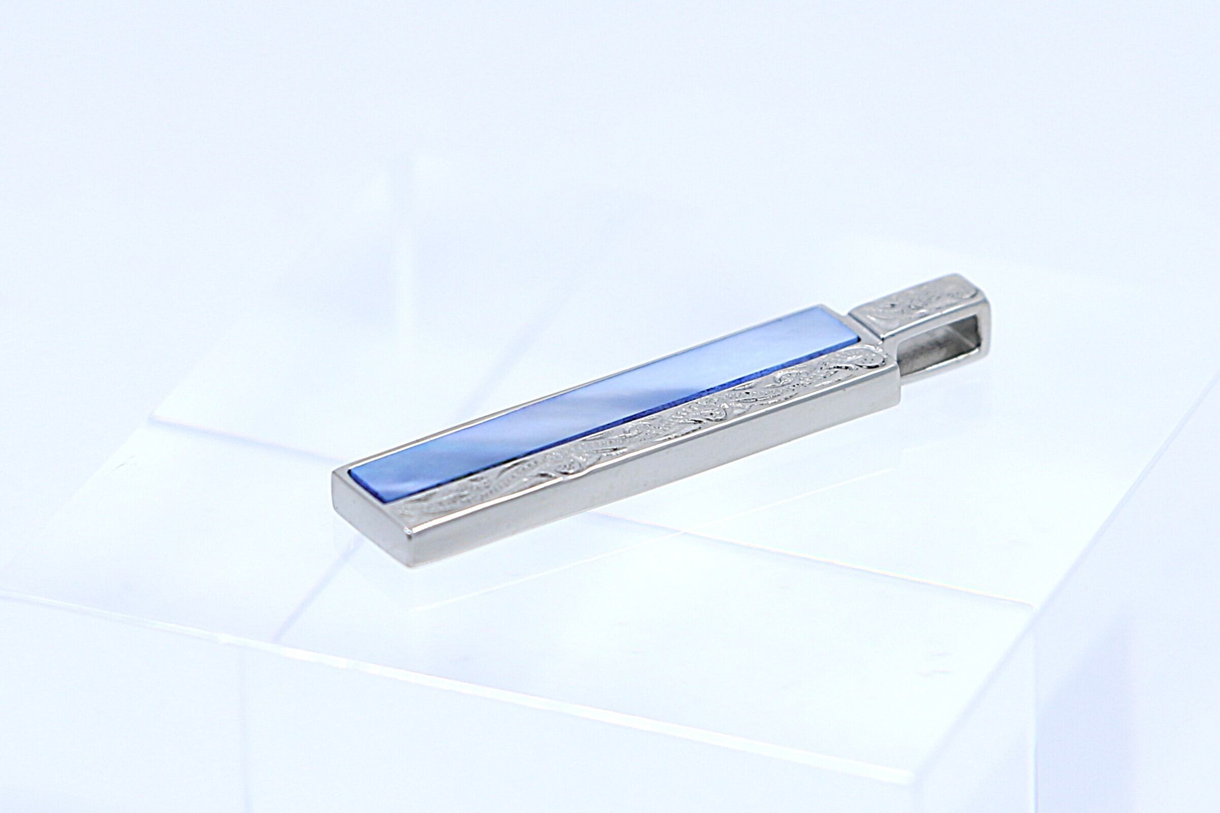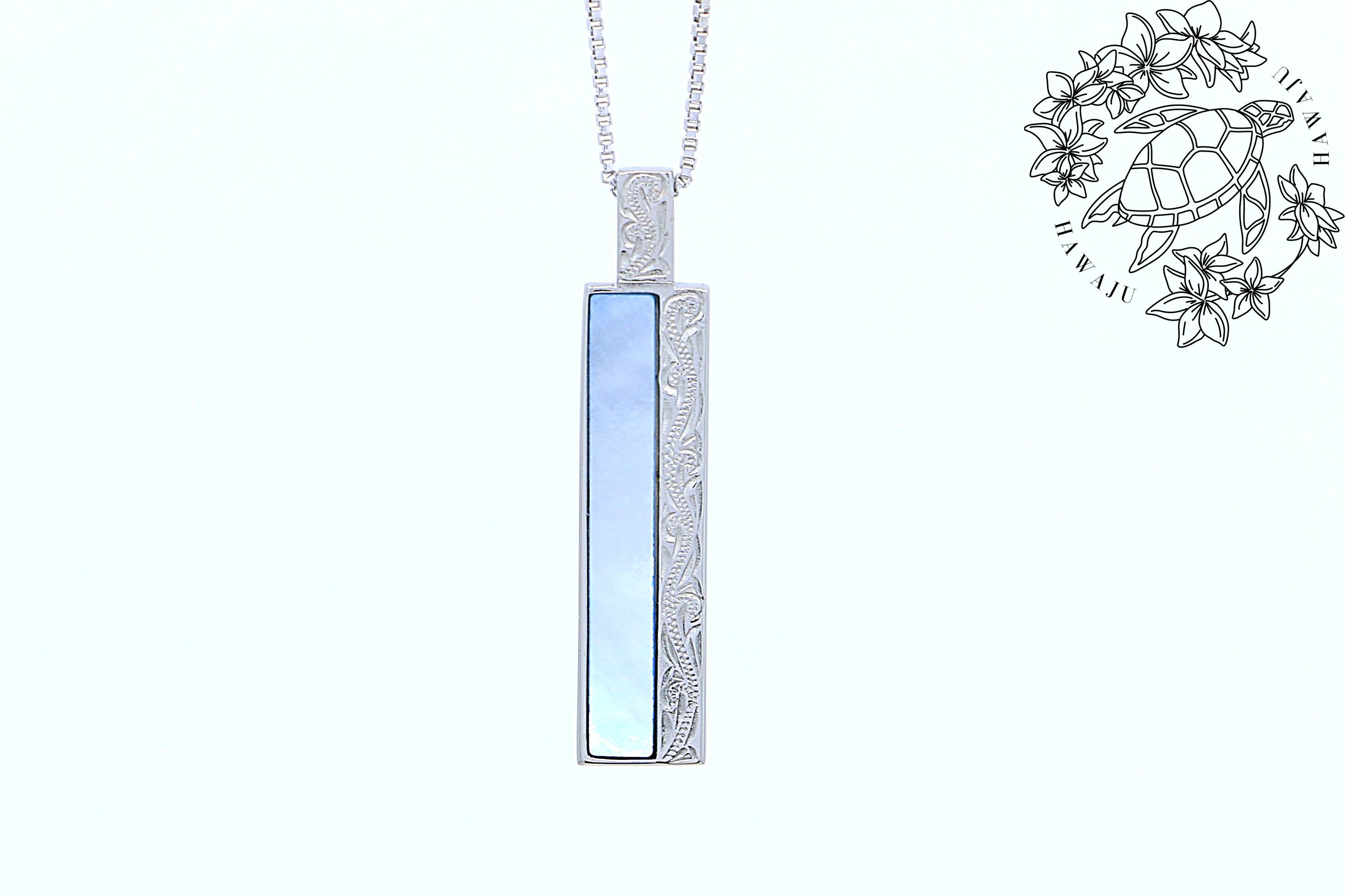 このペンダントトップは、ハワイアンジュエリーのデザインが施されたロングバー型で、形状はシンプルでありながらもエレガントで、どんなスタイルにも合わせやすいです。シェルがインレイされており、自然の美しさを引き立てます。