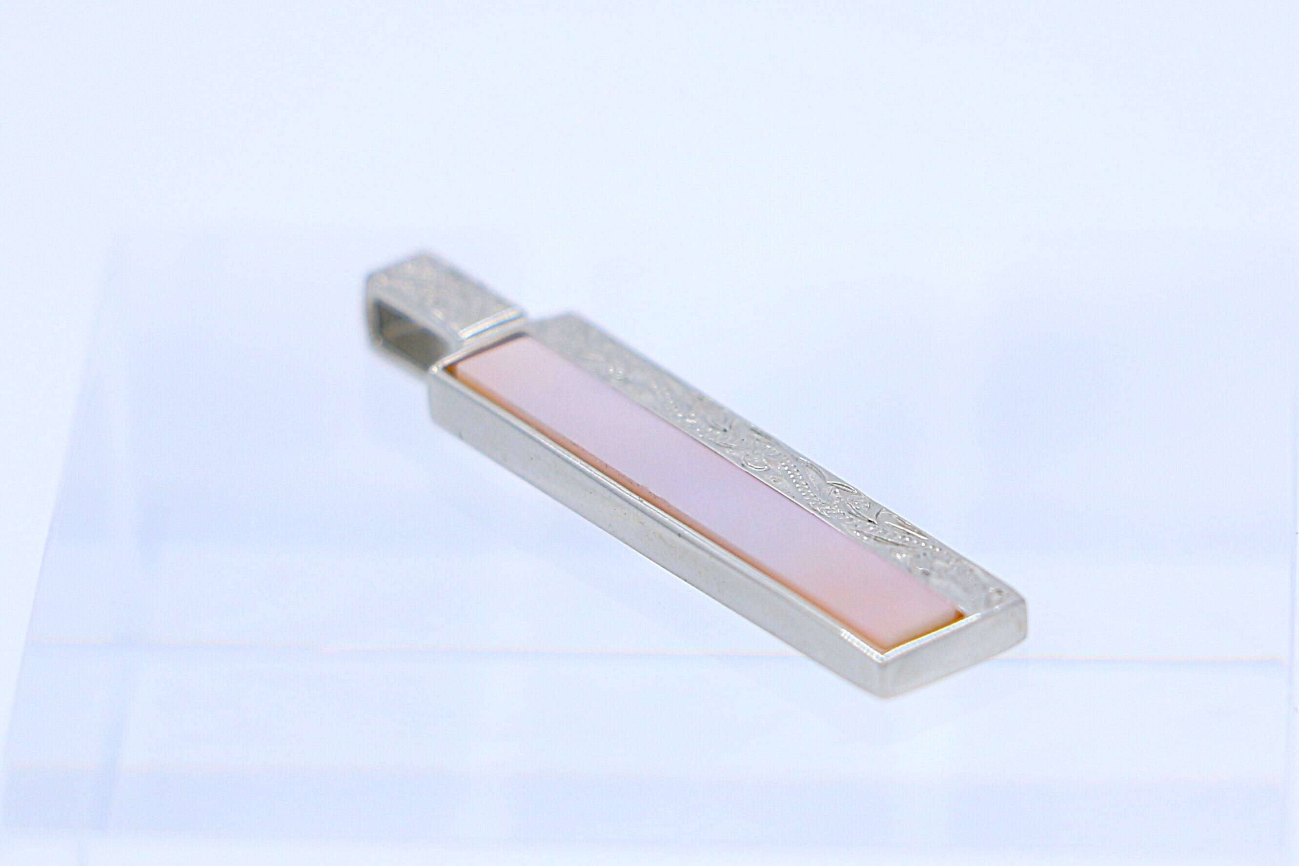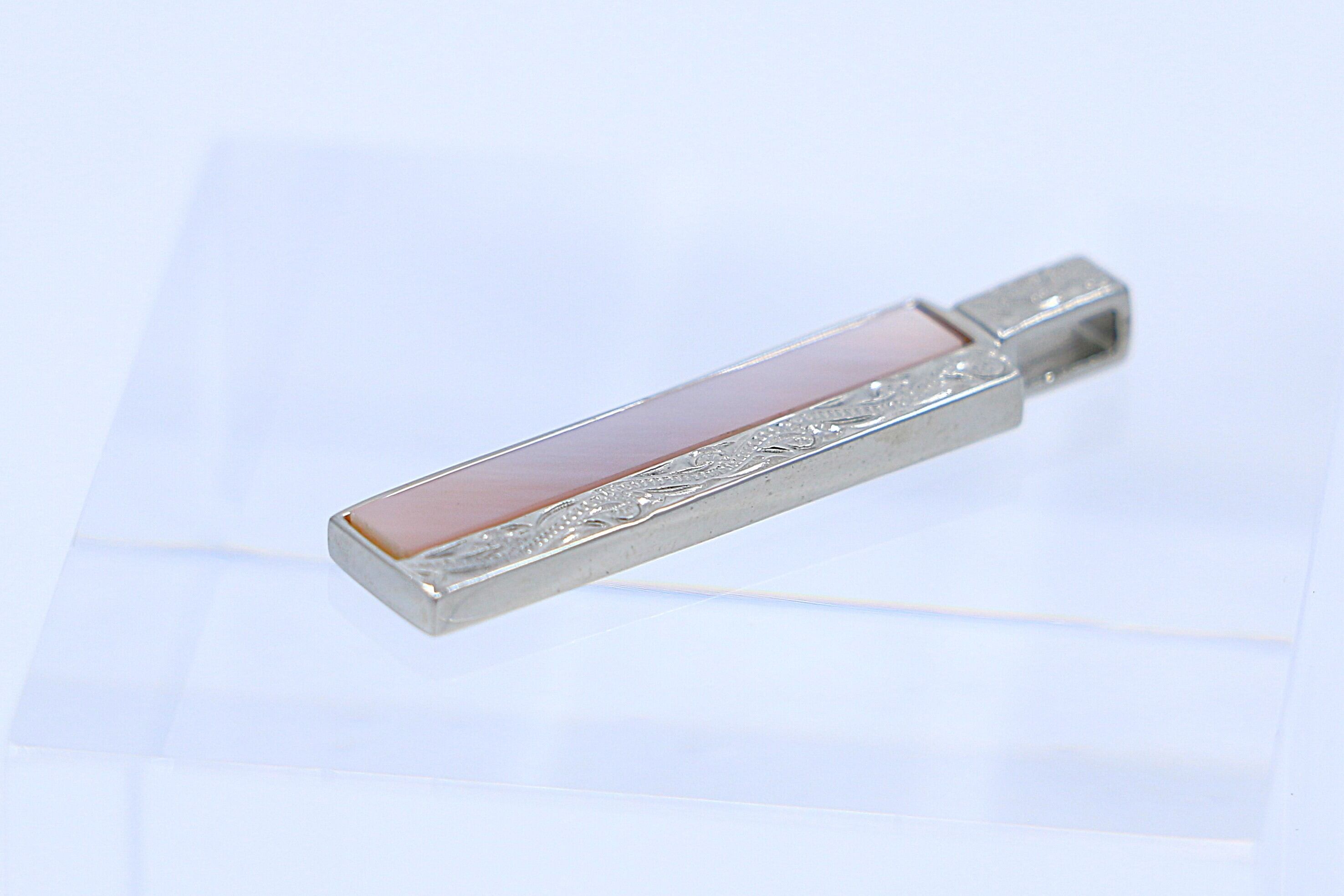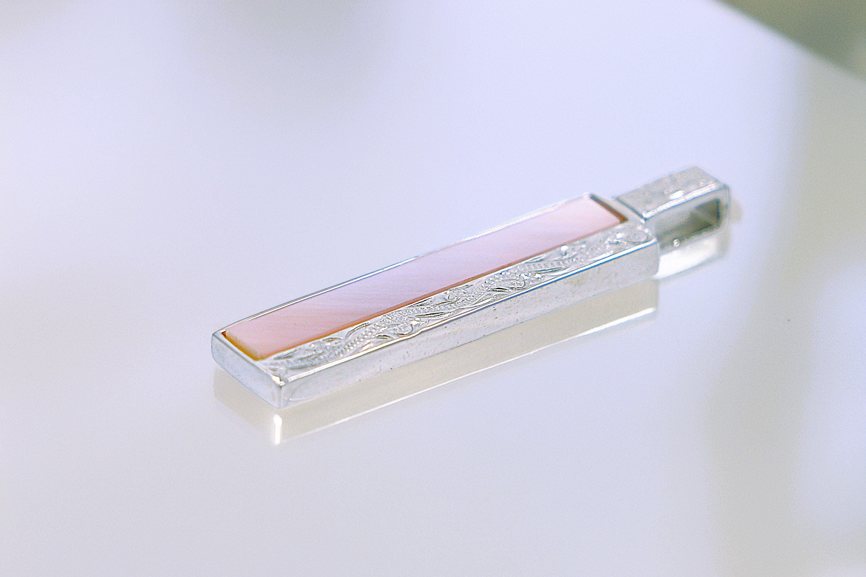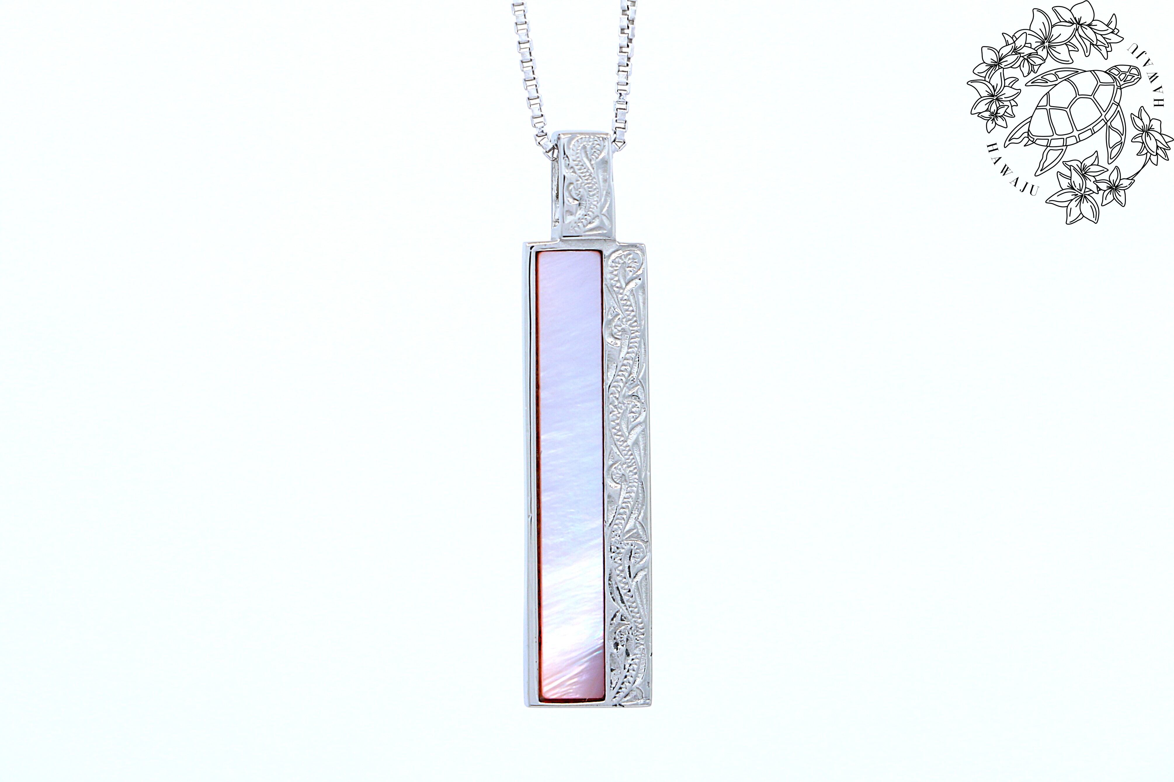 このペンダントトップは、ハワイアンジュエリーのデザインが施されたロングバー型で、形状はシンプルでありながらもエレガントで、どんなスタイルにも合わせやすいです。シェルがインレイされており、自然の美しさを引き立てます。