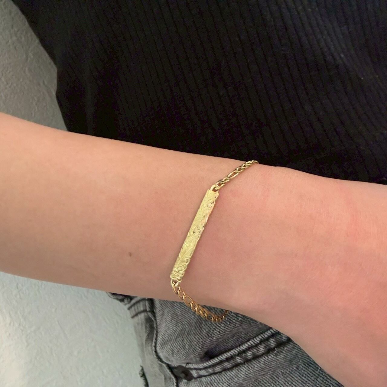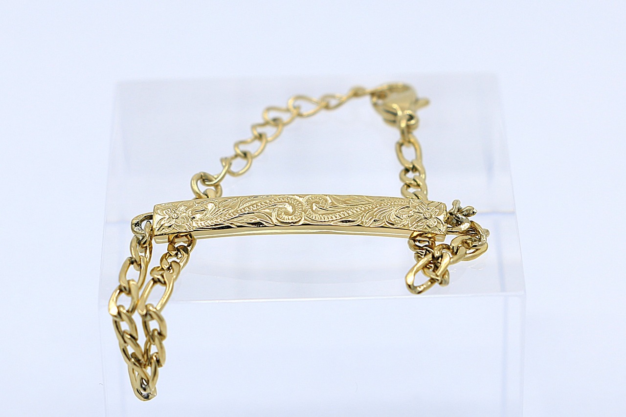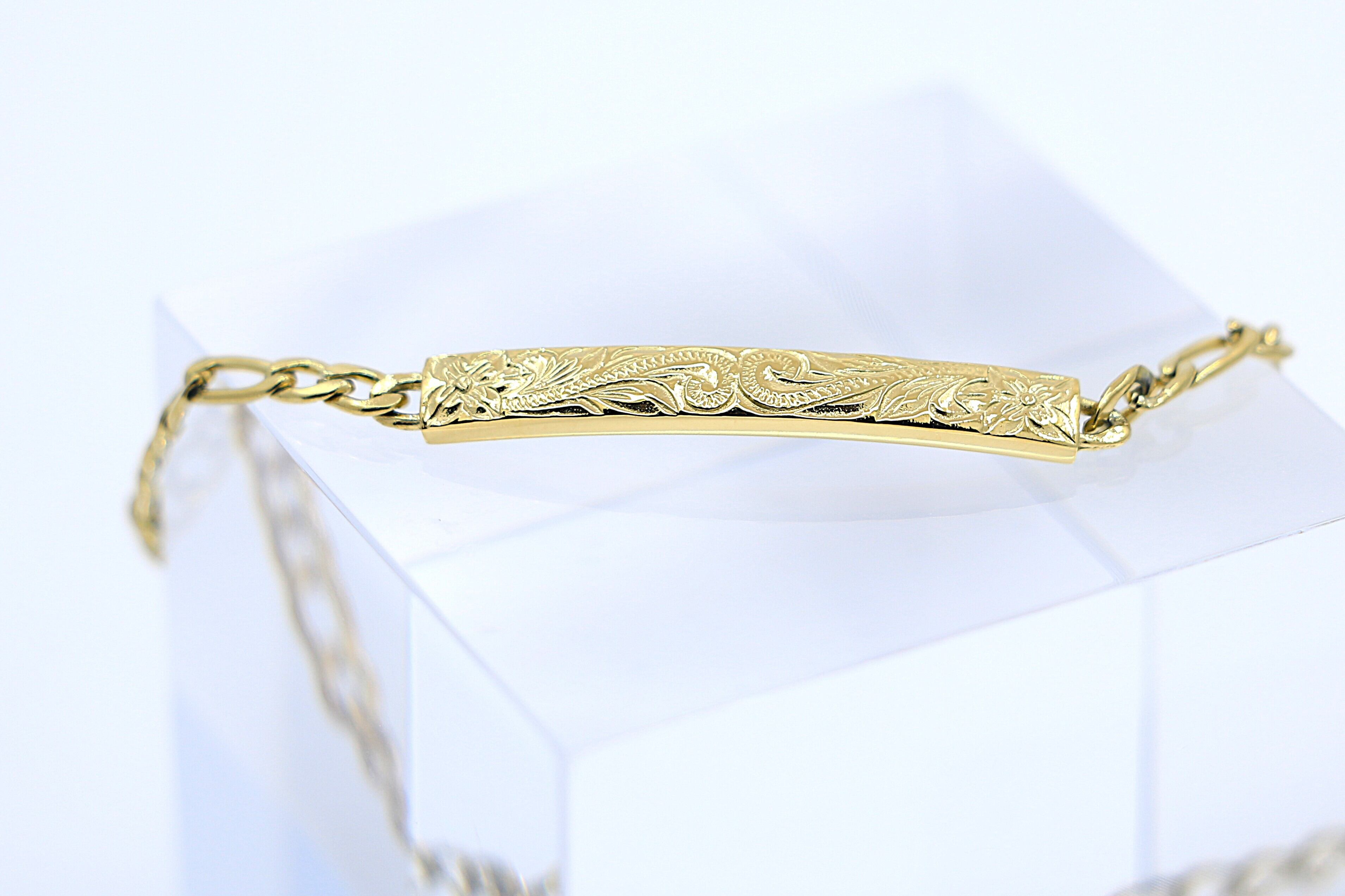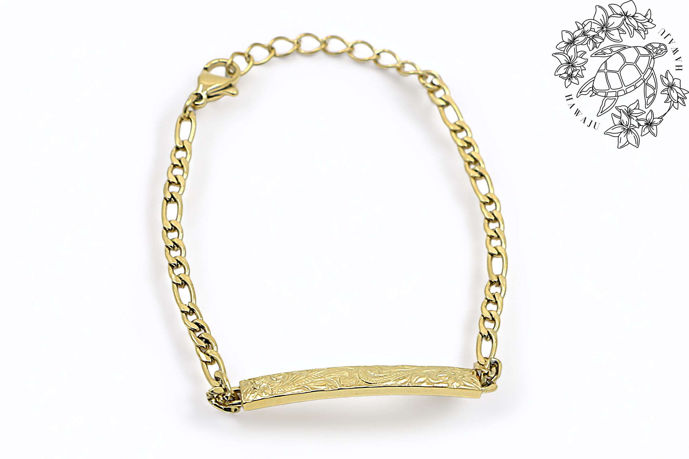 イエローゴールドの上品な輝きが魅力の、チェーンタイプのハワイアンスタイルのブレスレットです。ハワイ伝統模様でもあるヘリテイジデザインが、深い意味と美しさを手首に添えます。医療用にも使われるサージカルステンレス素材で、肌にやさしく、長く愛用できるアクセサリーです。