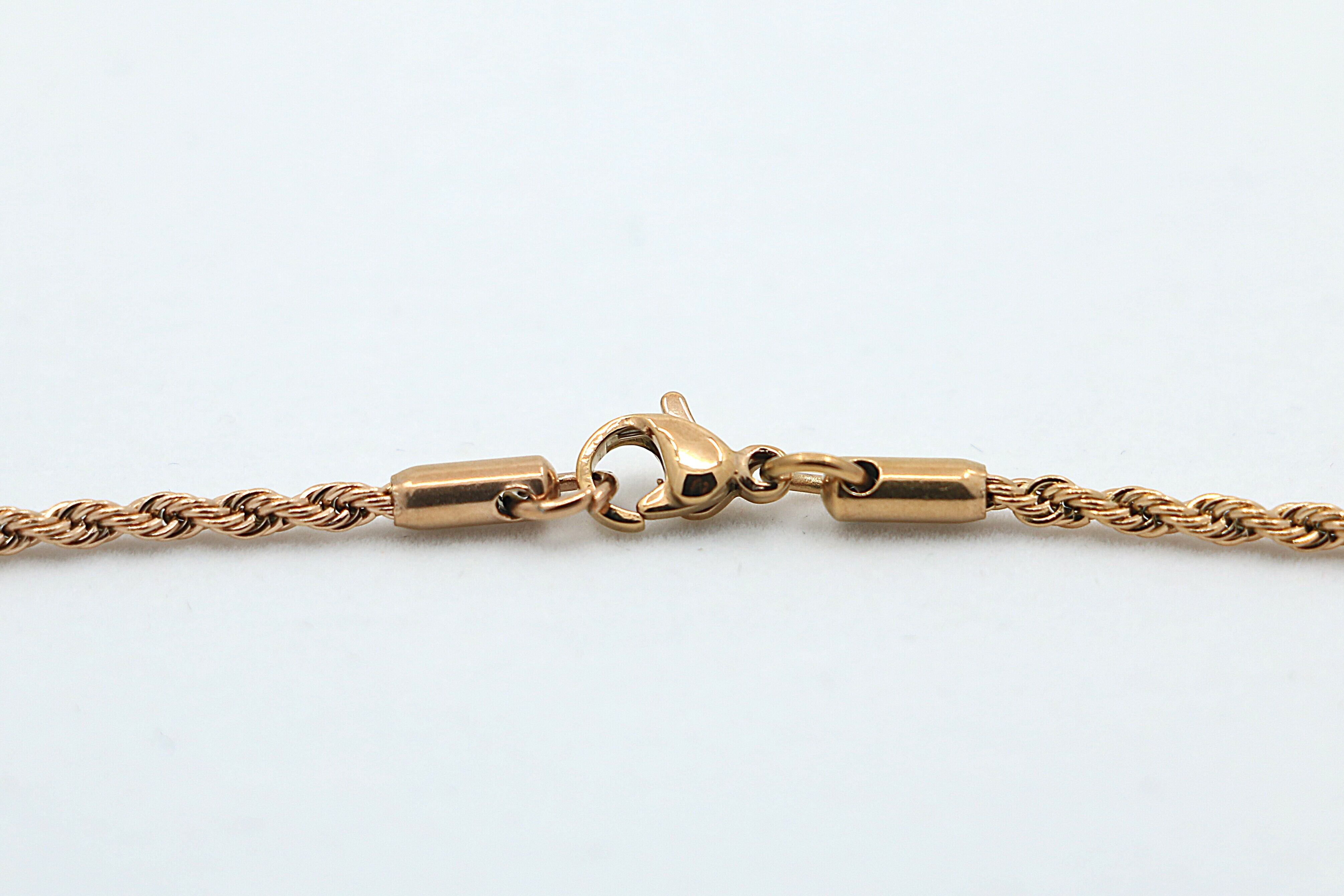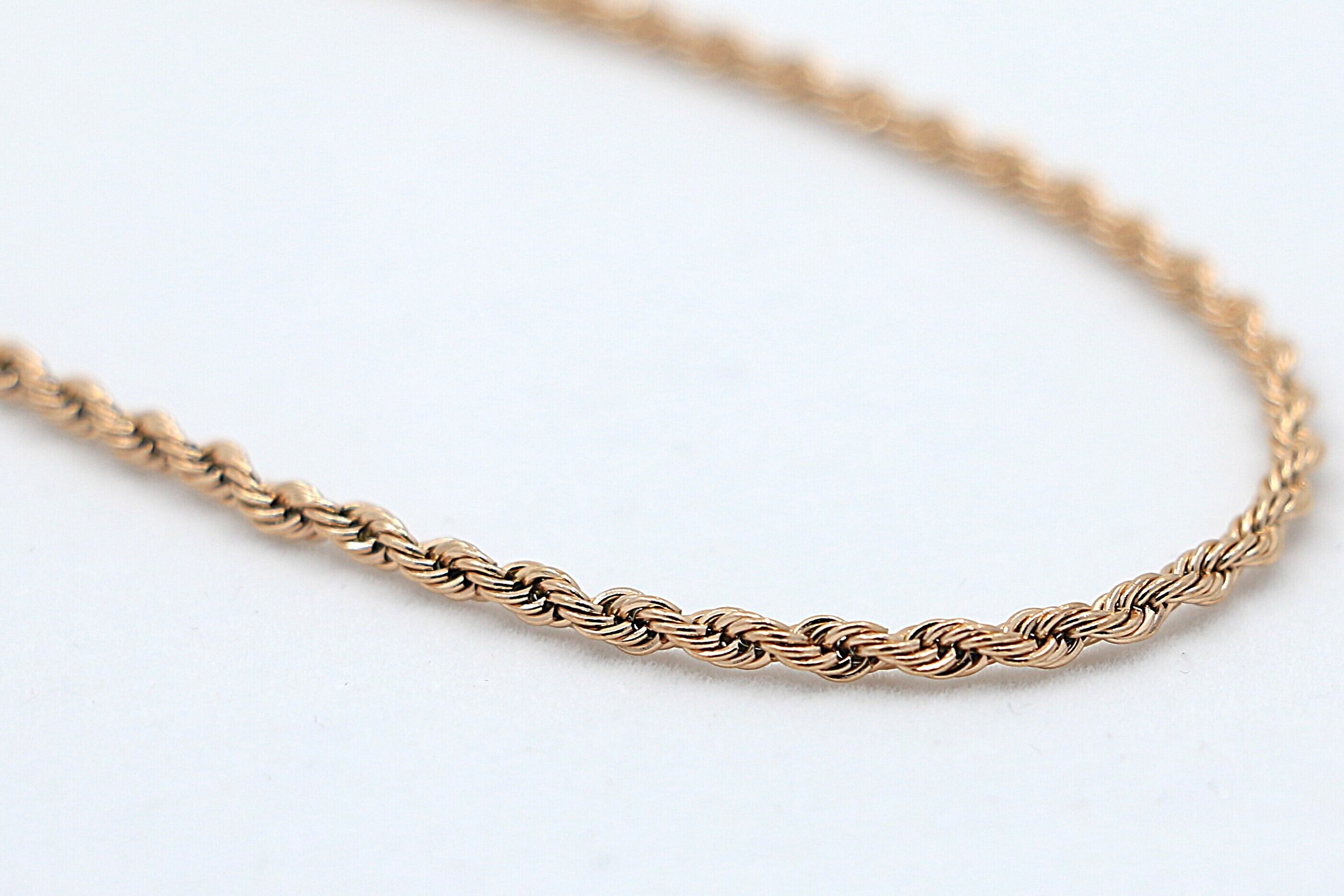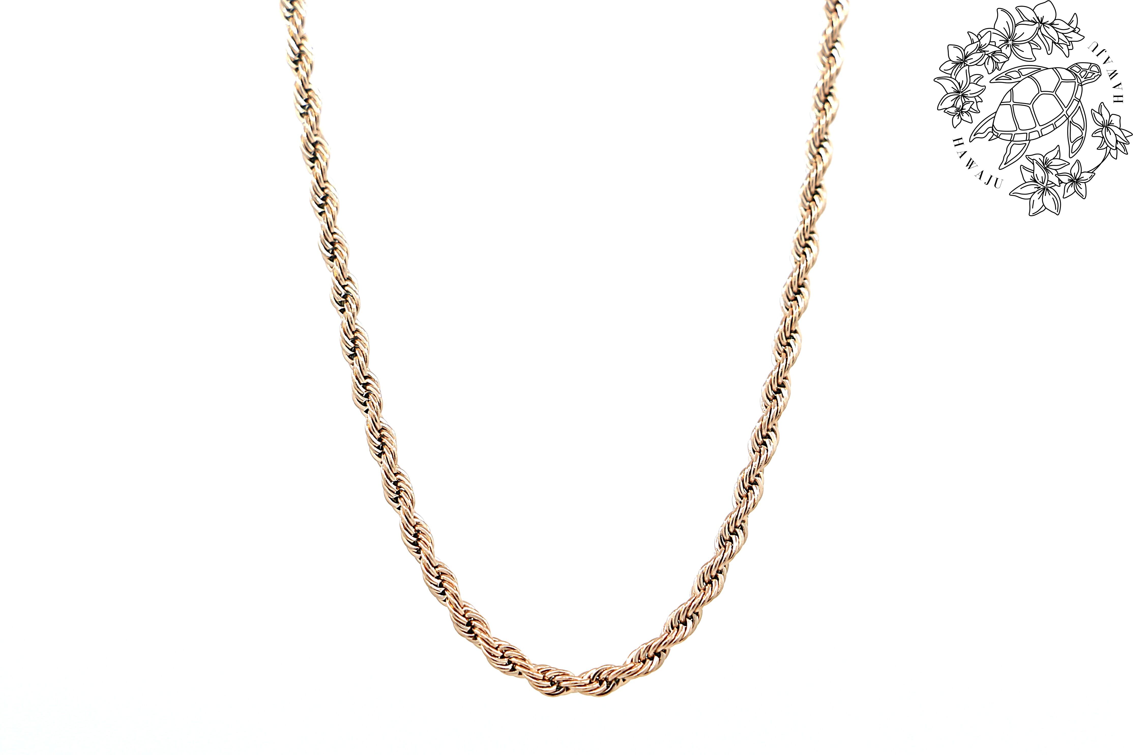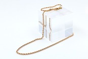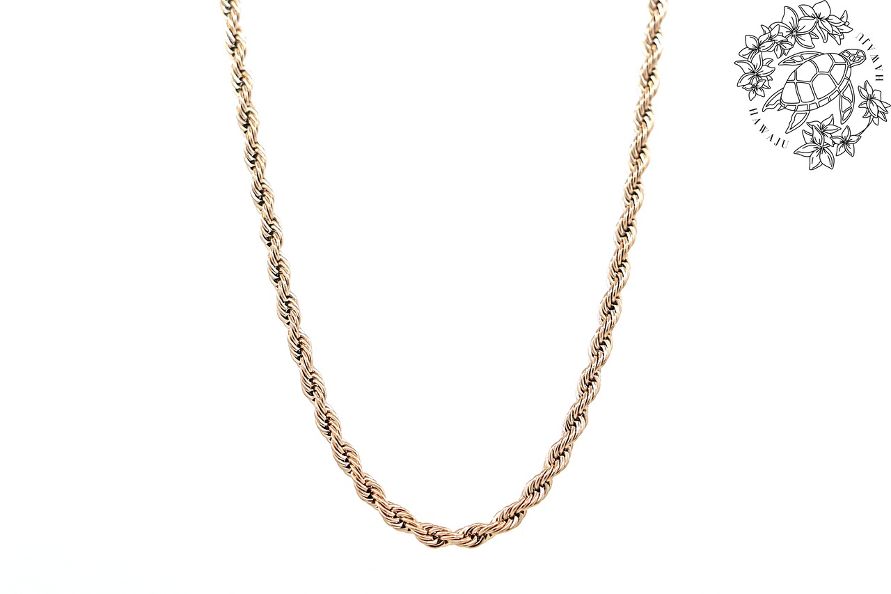 このロープチェーンは、繊細なツイストが美しく輝き、編み込まれたデザインが立体的な光沢を生み出す、シンプルながらも存在感のある仕上がりになっています。一本での着用はもちろん、ペンダントトップとの組み合わせにも最適な万能チェーンです。