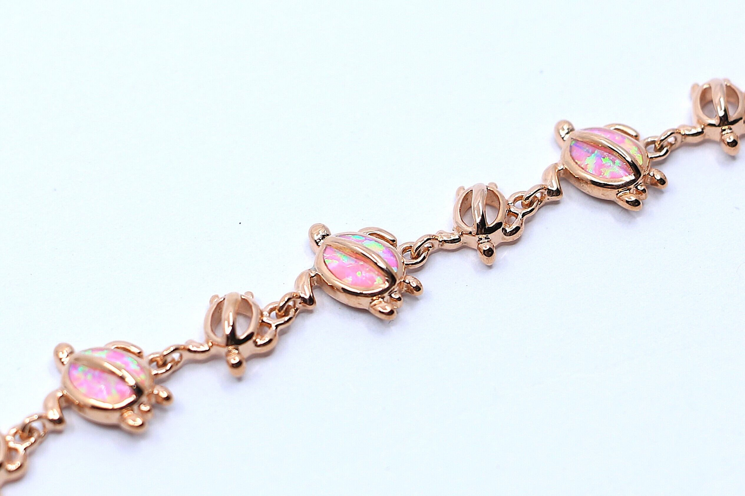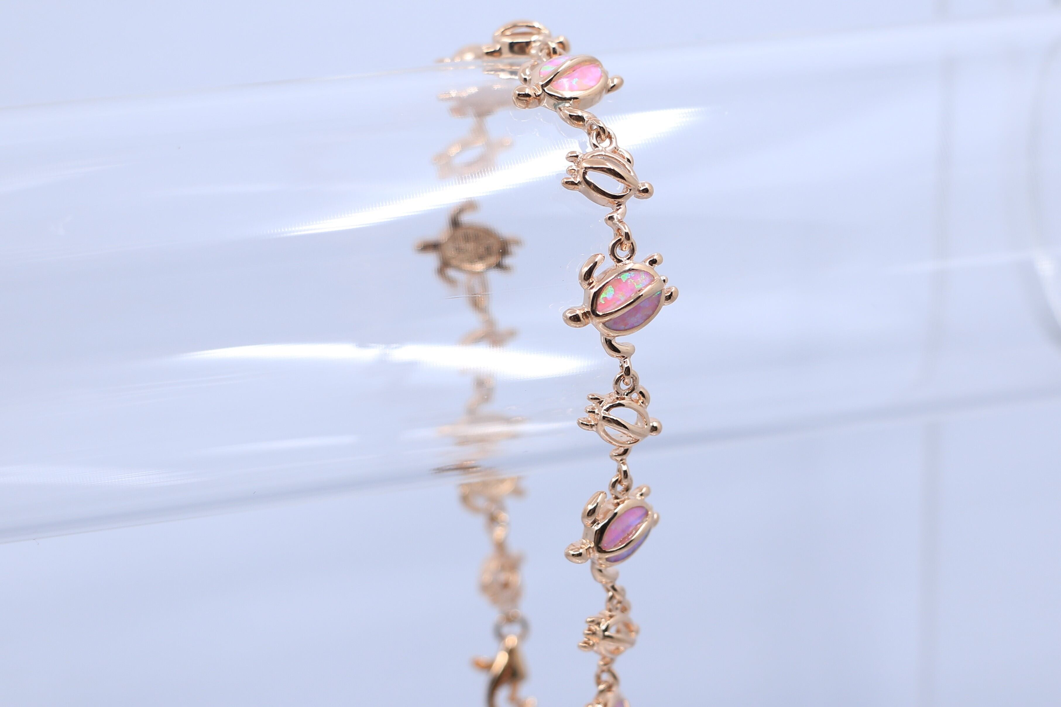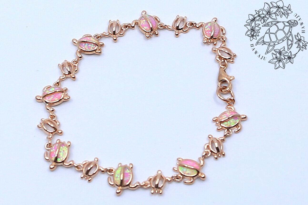 ホヌ(ウミガメ)モチーフが連なる、上品なハワイアンブレスレットです。甲羅には温かみのあるピンクオパールが施され、優雅さとともに存在感を放つ一品となっています。また、ホヌ(ウミガメ)が連なるデザインは、愛と長寿を象徴し、大切な方への贈り物としてもぴったりです。