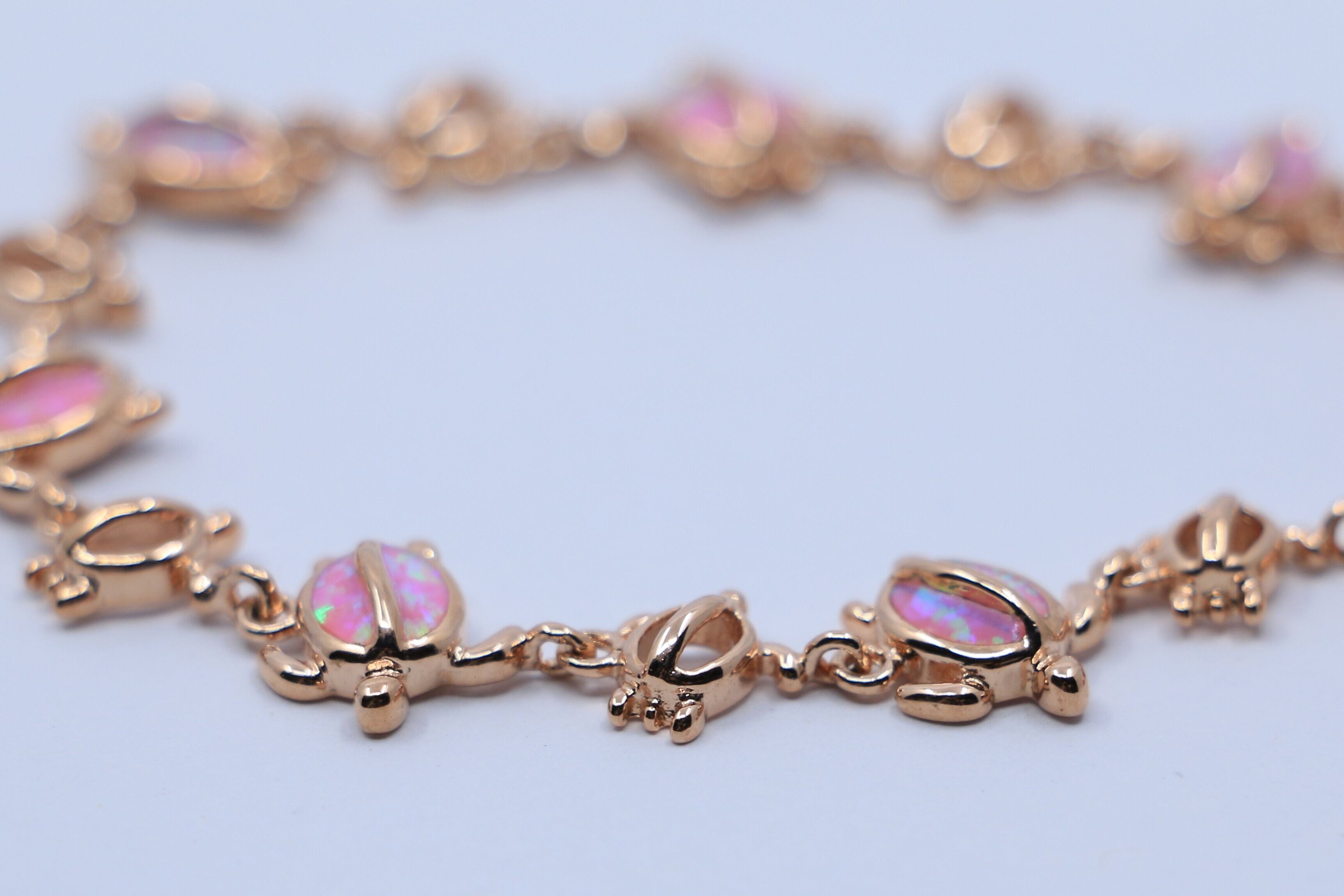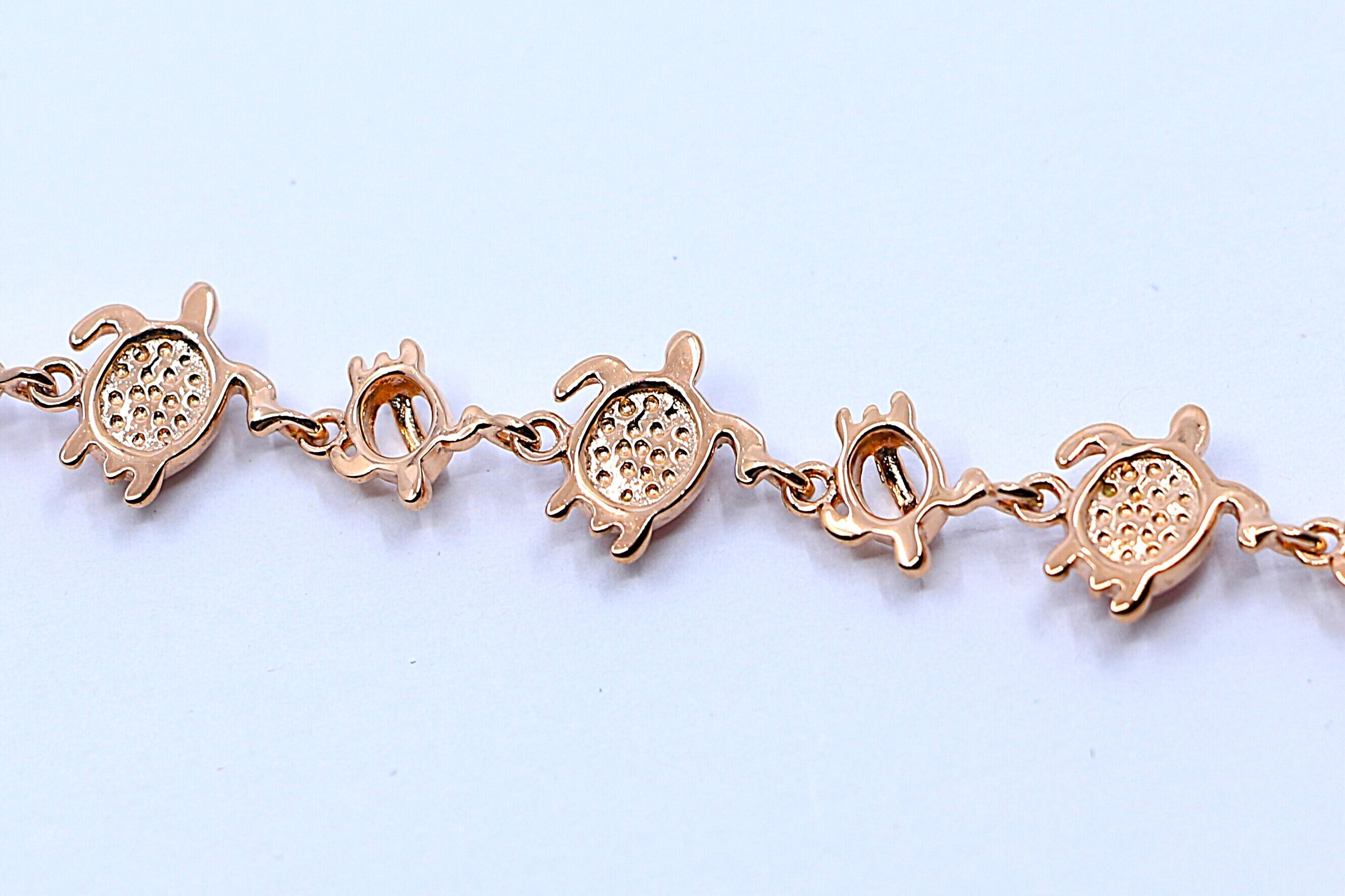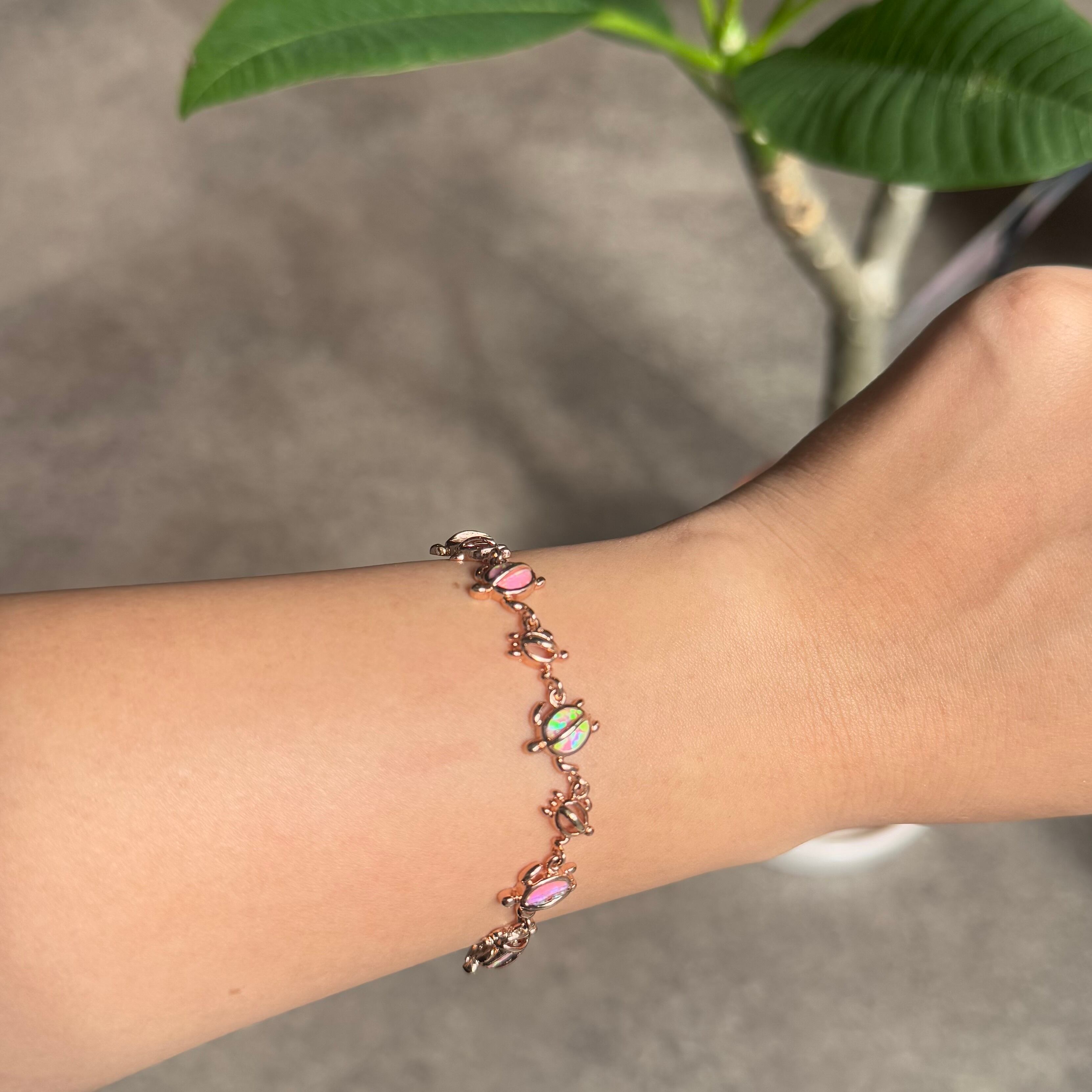 ホヌ(ウミガメ)モチーフが連なる、上品なハワイアンブレスレットです。甲羅には温かみのあるピンクオパールが施され、優雅さとともに存在感を放つ一品となっています。また、ホヌ(ウミガメ)が連なるデザインは、愛と長寿を象徴し、大切な方への贈り物としてもぴったりです。