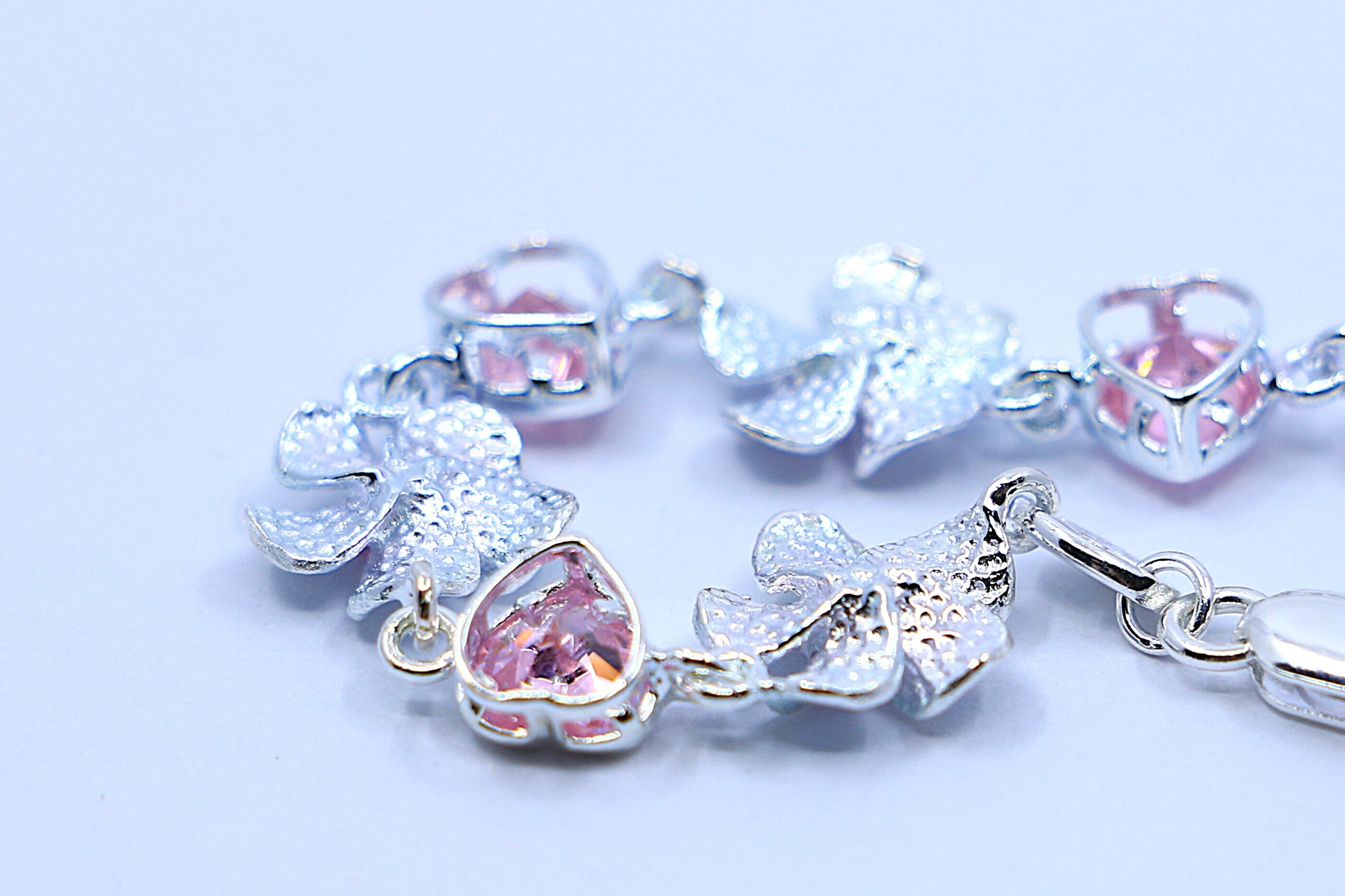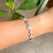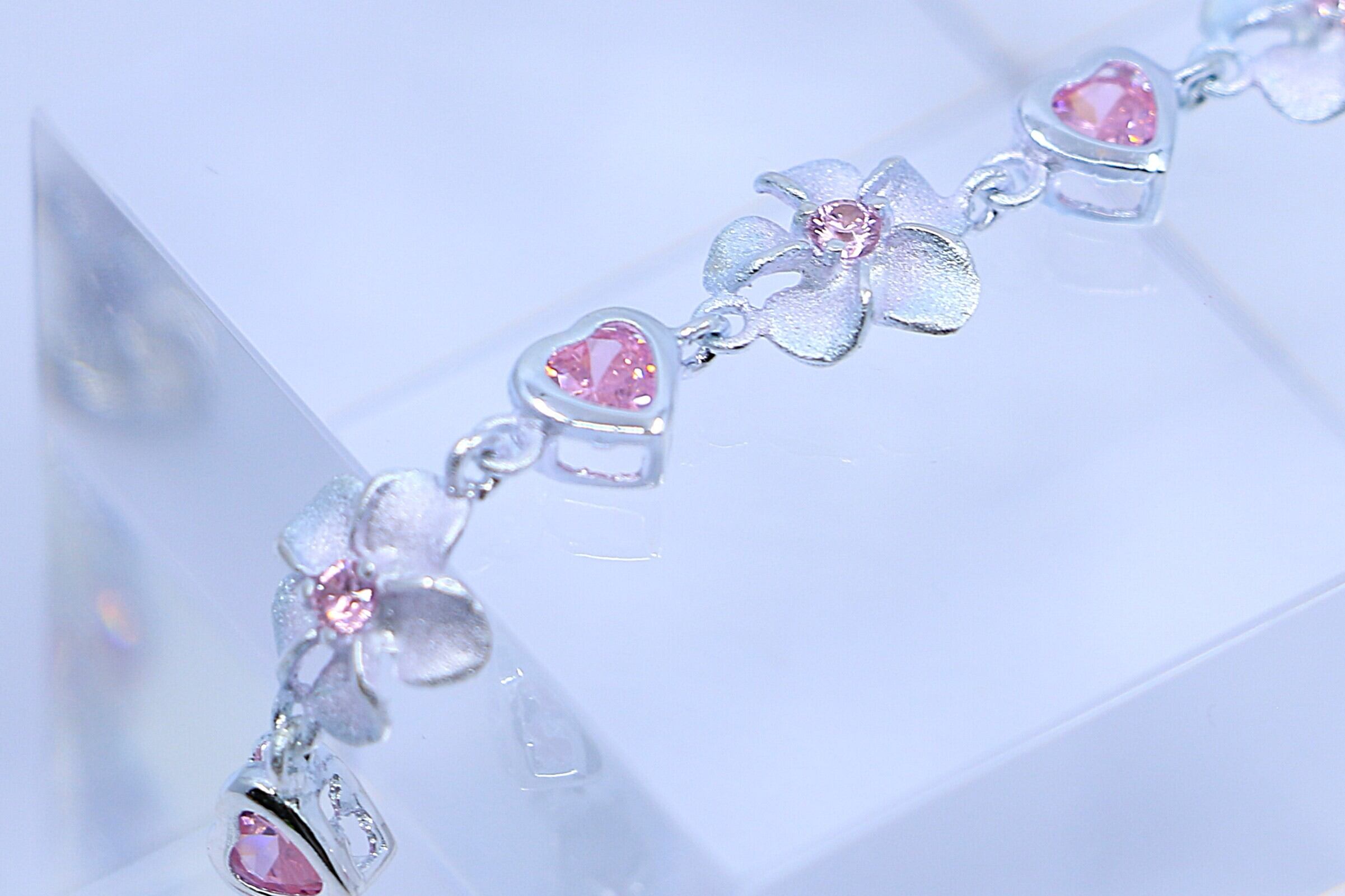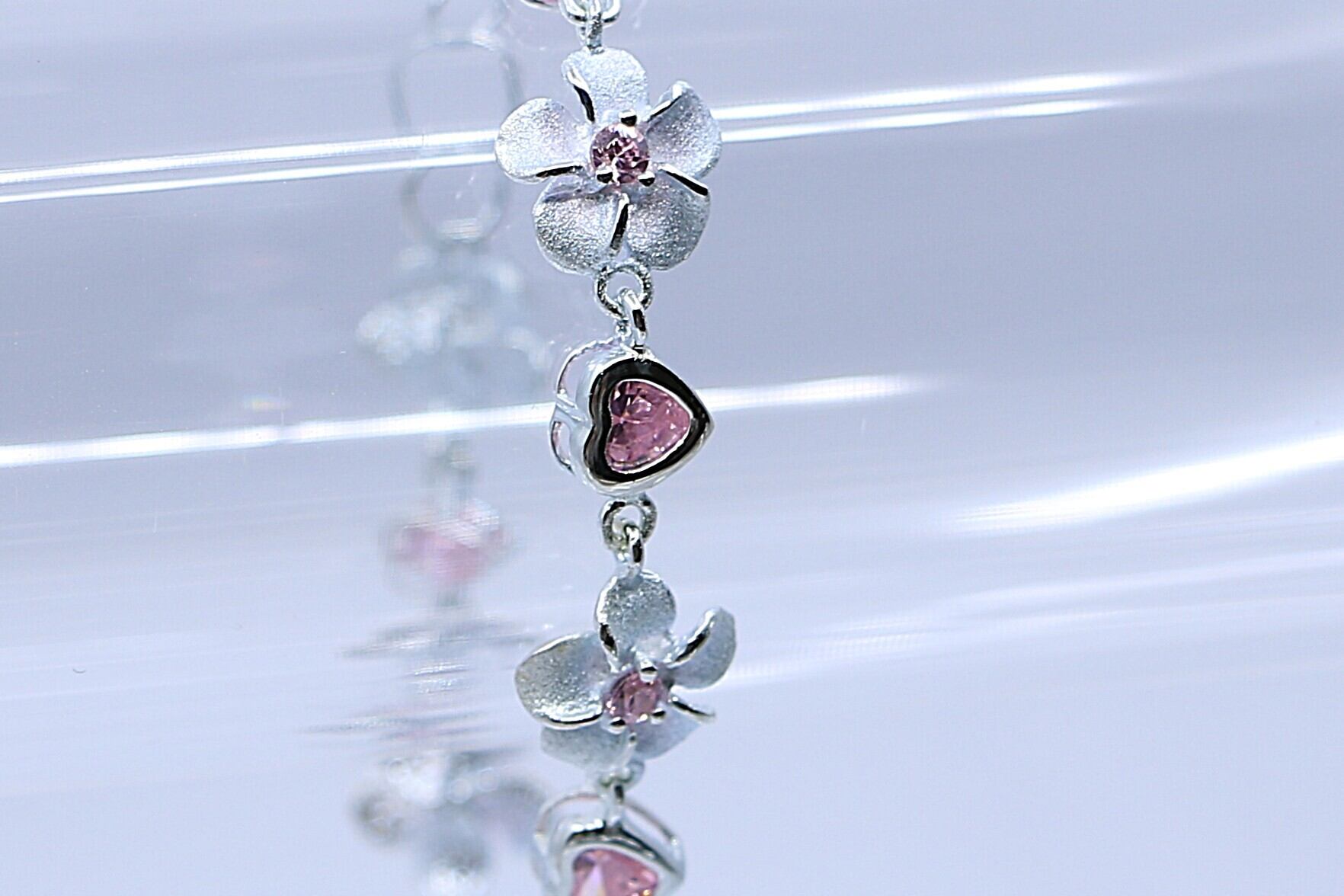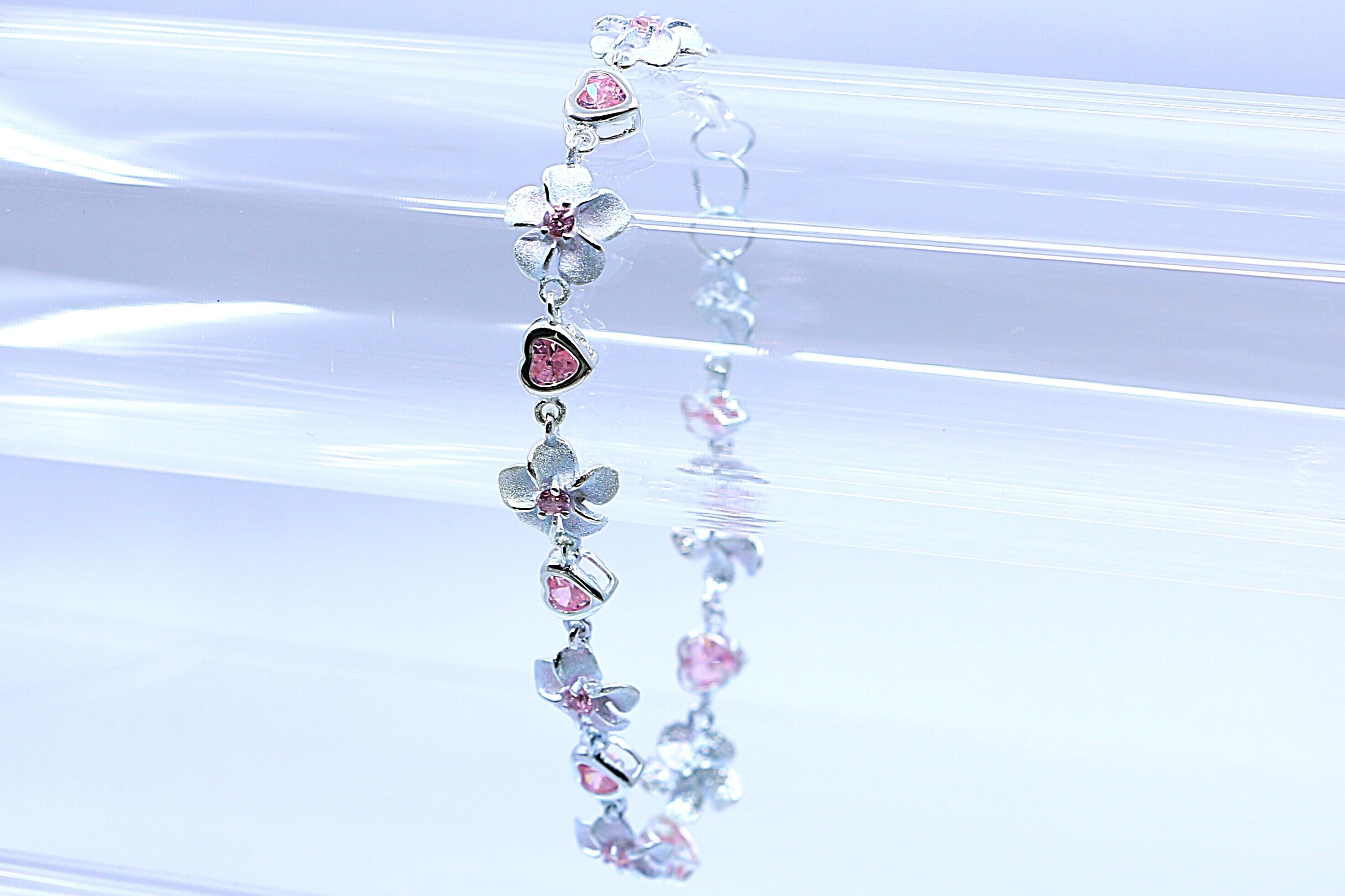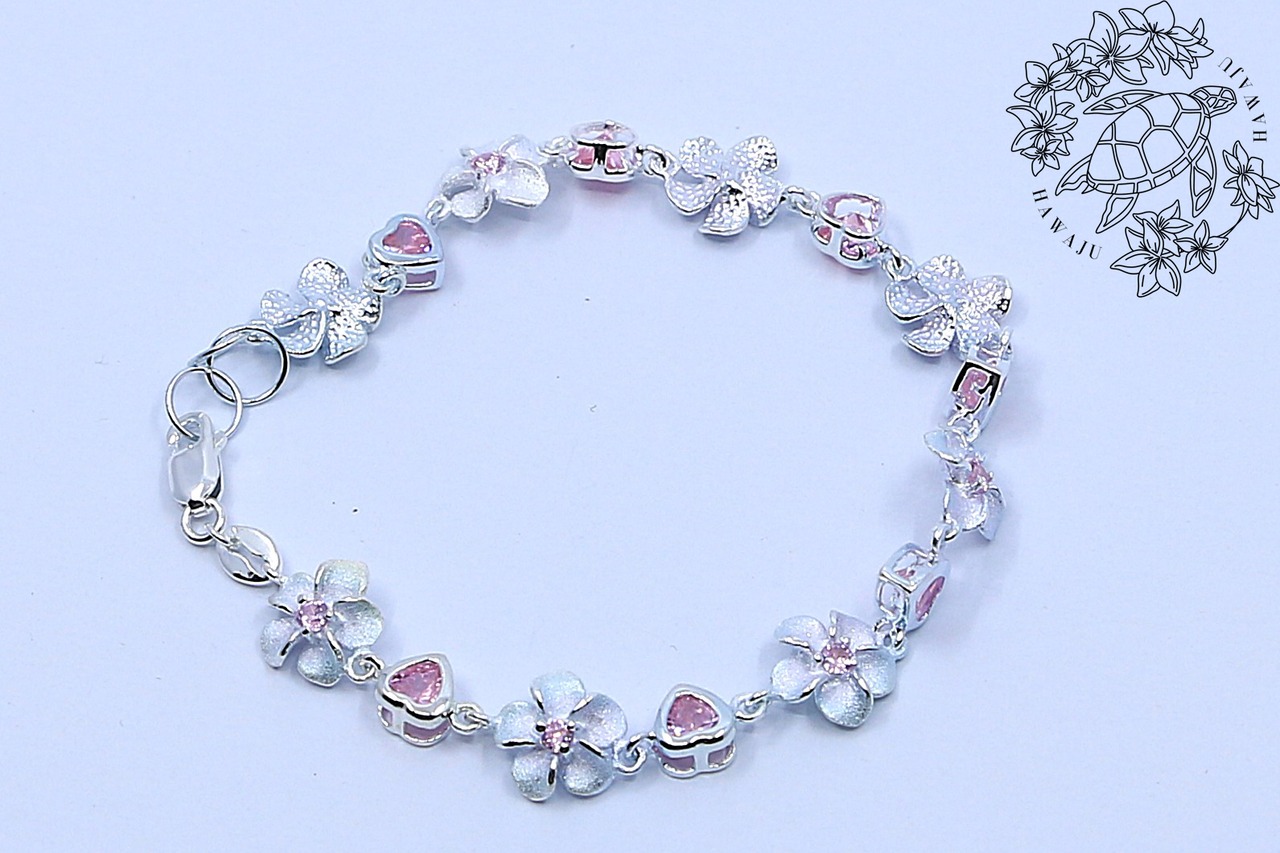 プルメリアとハートモチーフが交互に連なった、華やかで愛らしいハワイアンジュエリーのブレスレットです。ハートモチーフやプルメリアの中央にはピンクのキュービックジルコニアがあしらわれ、柔らかく上品な輝きが手元を彩ります。日常使いはもちろん、特別な日のアクセントにもぴったりのアイテムです。