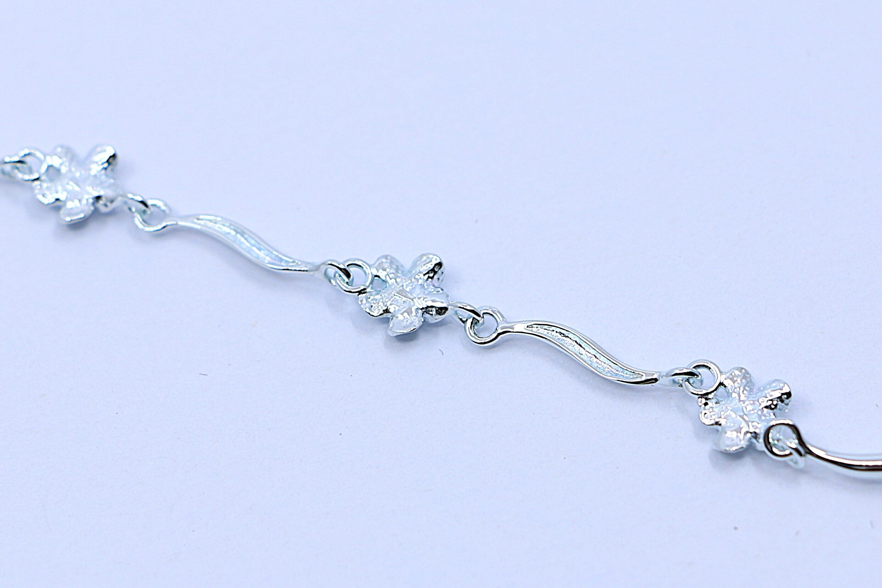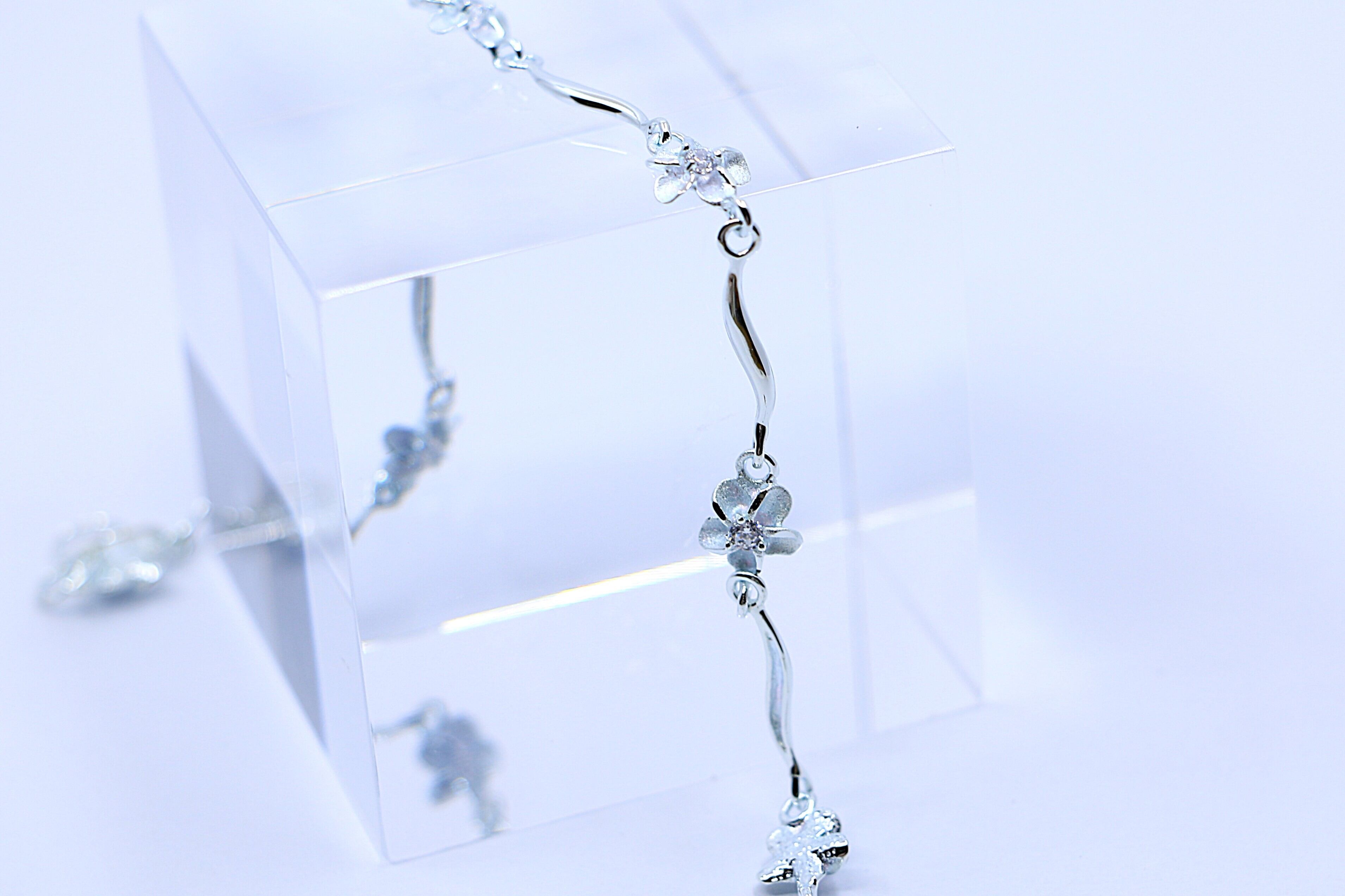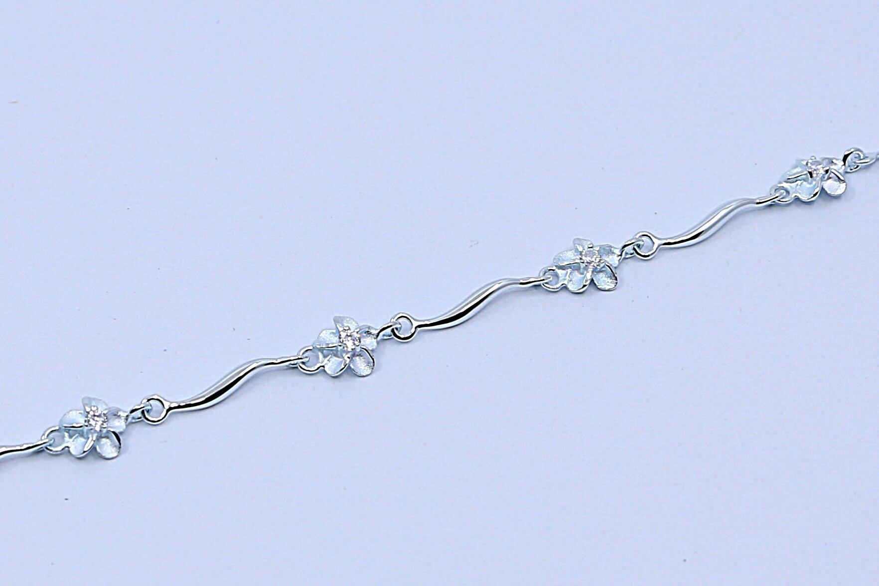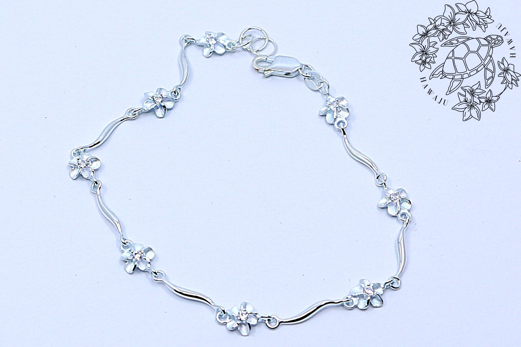ハワイを象徴する花「プルメリア」が複数連なったデザインで、花びらの一つひとつが繊細に彫刻されており、自然の美しさを感じさせます。モチーフの中央に輝くキュービックジルコニアが、シルバーの魅力を引き立てます。また、アンクレット全体に流れるようなカーブが施されており、足首にしなやかにフィット。女性らしい柔らかさと上品さを演出します。
