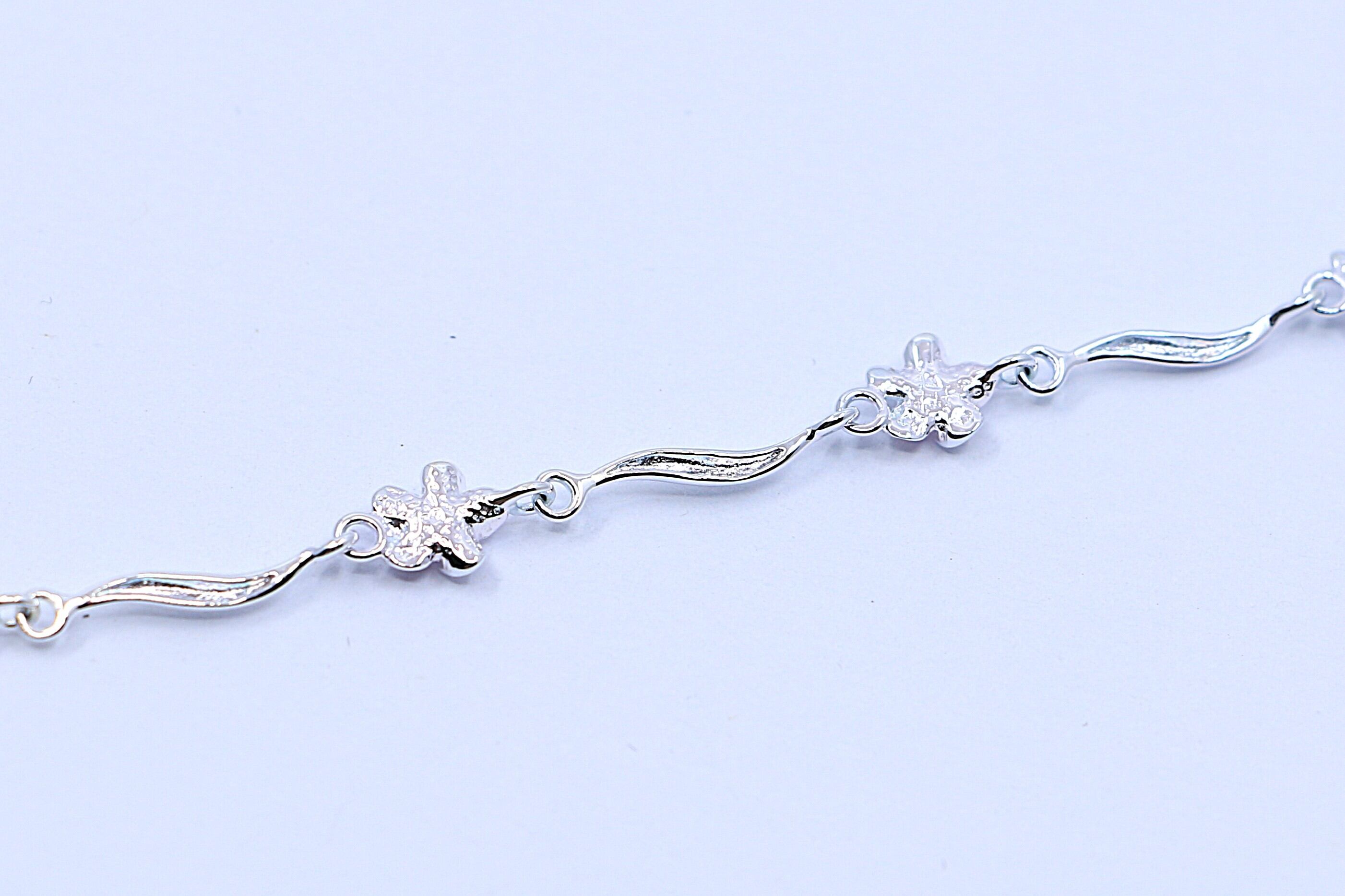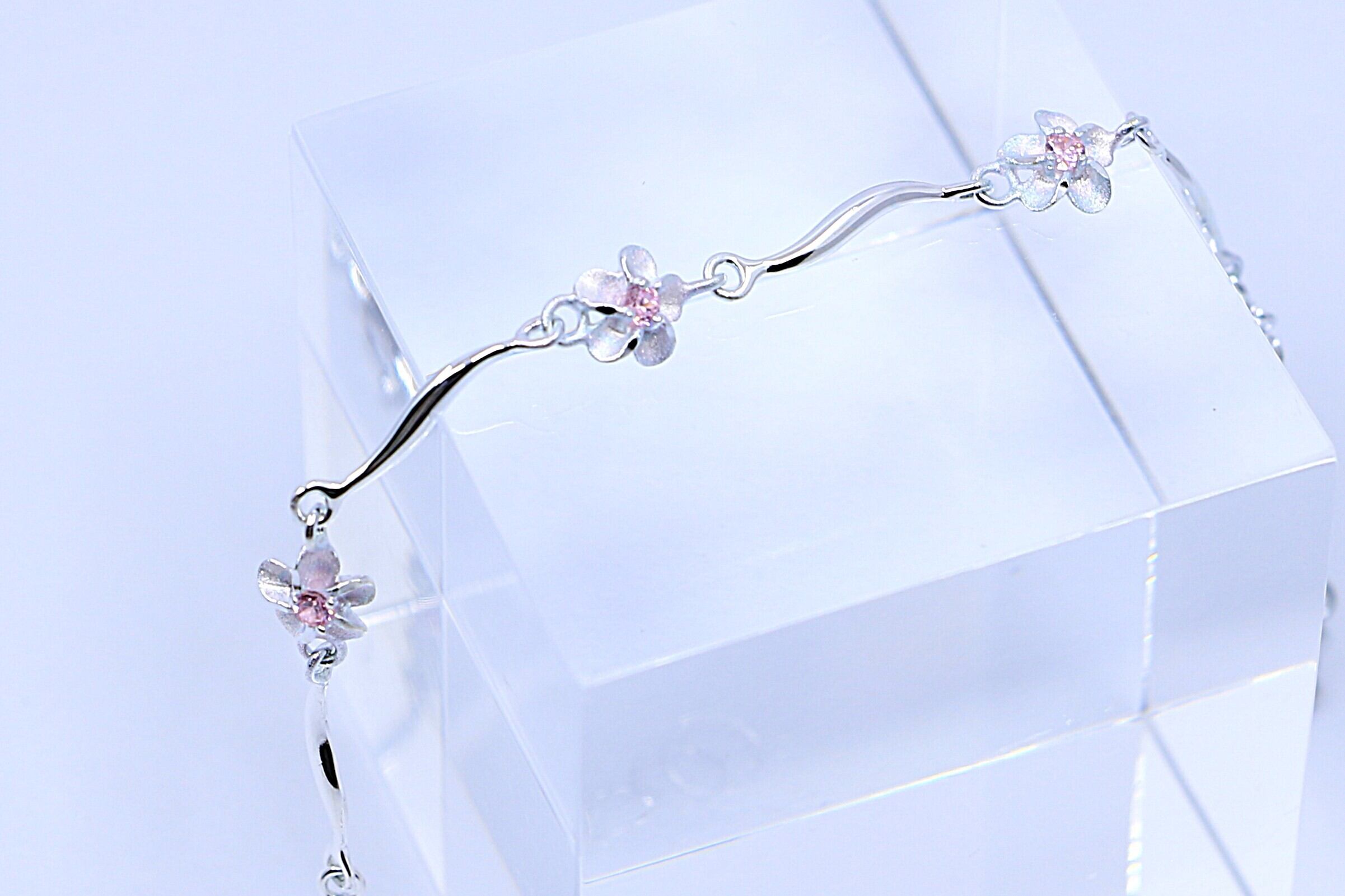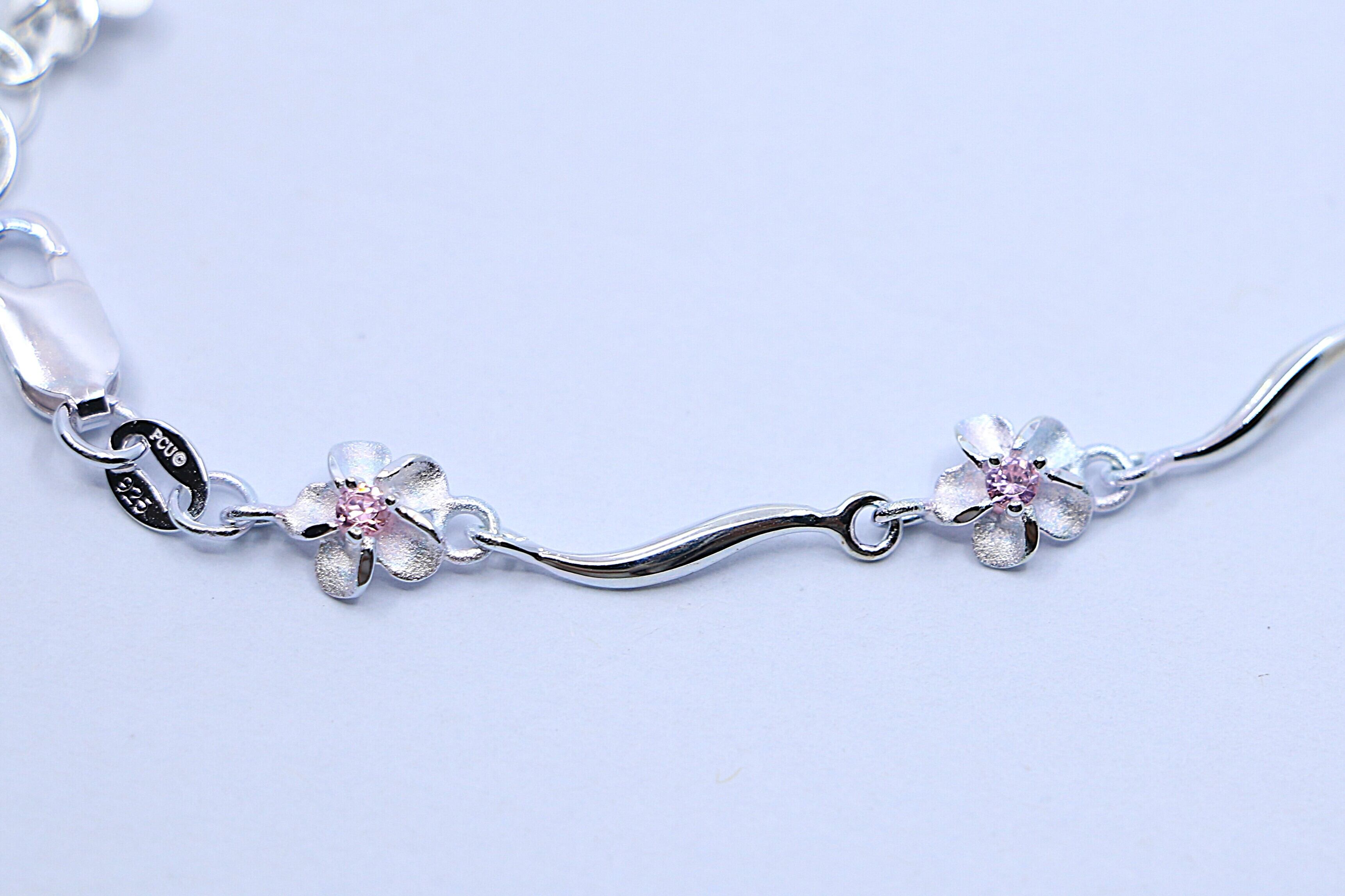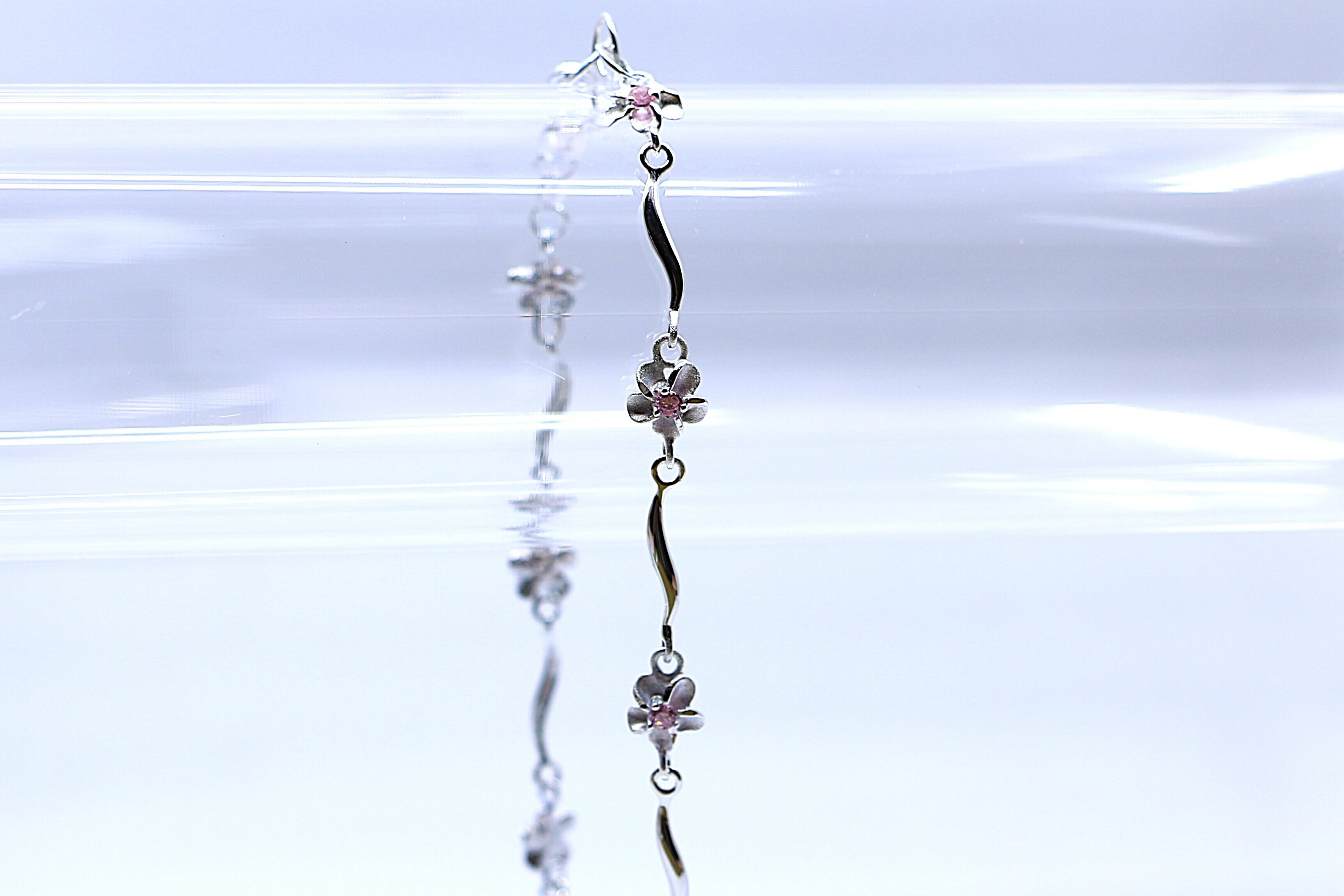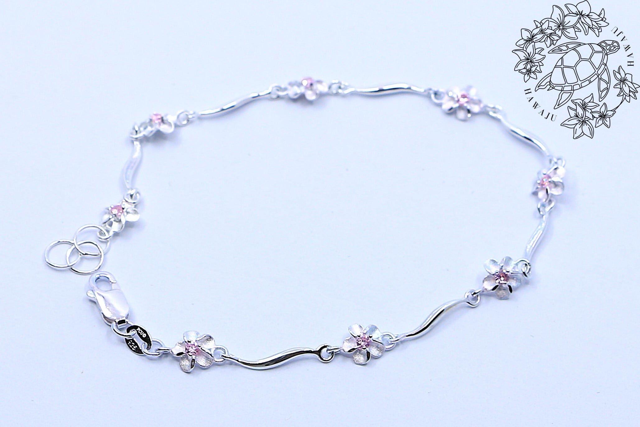 ハワイを象徴する花「プルメリア」が複数連なったデザインで、花びらの一つひとつが繊細に彫刻されており、自然の美しさを感じさせます。モチーフの中央に輝くピンクキュービックジルコニアが、シルバーの魅力を引き立てます。また、アンクレット全体に流れるようなカーブが施されており、足首にしなやかにフィット。女性らしい柔らかさと上品さを演出します。