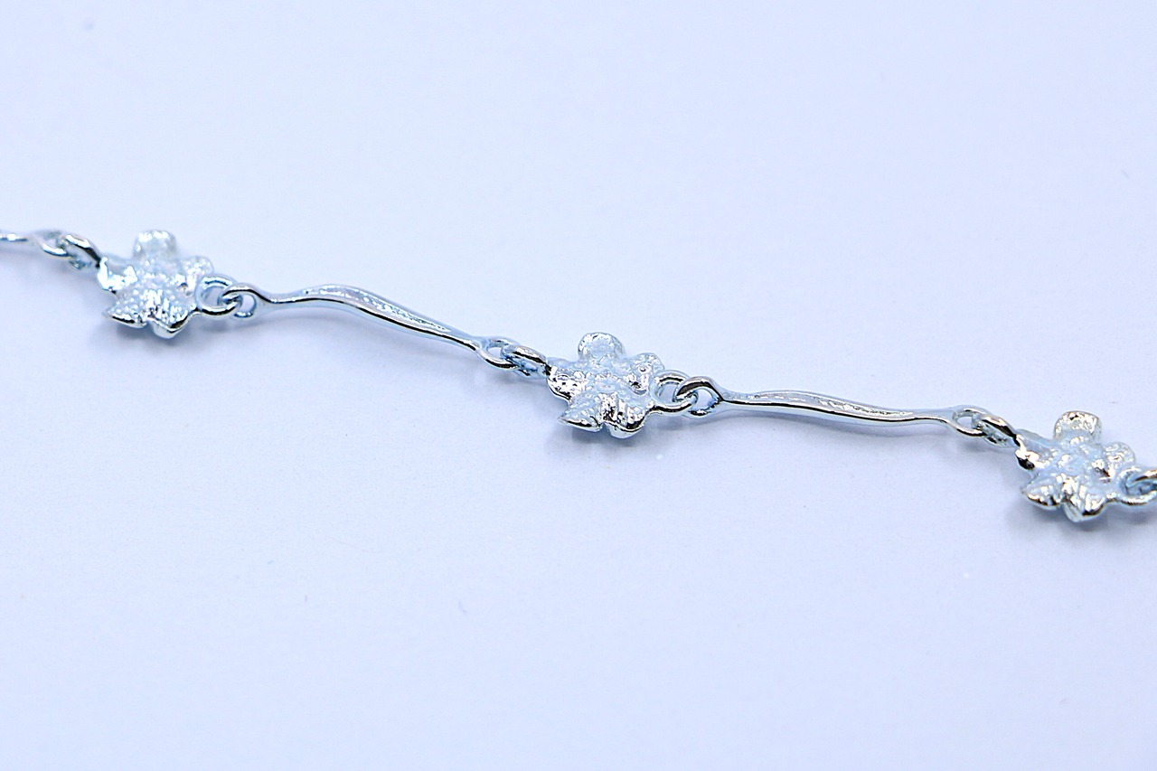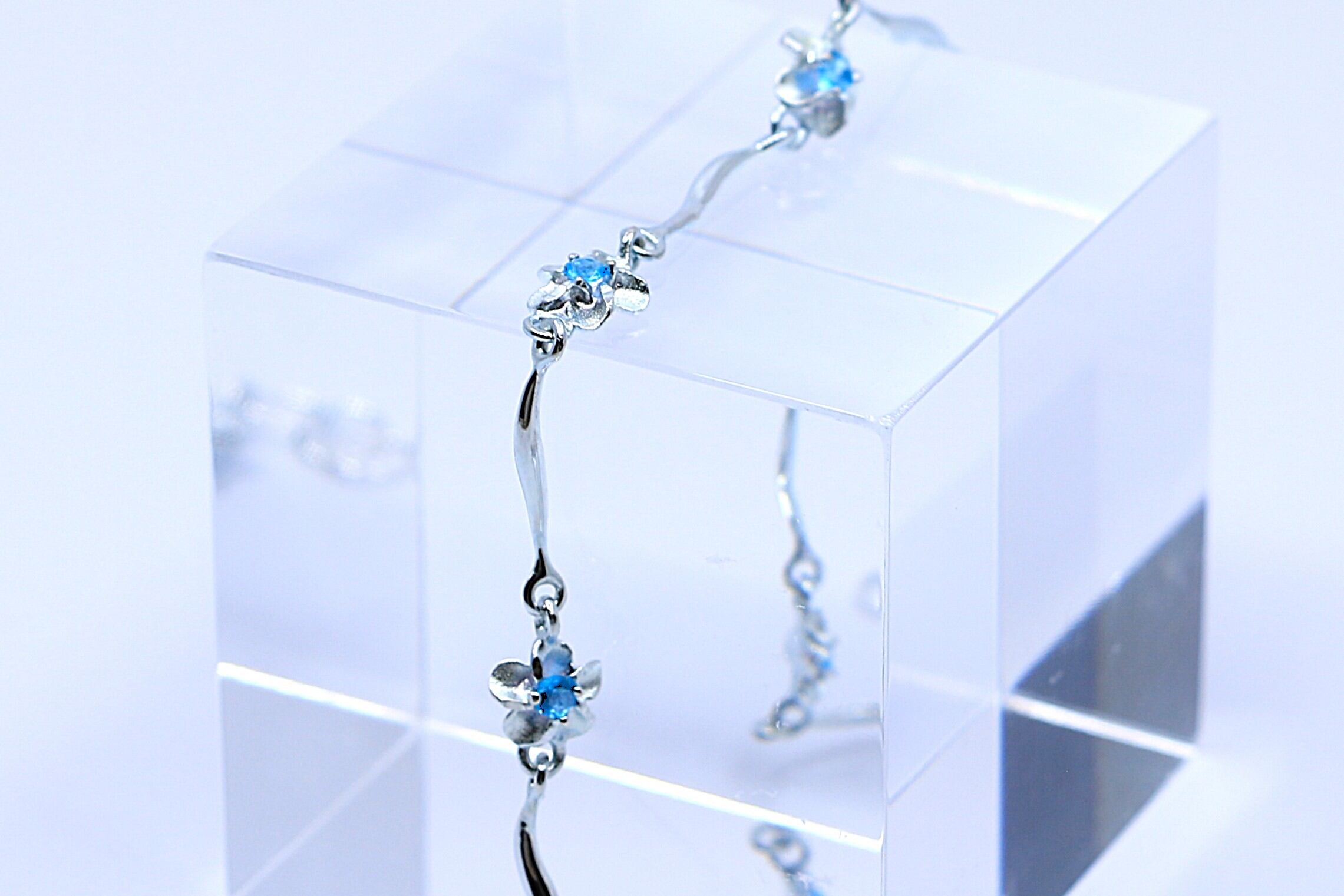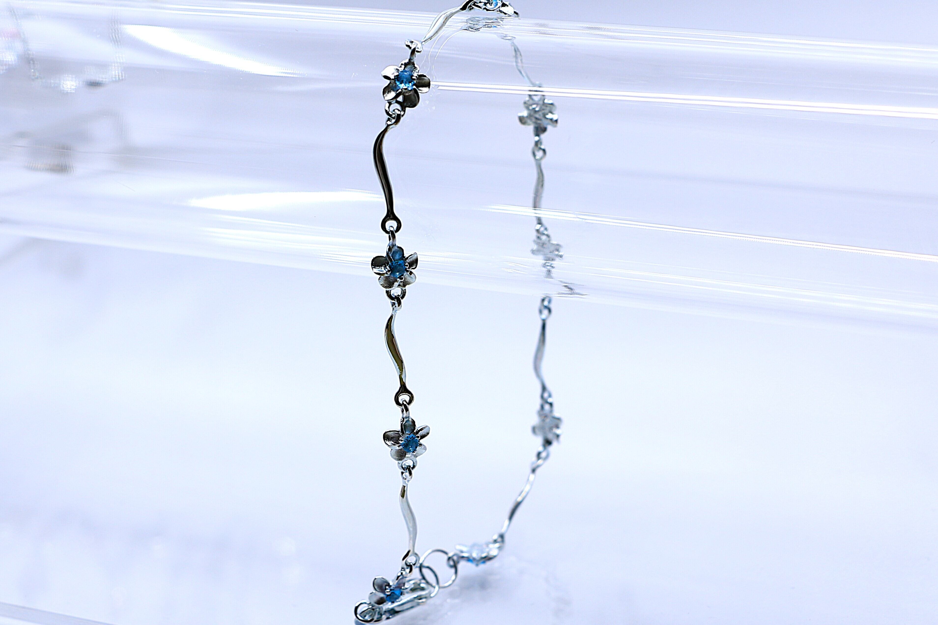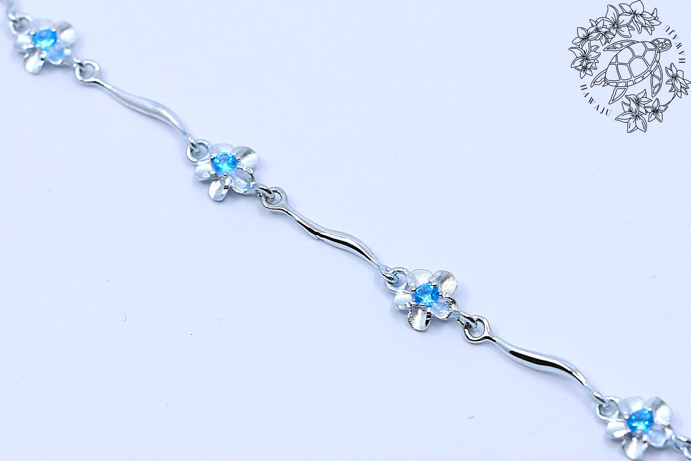 ハワイを象徴する花「プルメリア」が複数連なったデザインで、花びらの一つひとつが繊細に彫刻されており、自然の美しさを感じさせます。モチーフの中央に輝くブルーキュービックジルコニアが、シルバーの魅力を引き立てます。また、アンクレット全体に流れるようなカーブが施されており、足首にしなやかにフィット。女性らしい柔らかさと上品さを演出します。