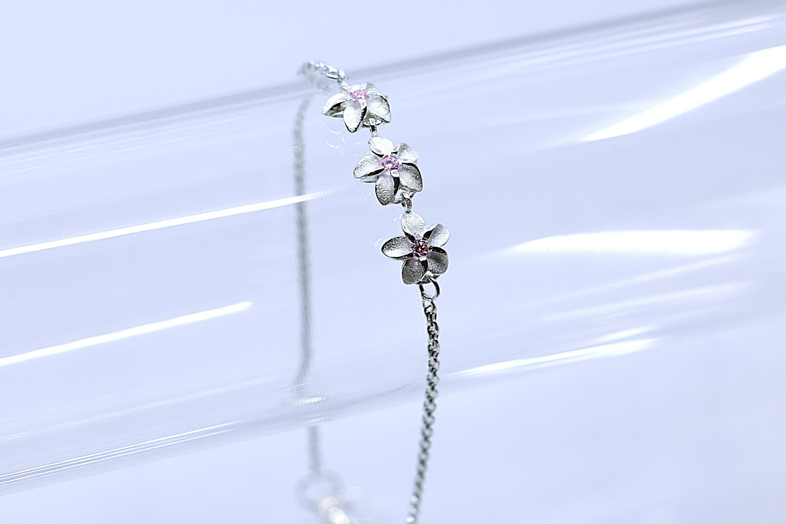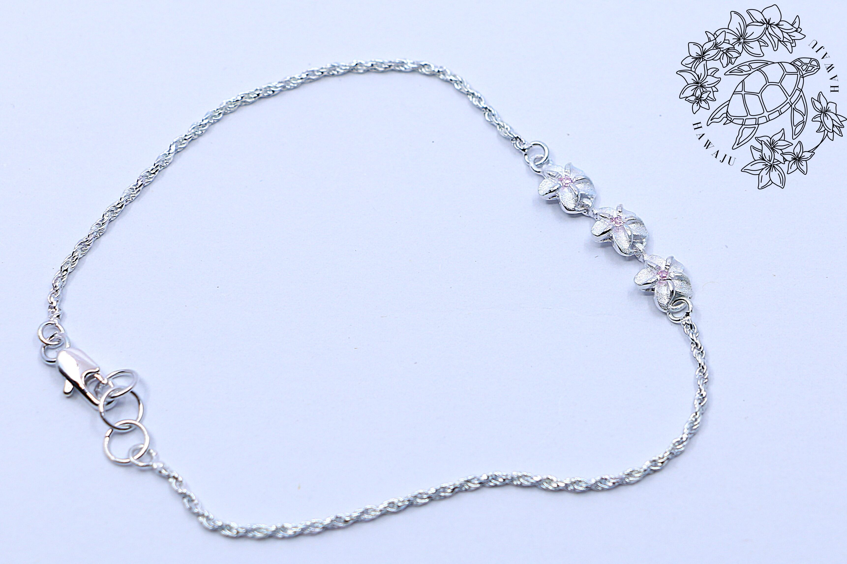 華やかな3連プルメリアが優雅に並ぶアンクレットは、シルバー925の輝きとともに、あなたの足元を美しく彩ります。花の中心には、ピンクキュービックジルコニアがあしらわれており、キラリとしたアクセントを添えています。ハワイの伝統的なモチーフを現代的にデザインしたこのアンクレットは、普段使いはもちろん、特別なシーンでも大活躍します。
