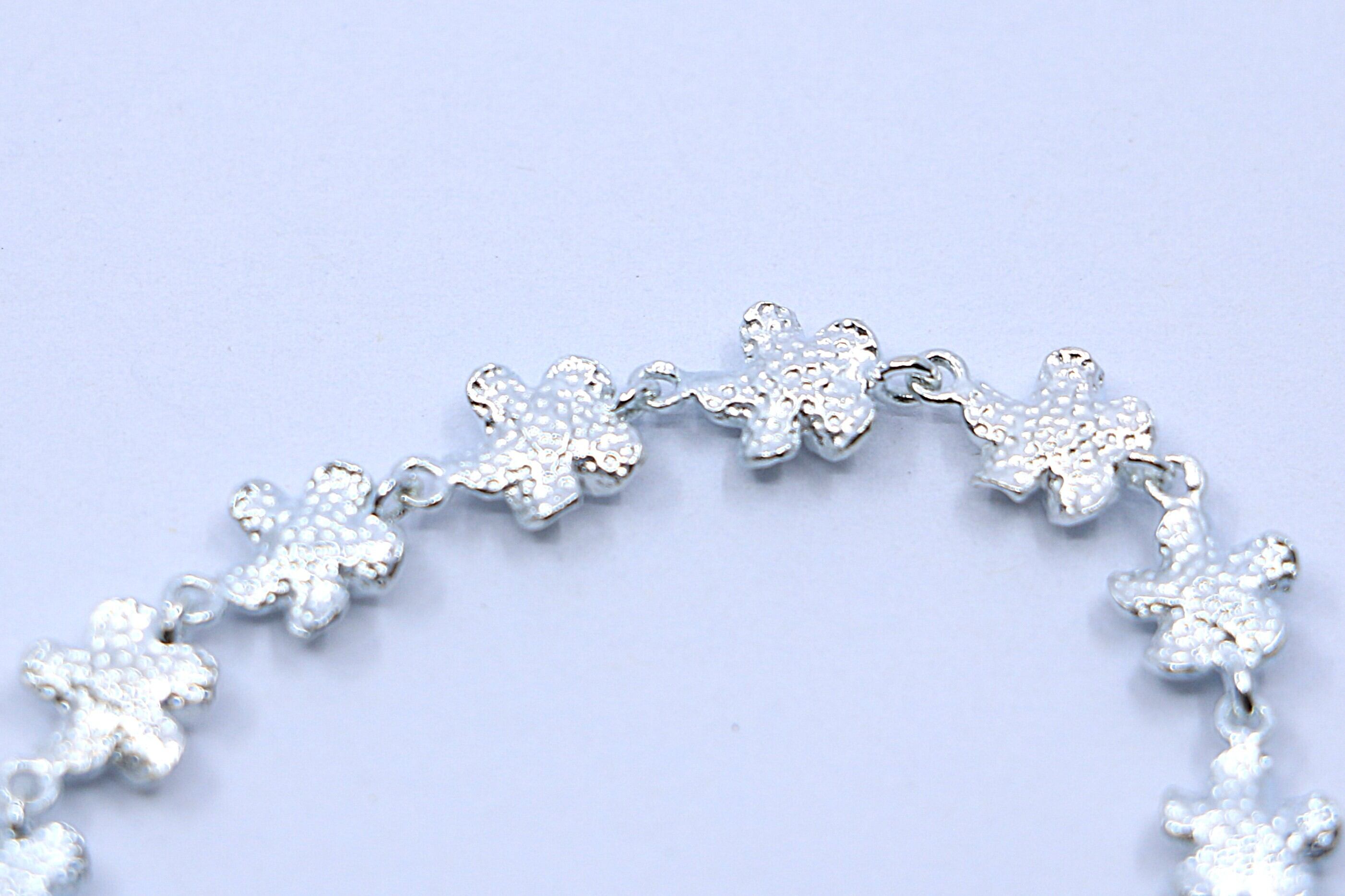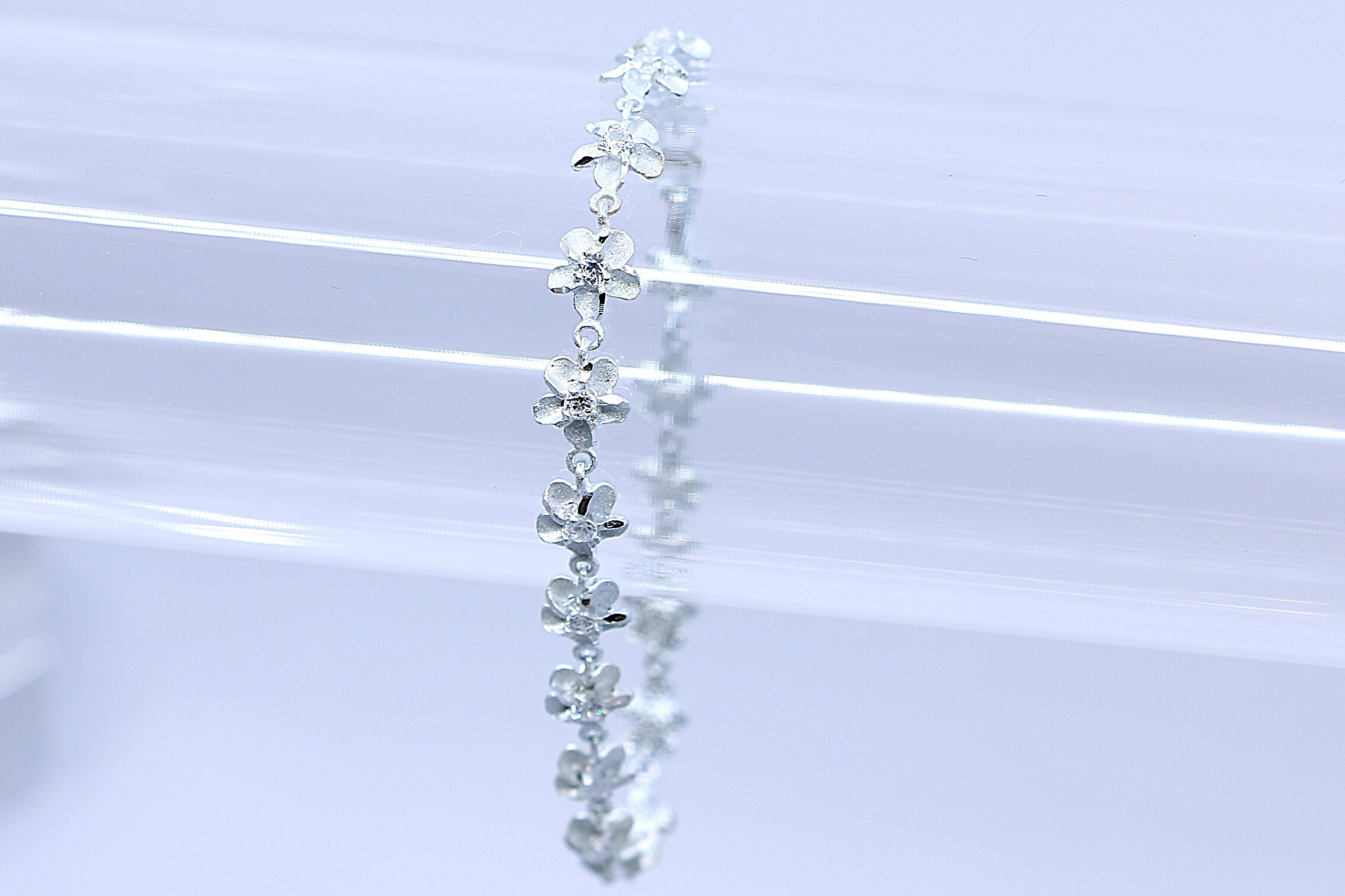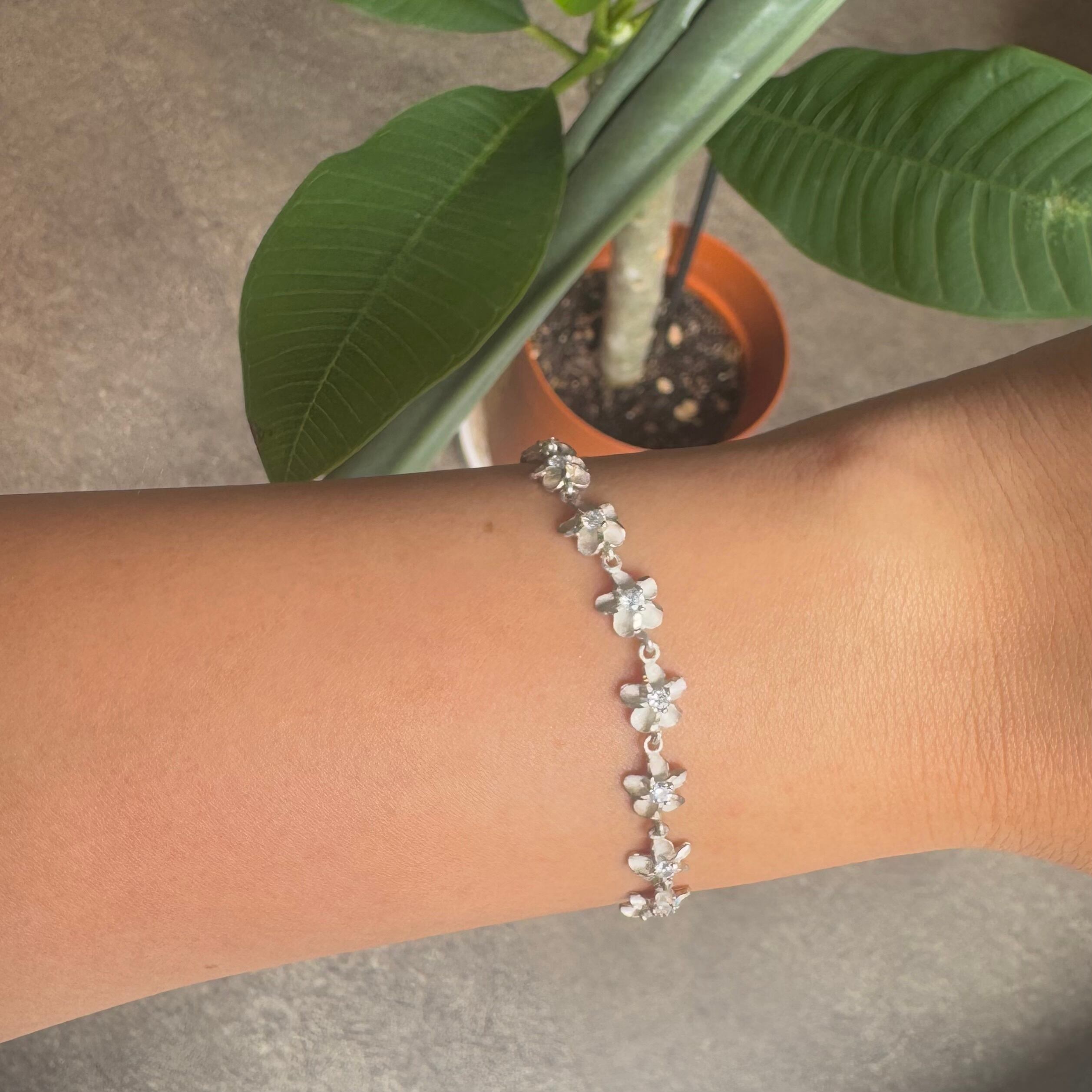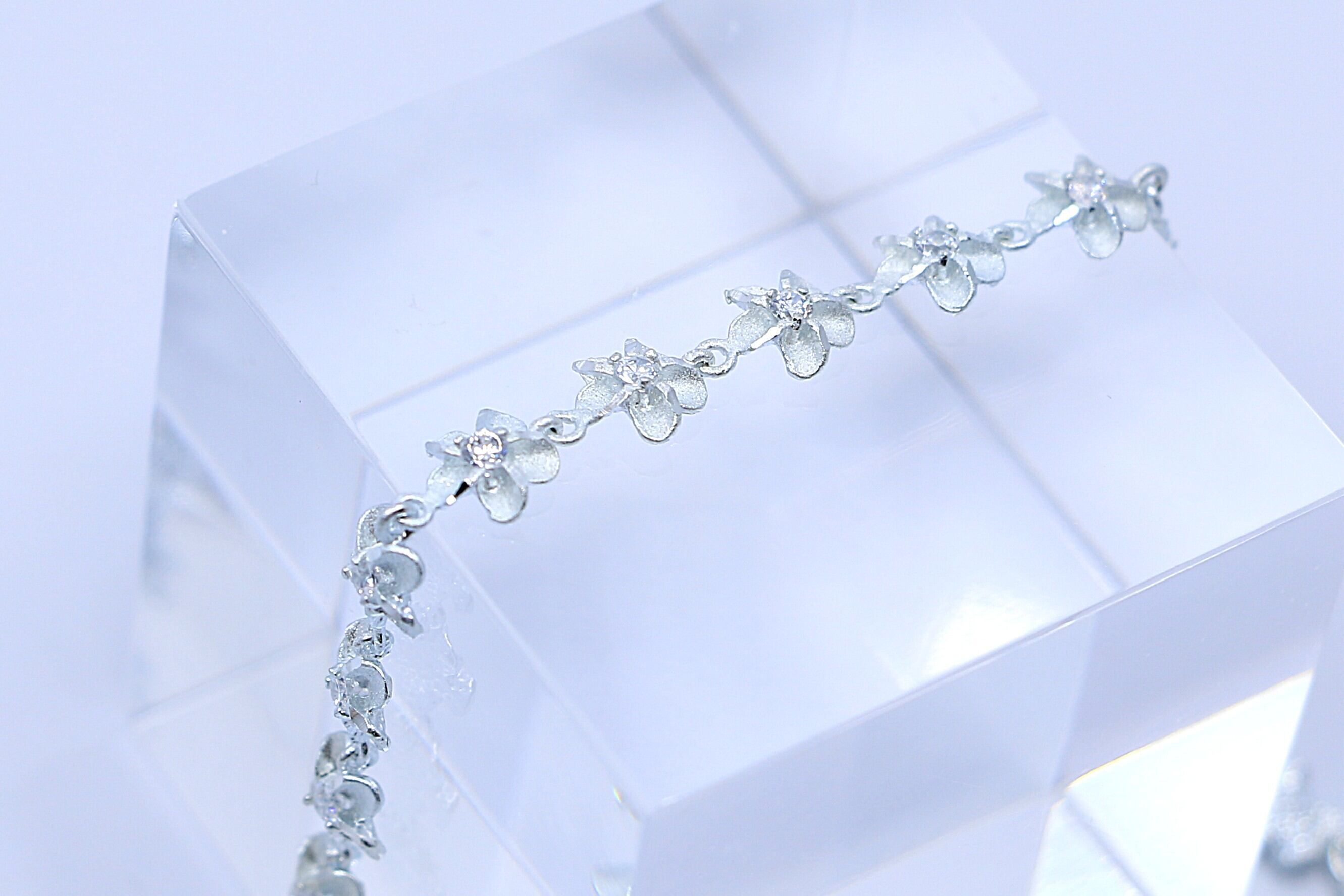 優美な花モチーフのデザインとシルバーの輝きが融合した美しいアイテムです。プルメリアの花が連なり、花の中央にはキュービックジルコニアが輝き、特別な存在感を放ちます。素材には高品質なSterling Silver(925)を使用しており、耐久性と魅力を兼ね備えています。
