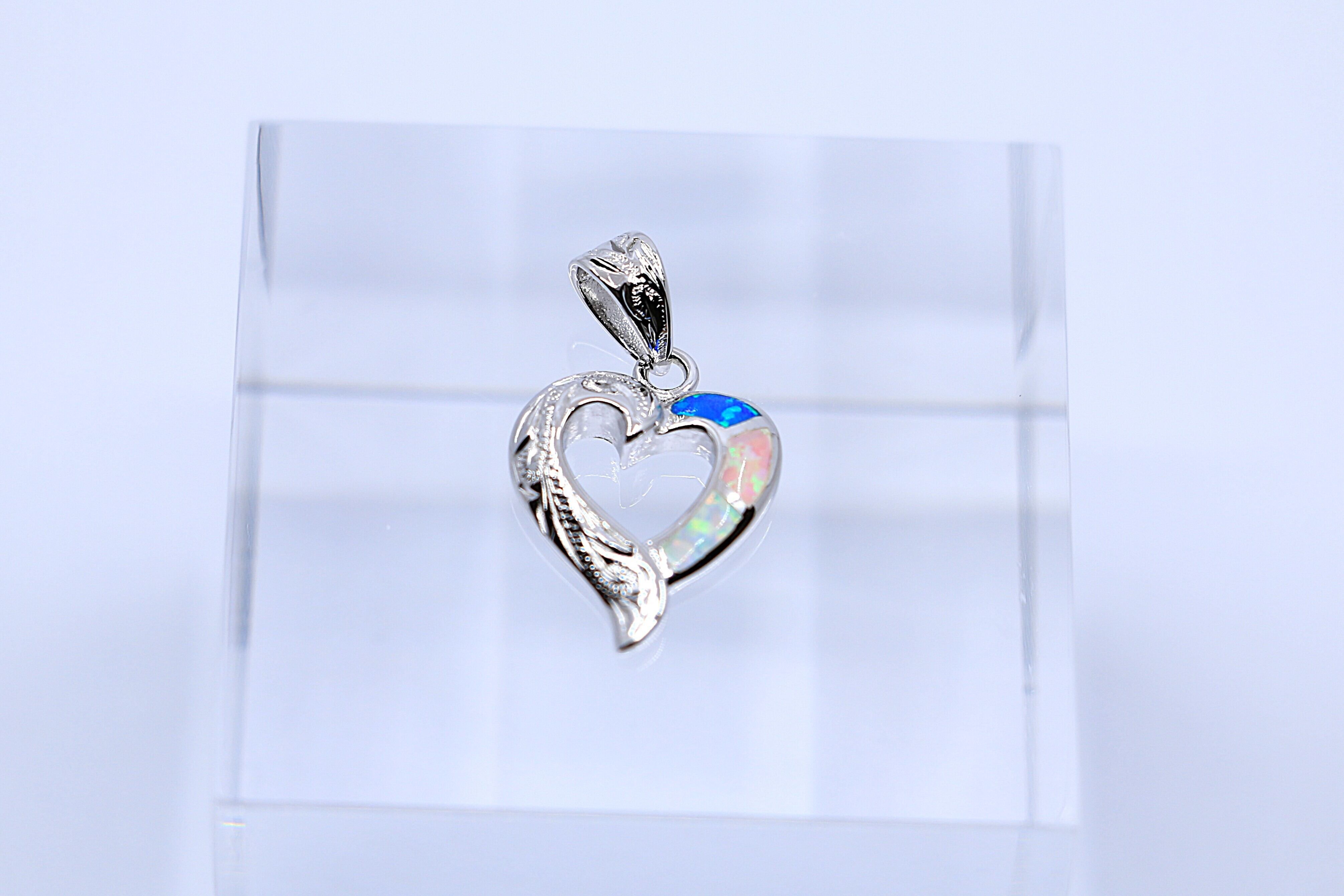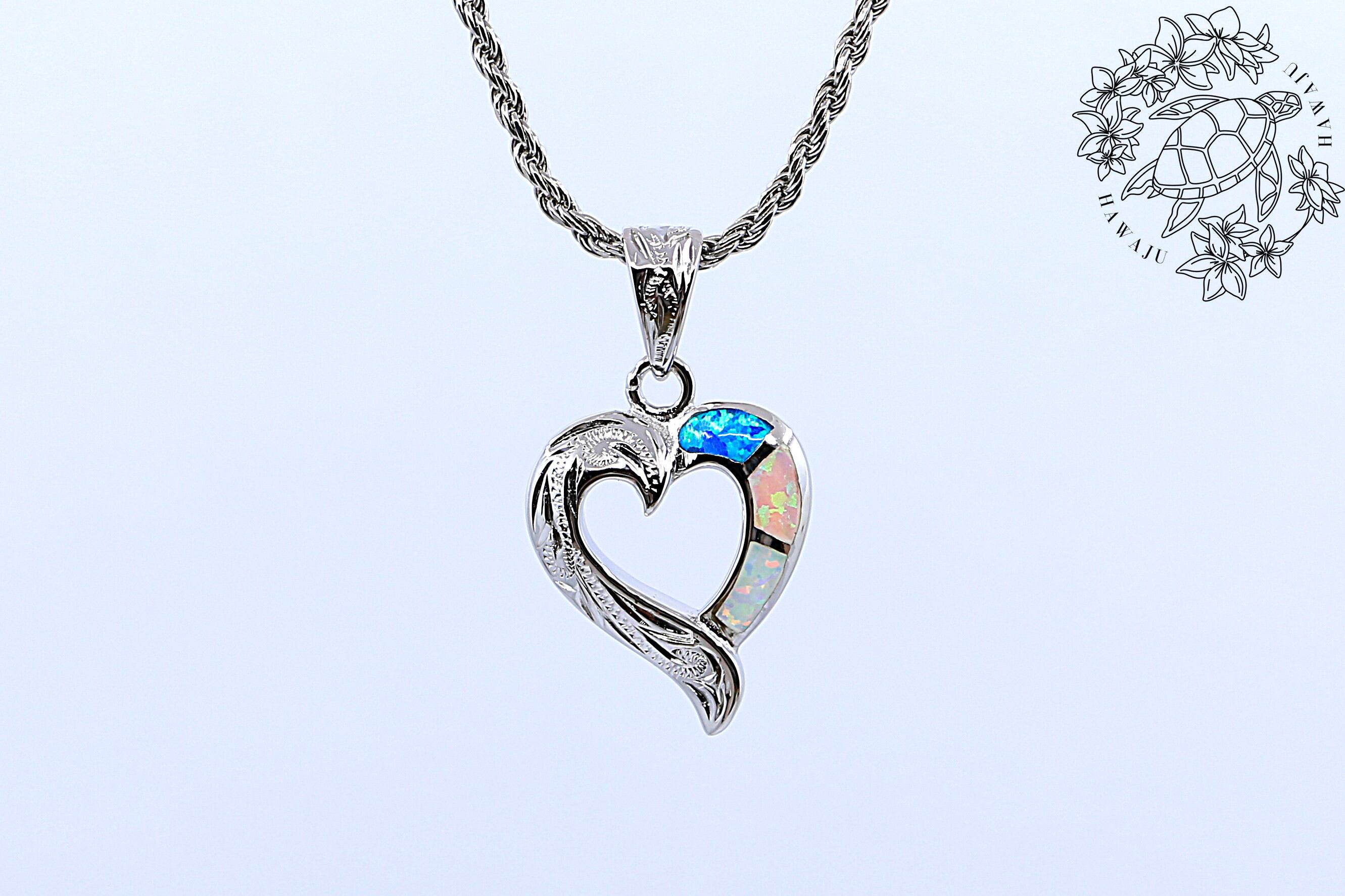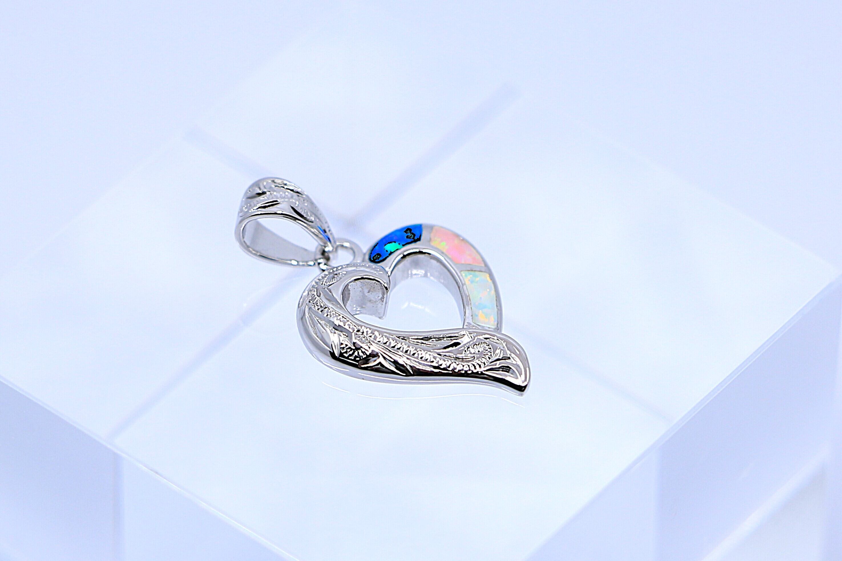 やわらかで優美な曲線のハートの中に、レインボーオパールがインレイ加工され、伝統的なスクロール(波)模様やプルメリアなどの彫りが施さています。上品でありながらしっかりと存在感のあるデザインに仕上がっています。