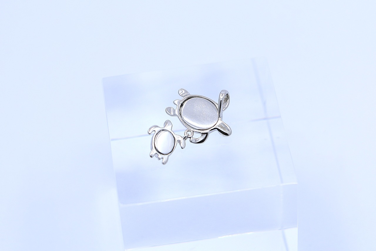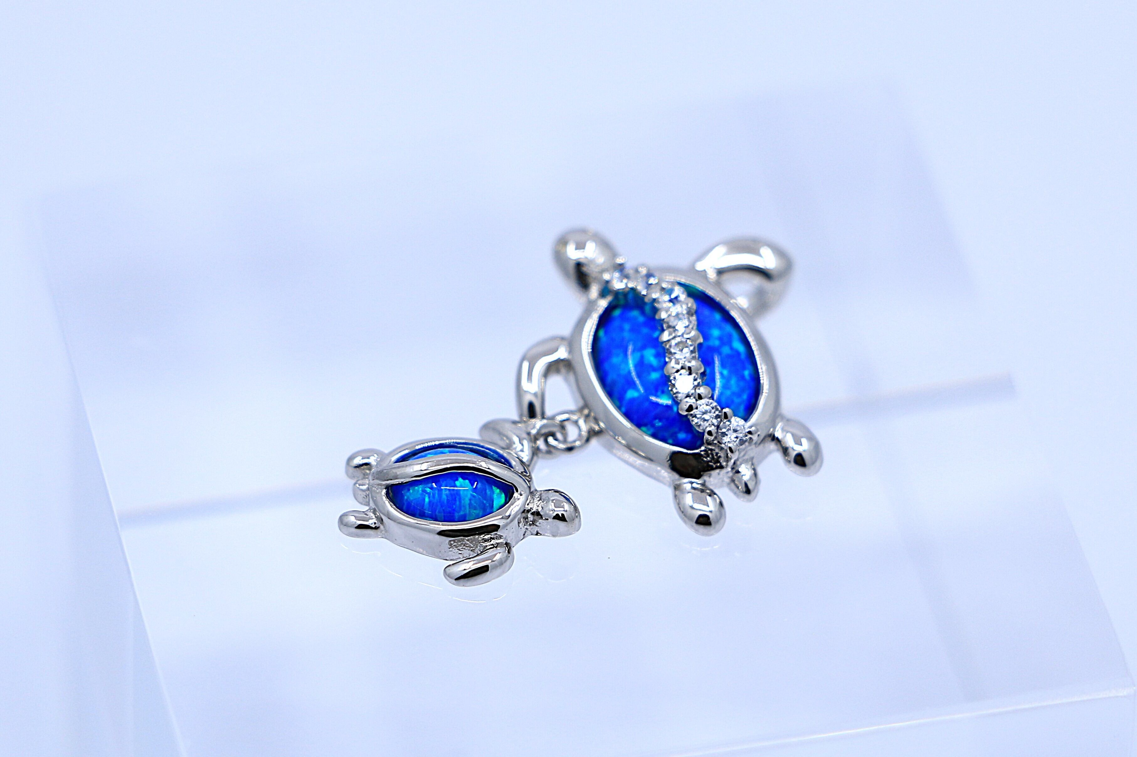 南国の海を連想させる幻想的なブルーオパールを甲羅にインレイし、親亀の甲羅には波のように流れるキュービックジルコニアが美しい輝きを添えます。