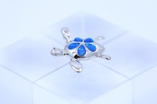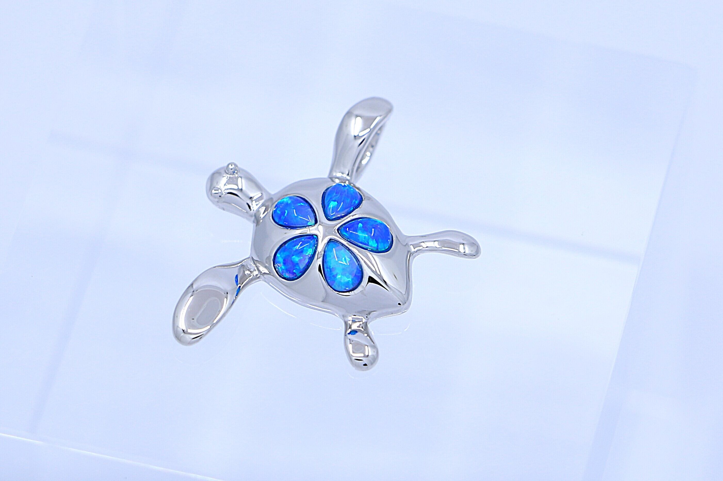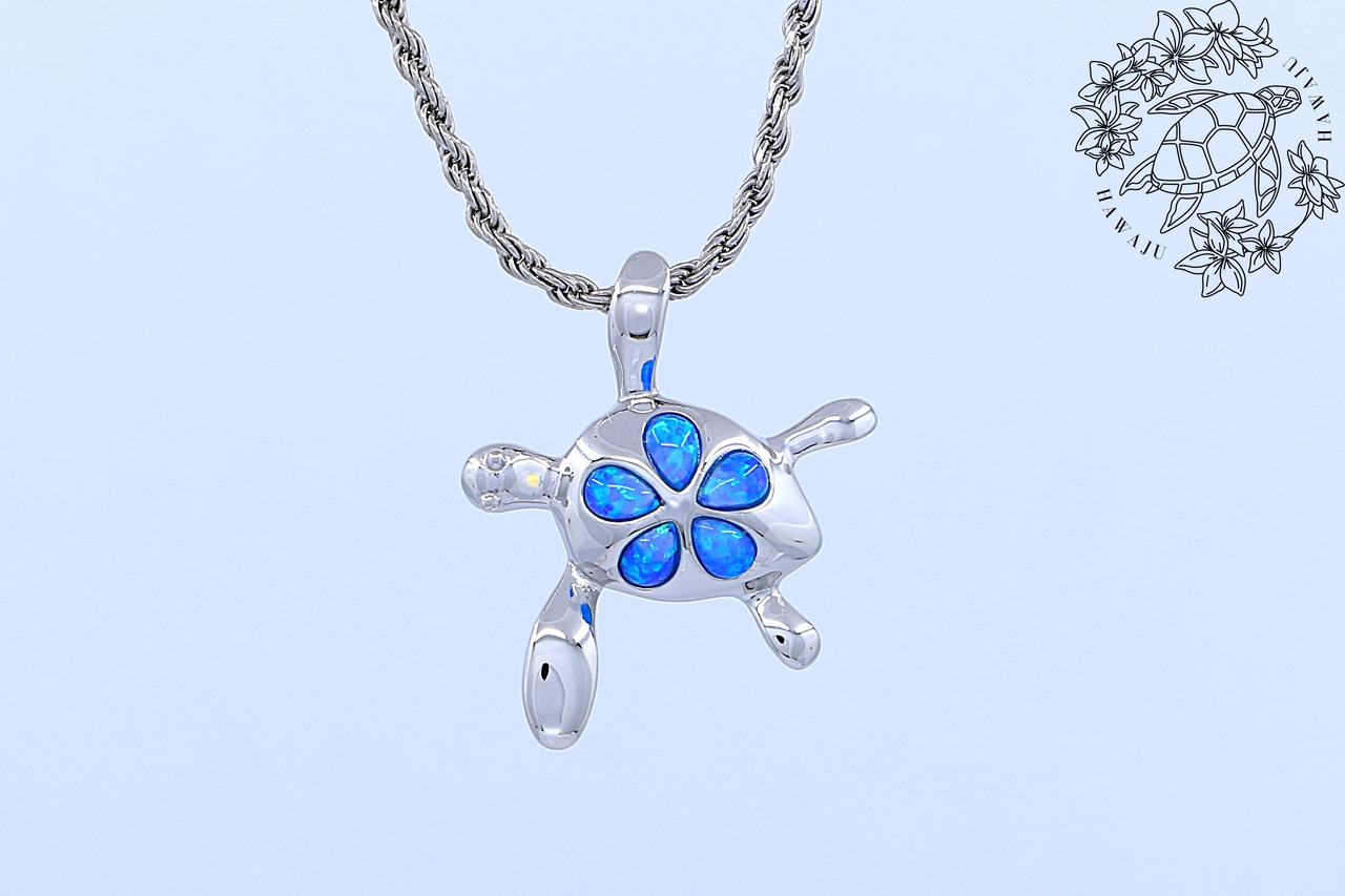 ホヌの甲羅部分には花のように配置されたブルーオパールが、光の角度によって幻想的に輝き、胸元を華やかに彩ります。