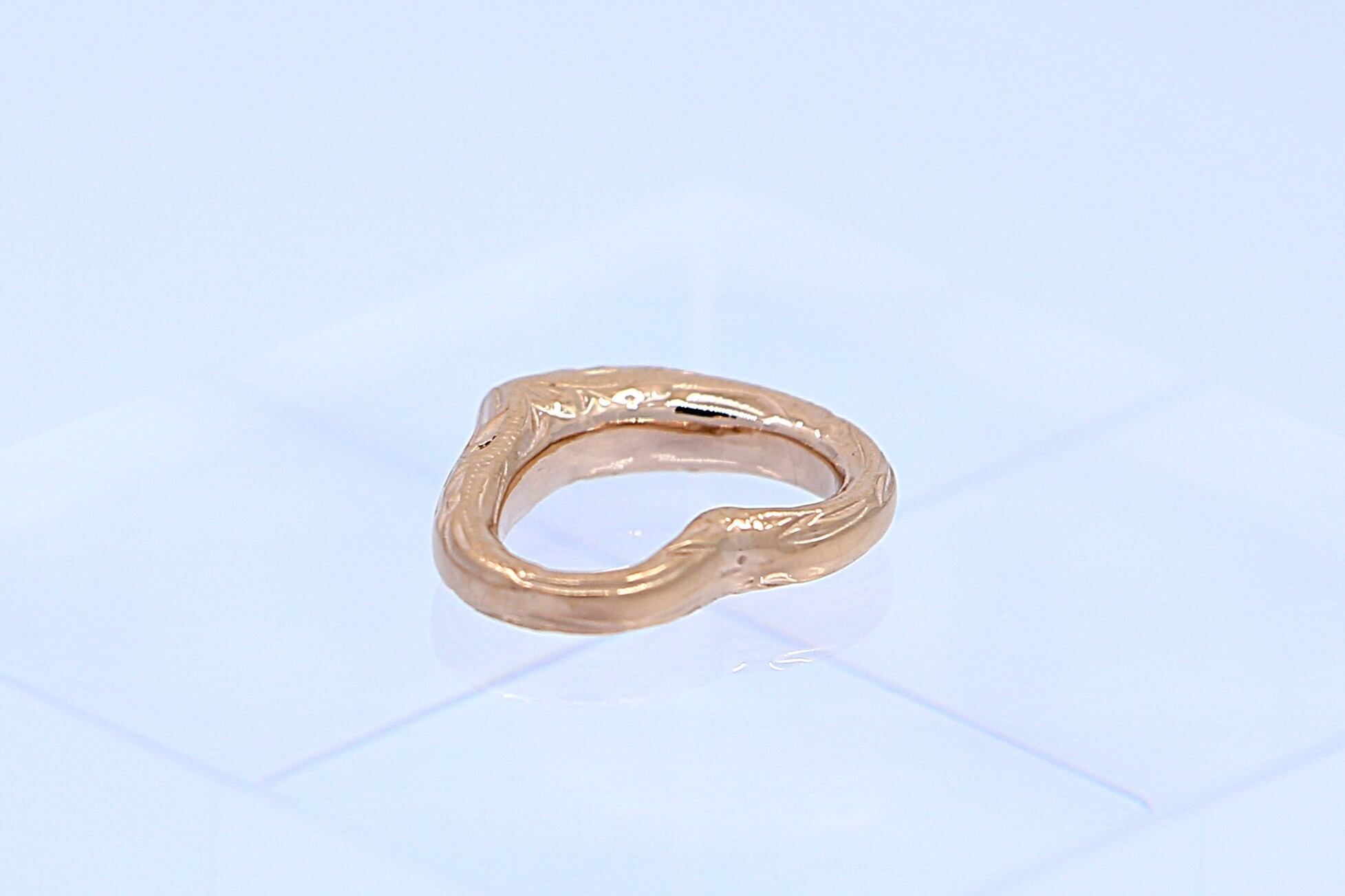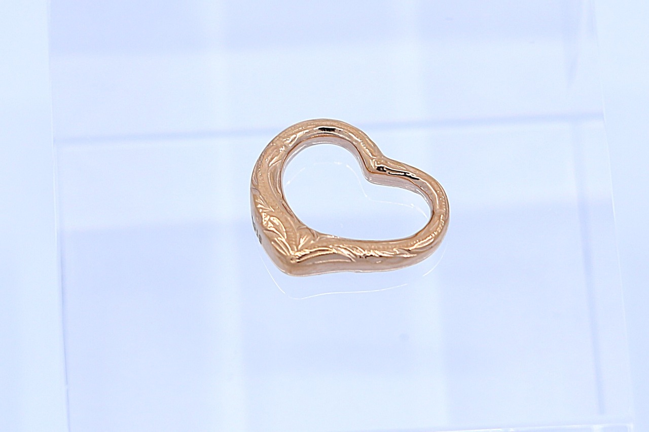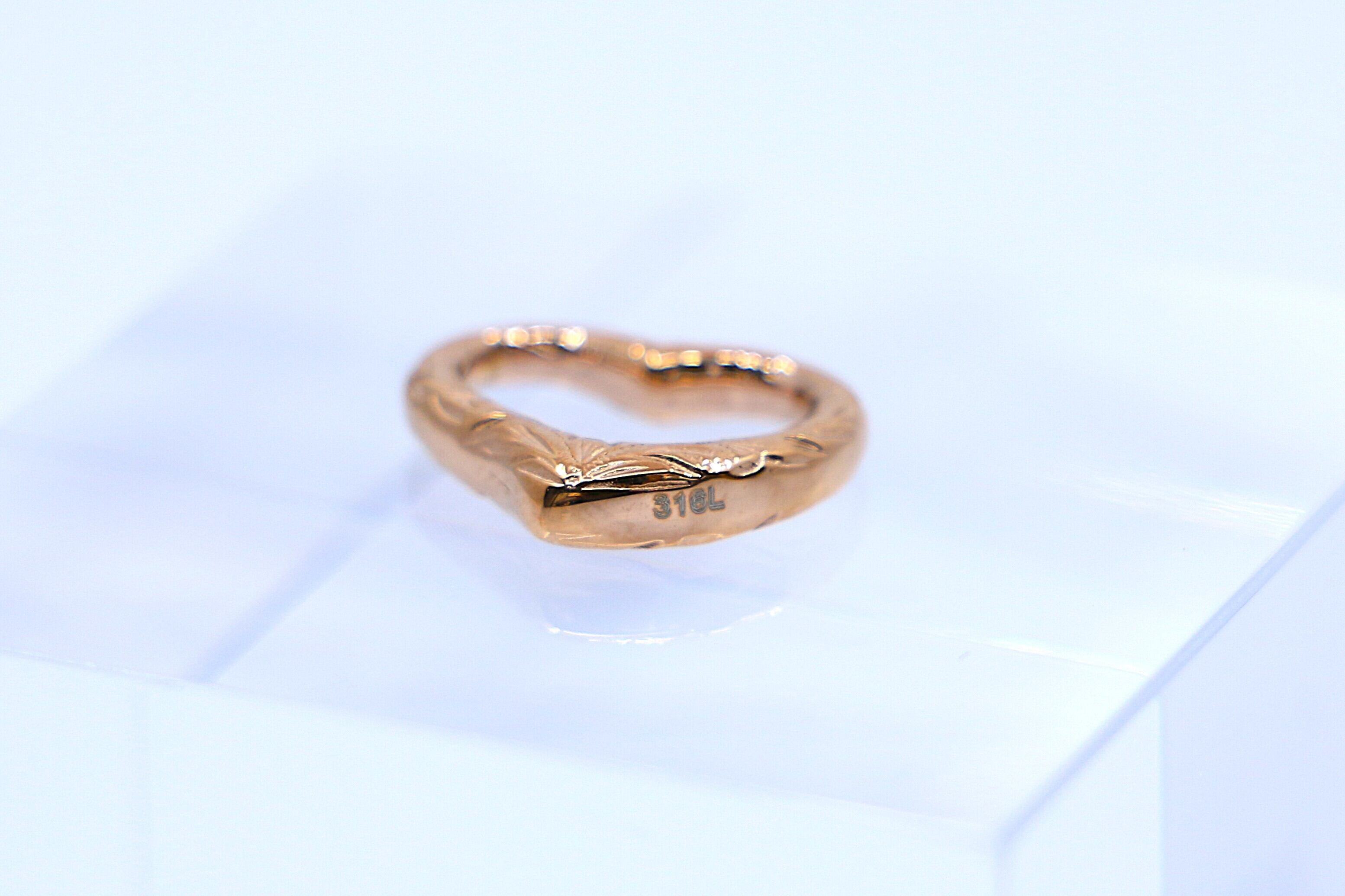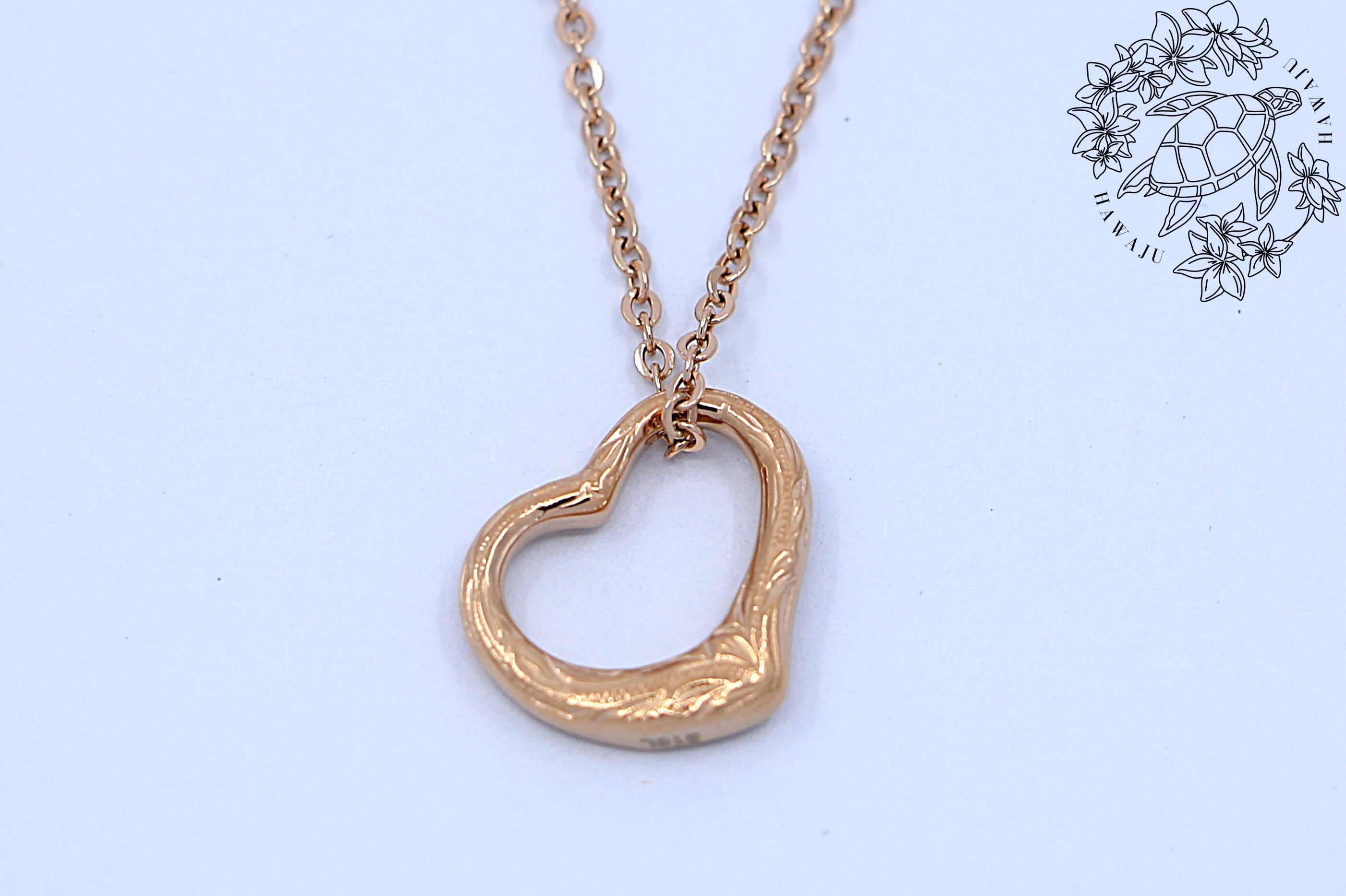 やわらかで優美な曲線のハートモチーフに、伝統的なスクロール(波)模様やプルメリアなどの彫りが施さており、上品でありながらしっかりと存在感のあるデザインに仕上がっています。温かみのあるピンクゴールドの輝きも特徴です。サージカルステンレス製で、アレルギー対応のため、デリケートな肌の方でも安心してご使用いただけます。ハワイアンジュエリーのエッセンスを感じさせるこのアイテムは、どんなスタイルにもぴったりな、特別な存在感を放ちます。