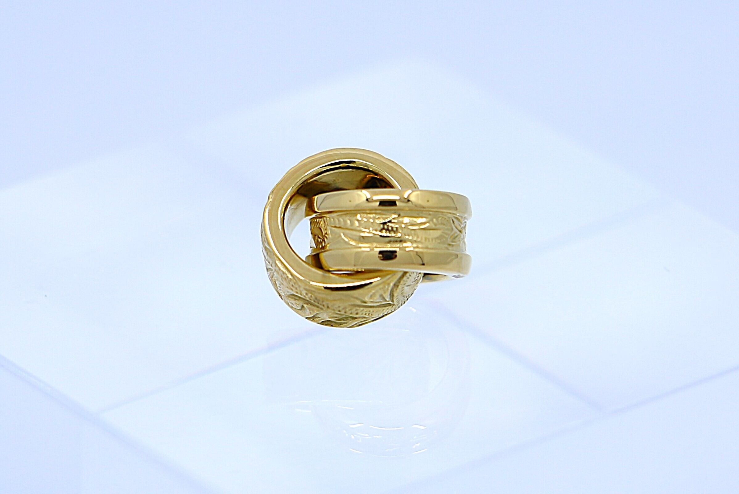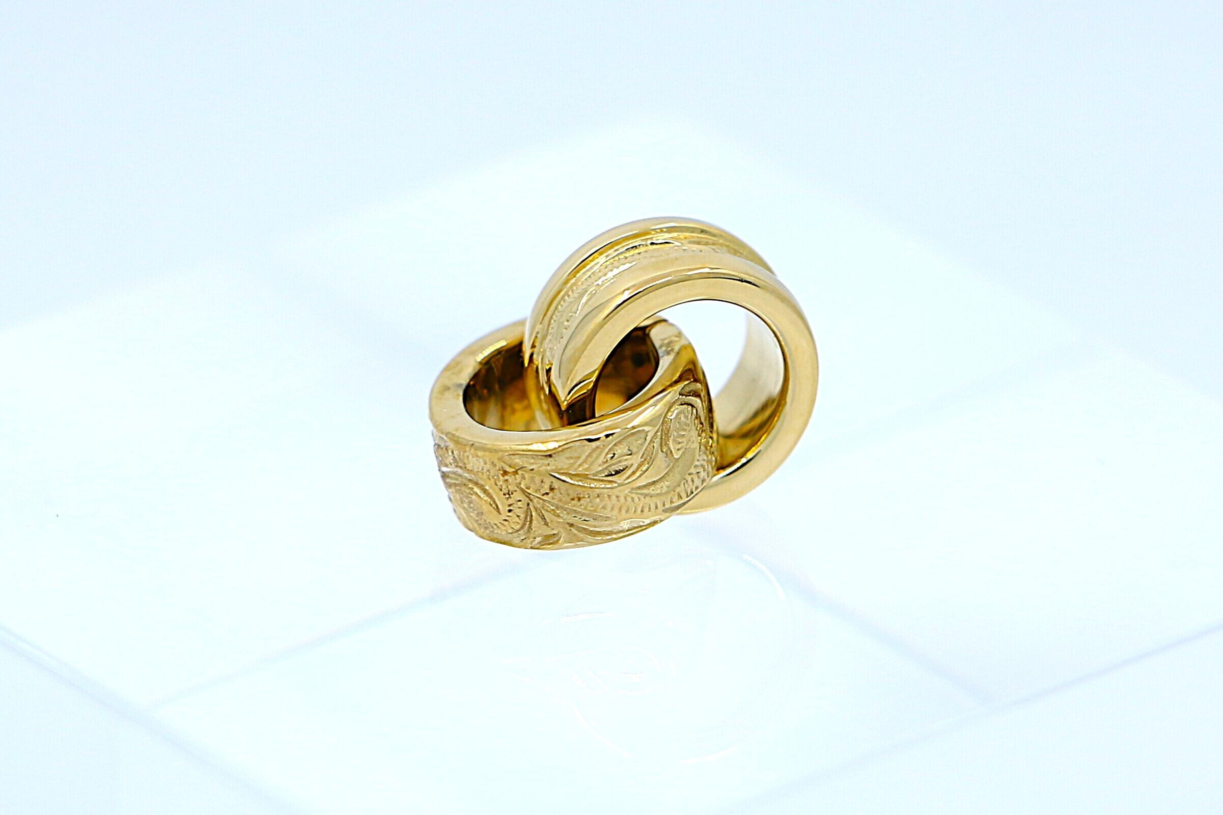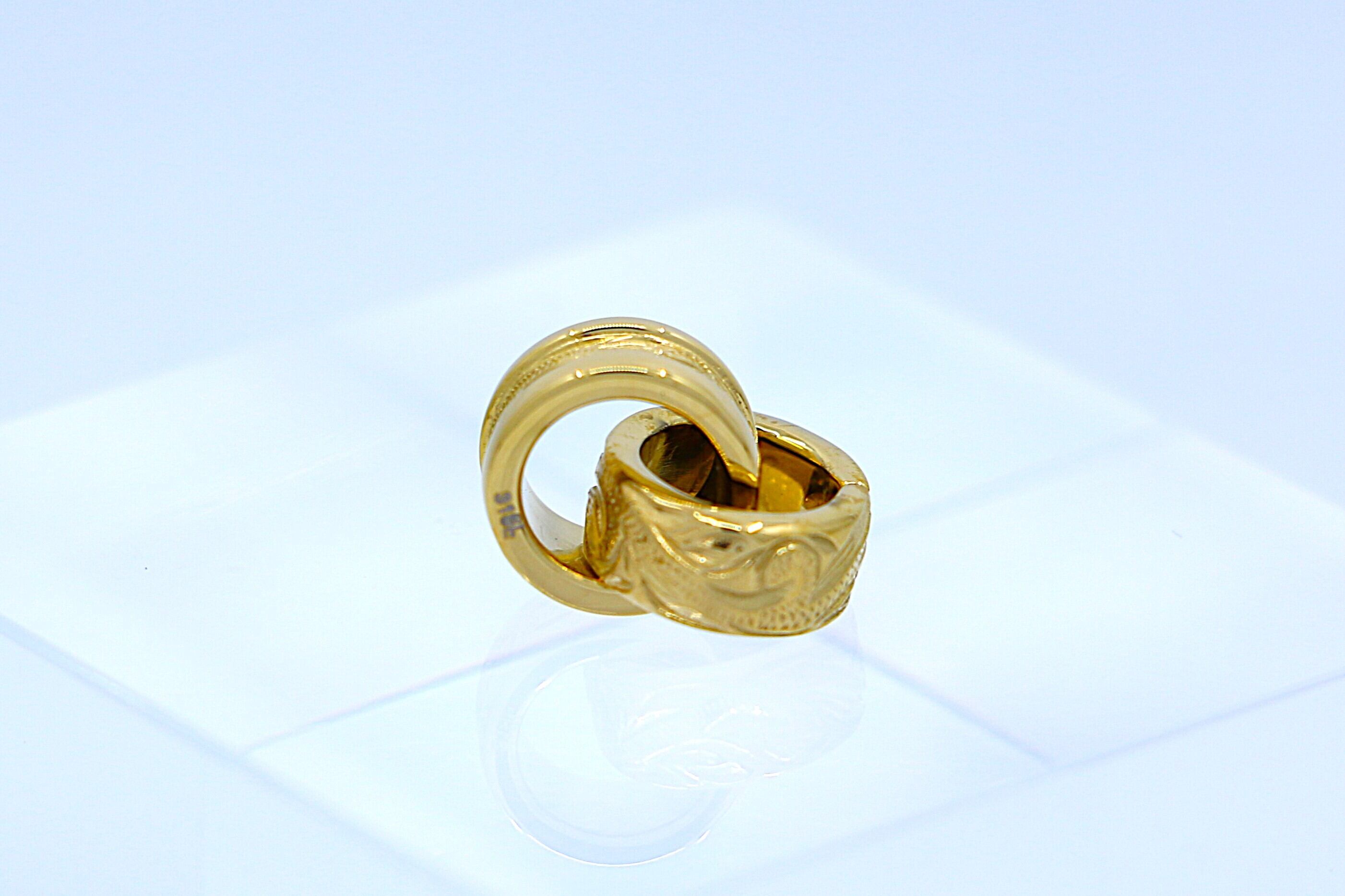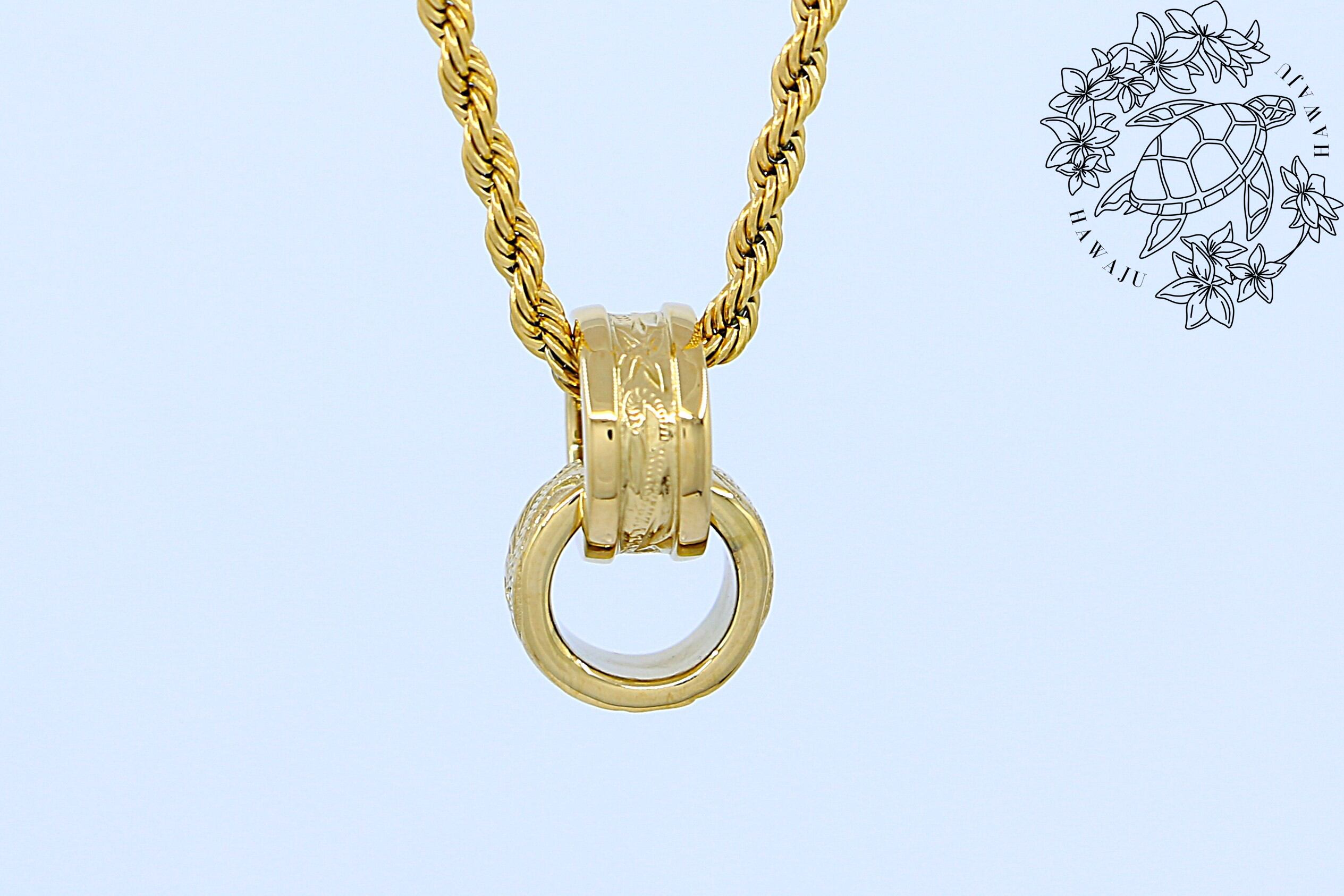美しいハワイアンの伝統柄「スクロール(波模様)」が繊細に彫り込まれた、イエローゴールドカラーの2連ペンダントトップ。リング状の2つのトップが重なり合い、動くたびに胸元でやさしく揺れて輝きます。