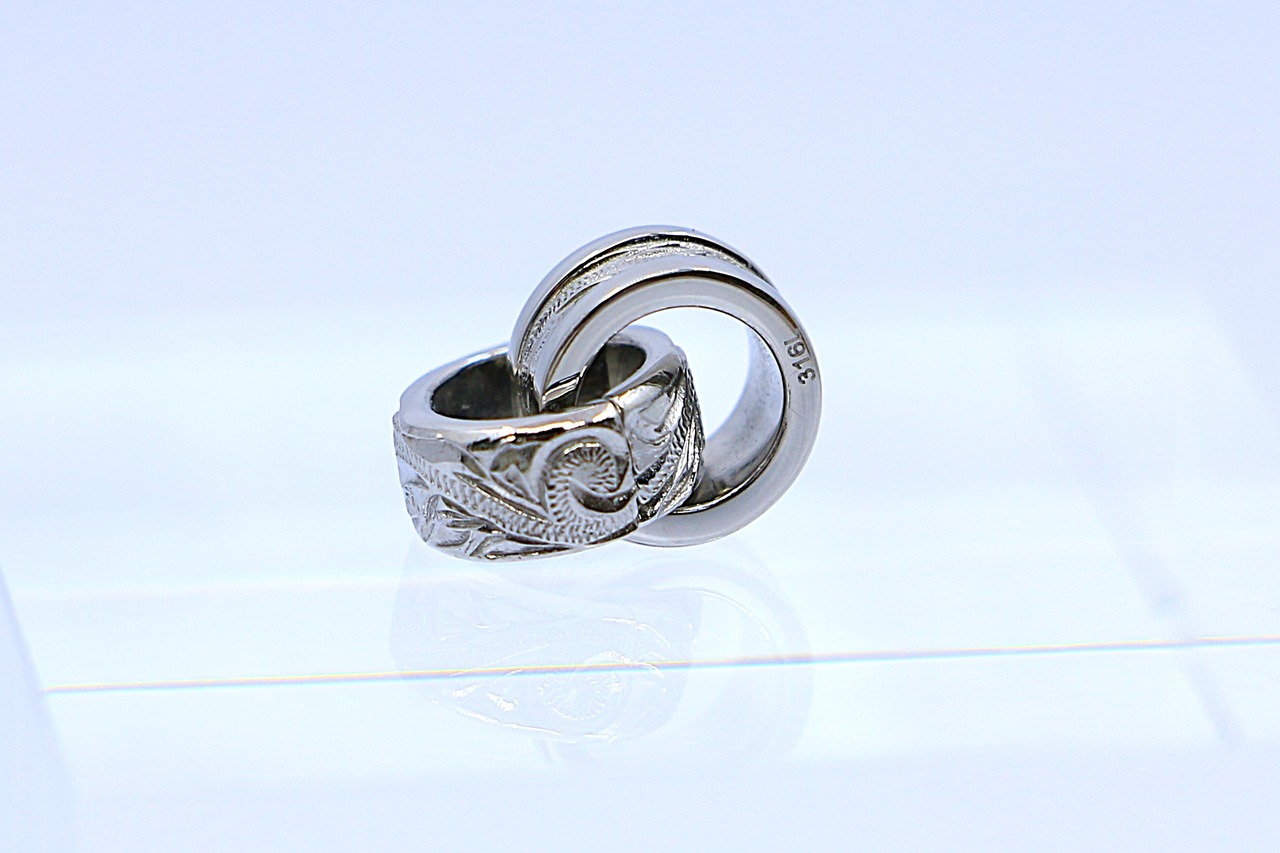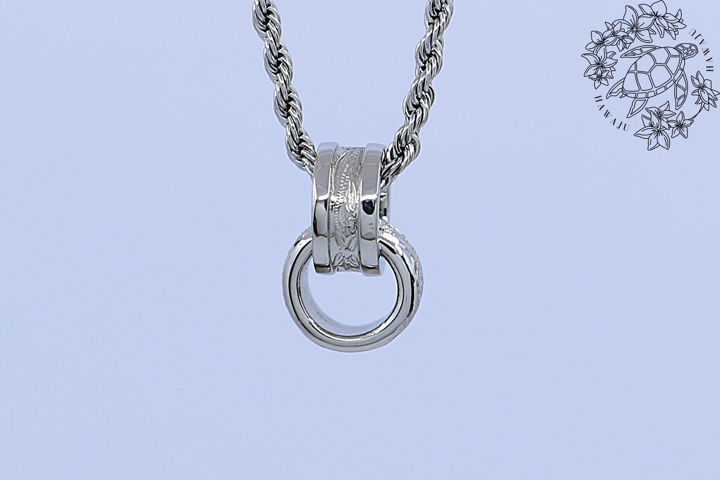 美しいハワイアンの伝統柄「スクロール(波模様)」が繊細に彫り込まれた、シルバーカラーの2連ペンダントトップ。リング状の2つのトップが重なり合い、動くたびに胸元でやさしく揺れて輝きます。
