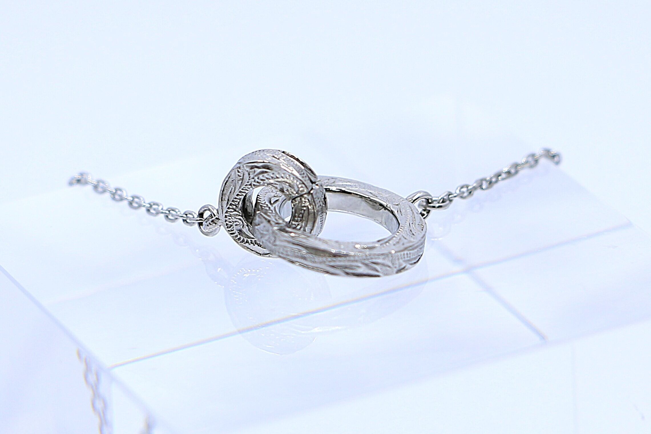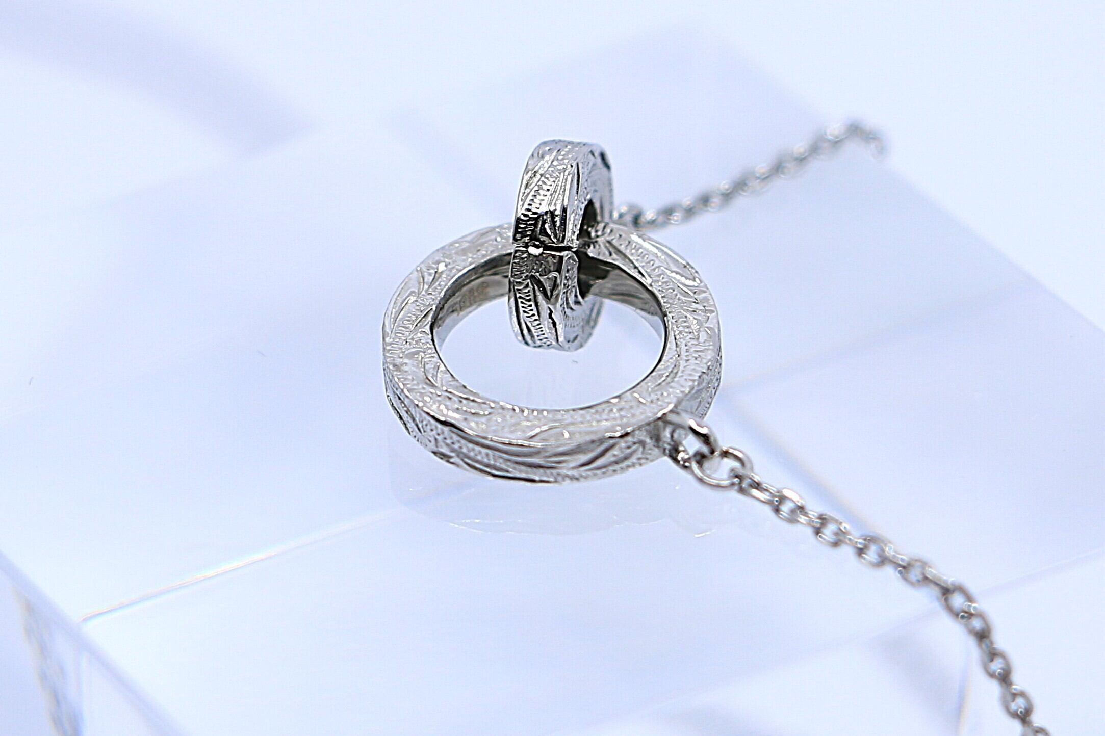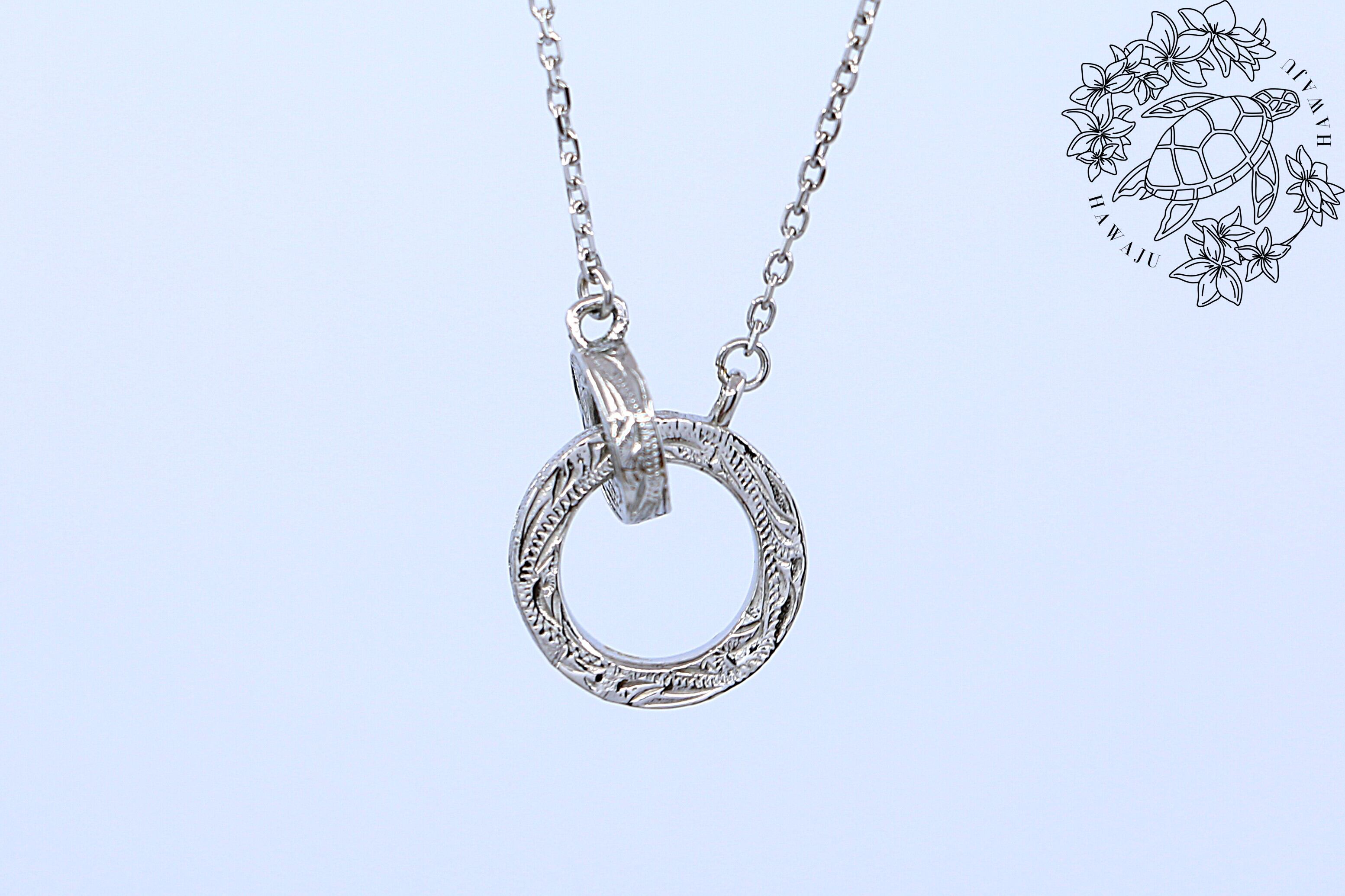 ハワイの伝統的な彫り模様「スクロール(波模様)」が丁寧に施された、リング型の2連ペンダントトップ。