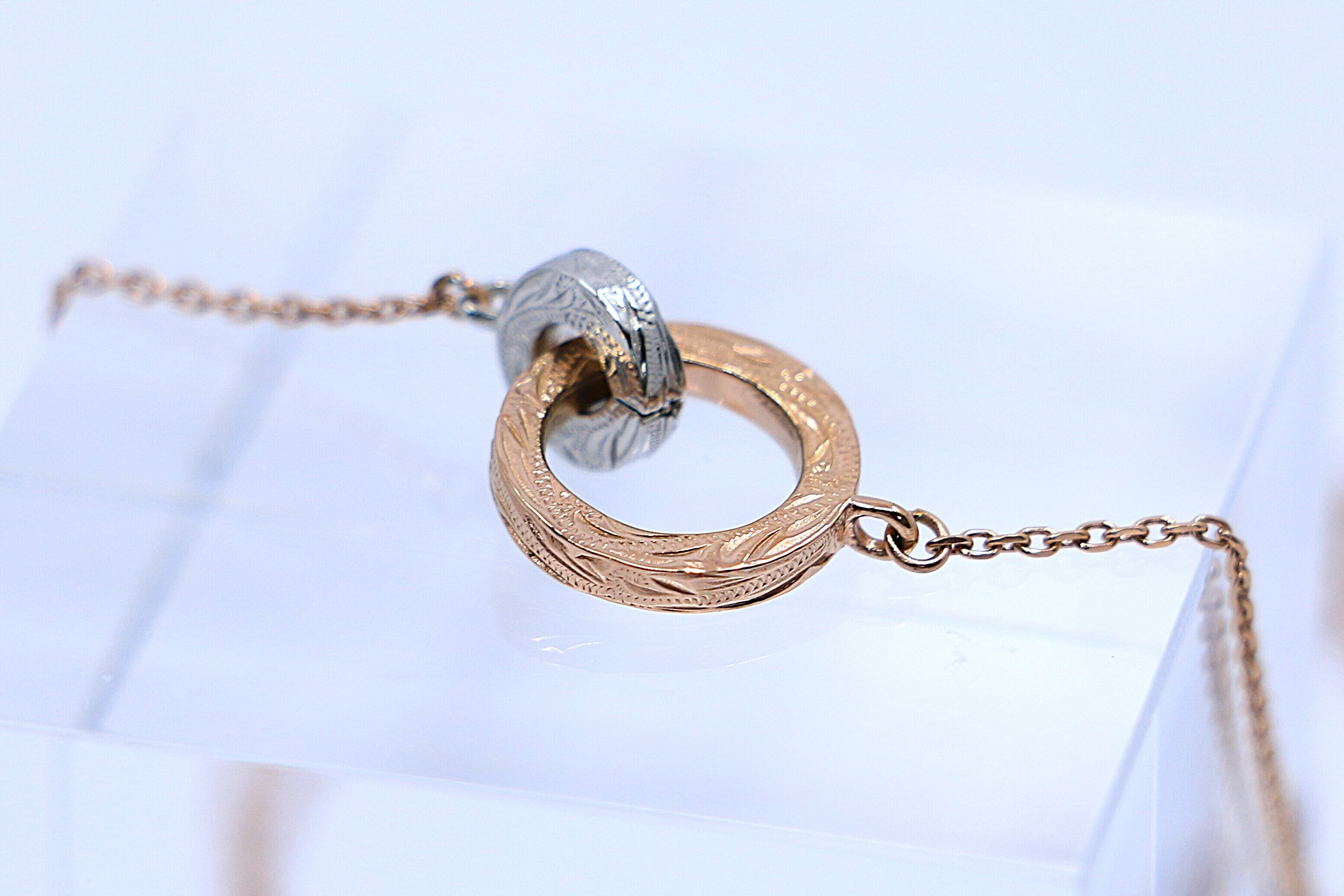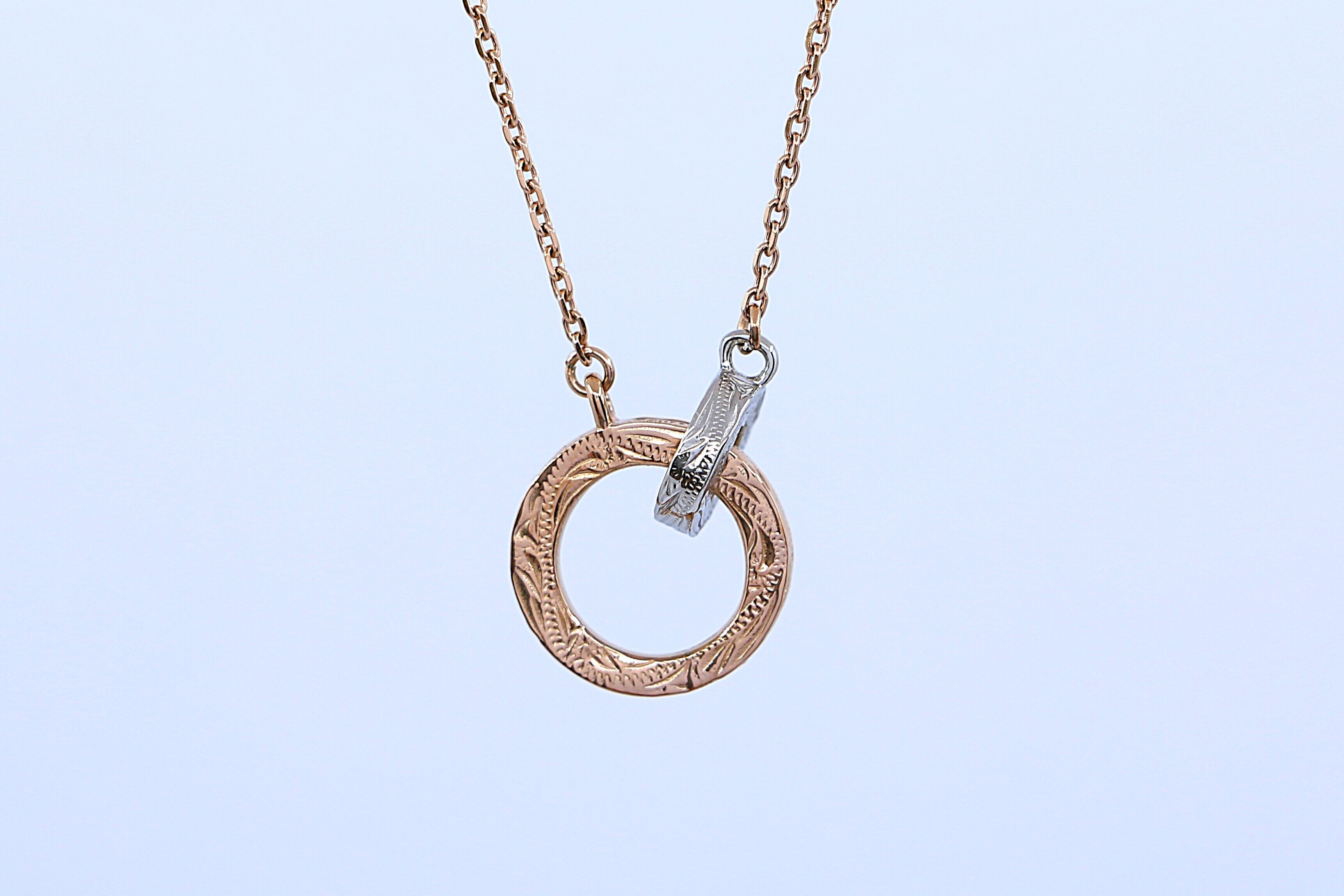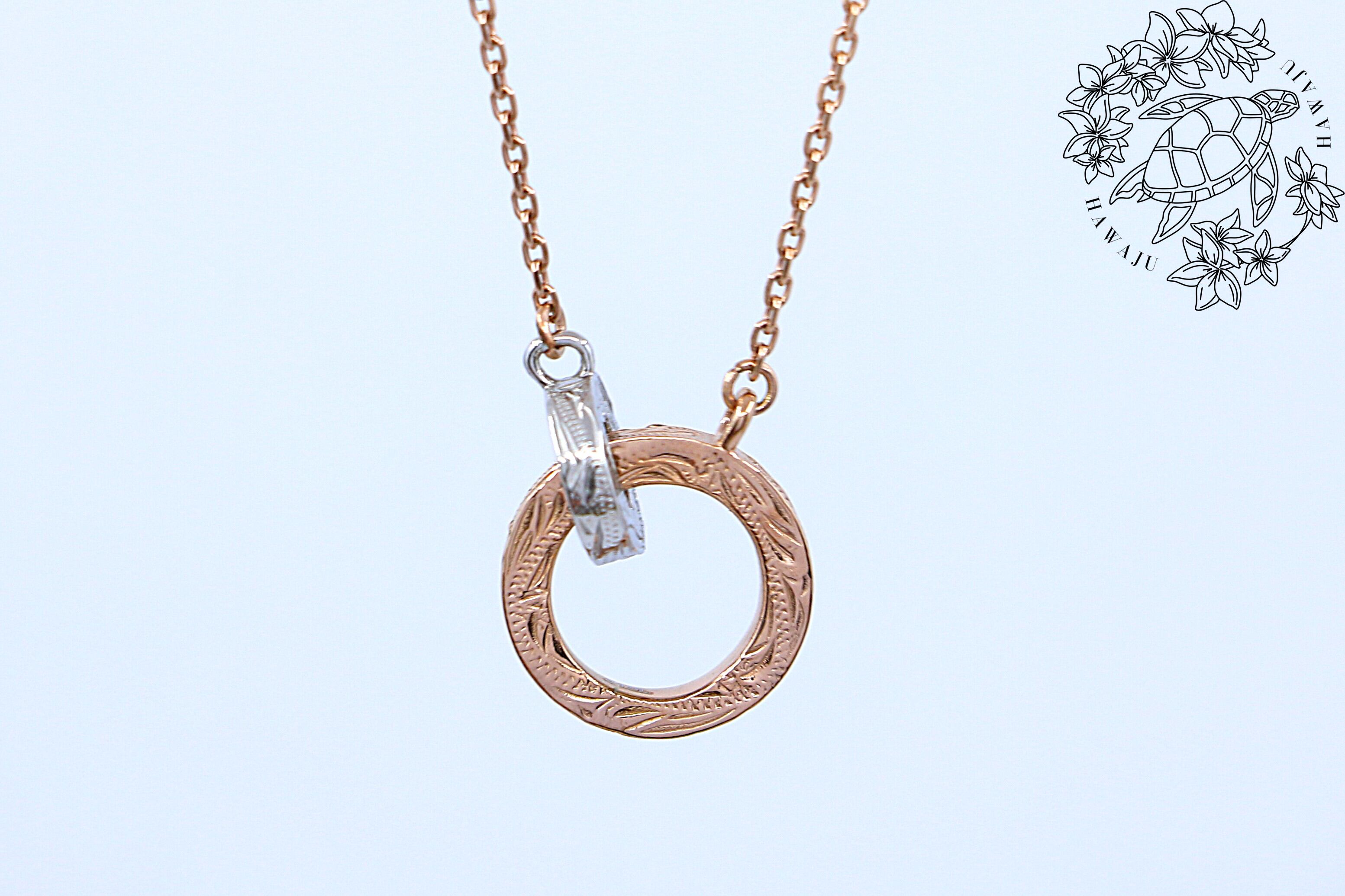 ハワイの伝統的な彫り模様「スクロール(波模様)」が丁寧に施された、リング型の2連ペンダントトップ。