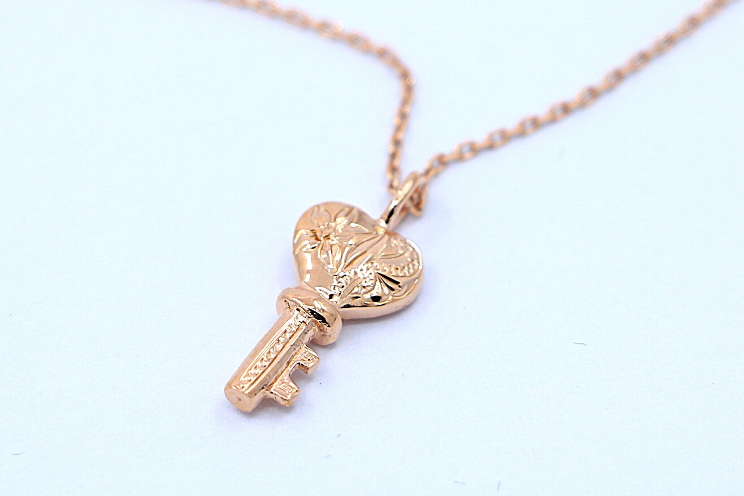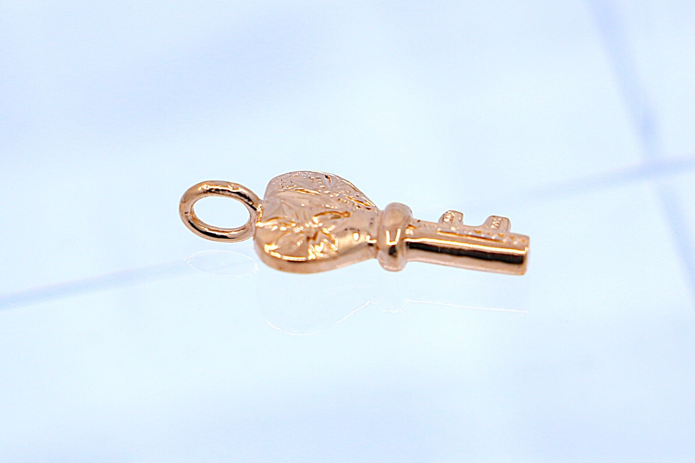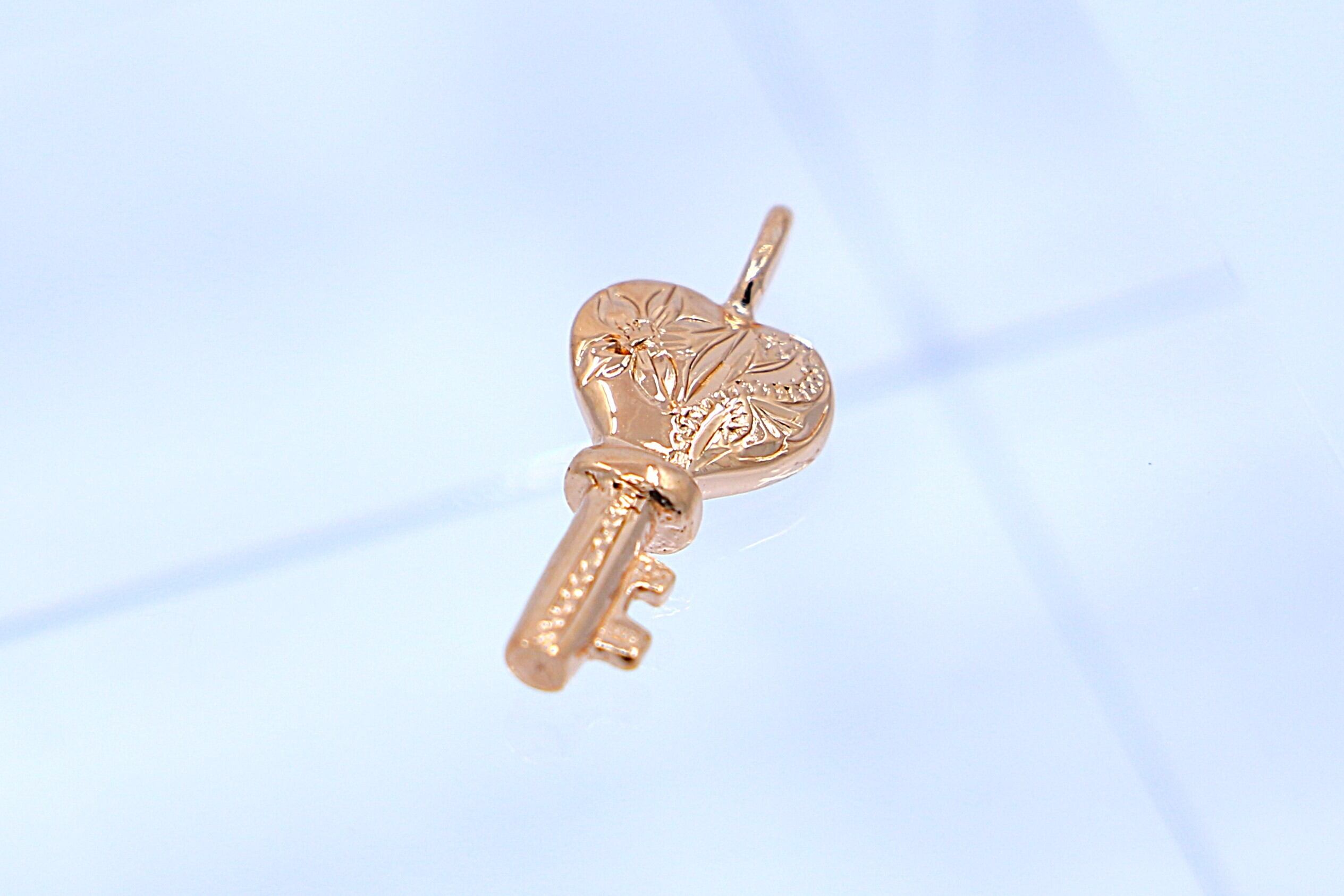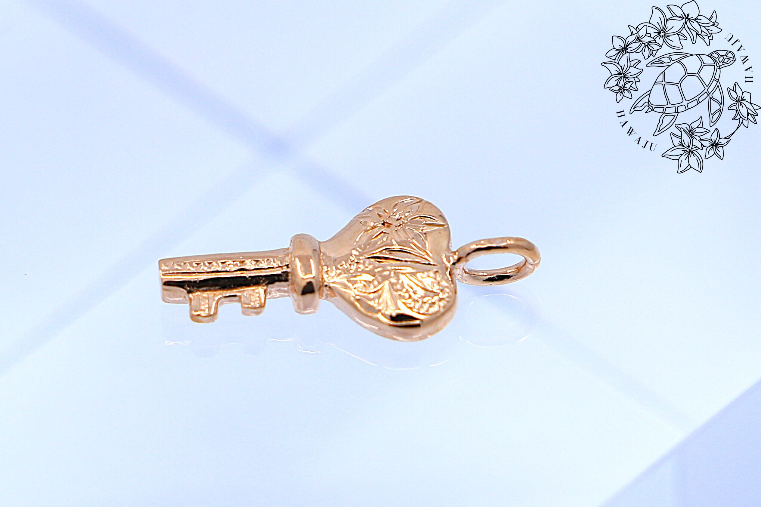 伝統的なハワイアン模様が細やかに刻まれた、ピンクゴールドのキーモチーフチャームです。