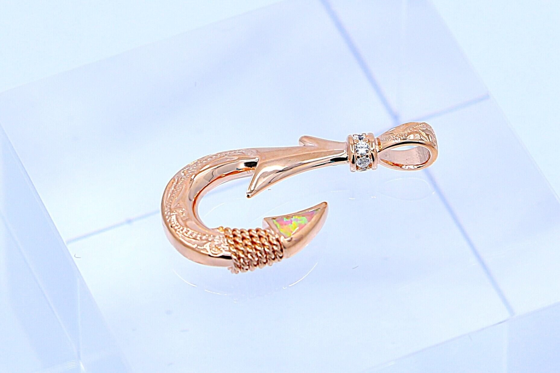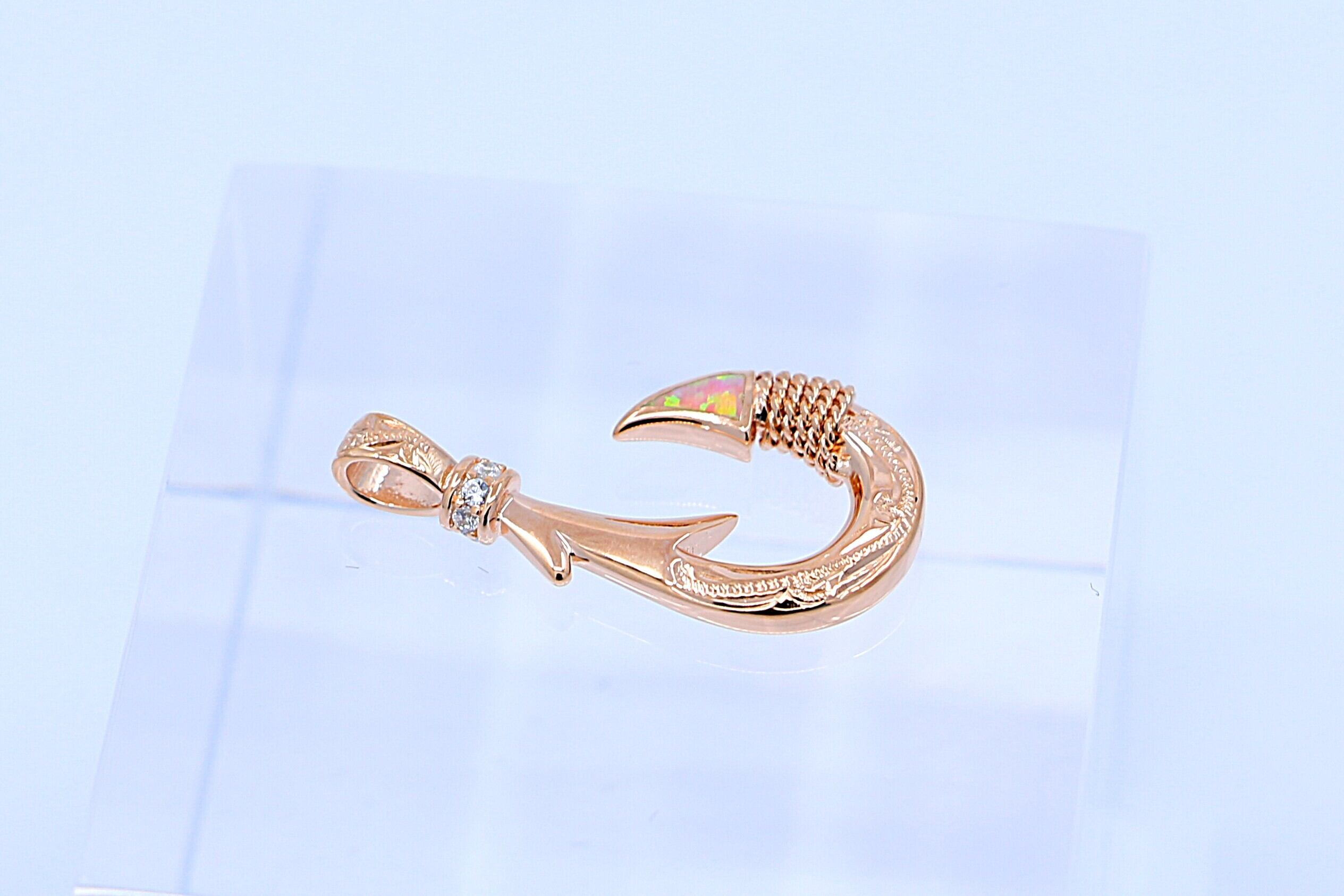 このペンダントトップは、ハワイアンジュエリーの象徴的なデザインであるフィッシュフック(釣り針)をモチーフにした、大きめサイズで存在感のあるピンクゴールドカラーのジュエリーです。